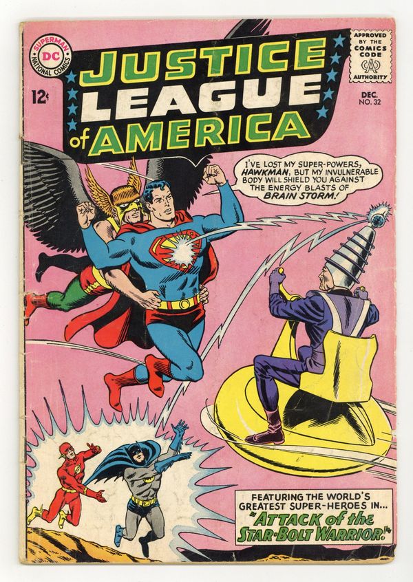 Cover pencils by Mike Sekowsky, inks by Murphy Anderson. Attack of the Star-Bolt Warrior!, script by Gardner Fox, pencils by Mike Sekowsky, inks by Bernard Sachs; Brain Storm gathers the JLA as witnesses to his execution of Green Lantern for the murder of his brother. 36 pgs. $0.12. Cover price $0.12.