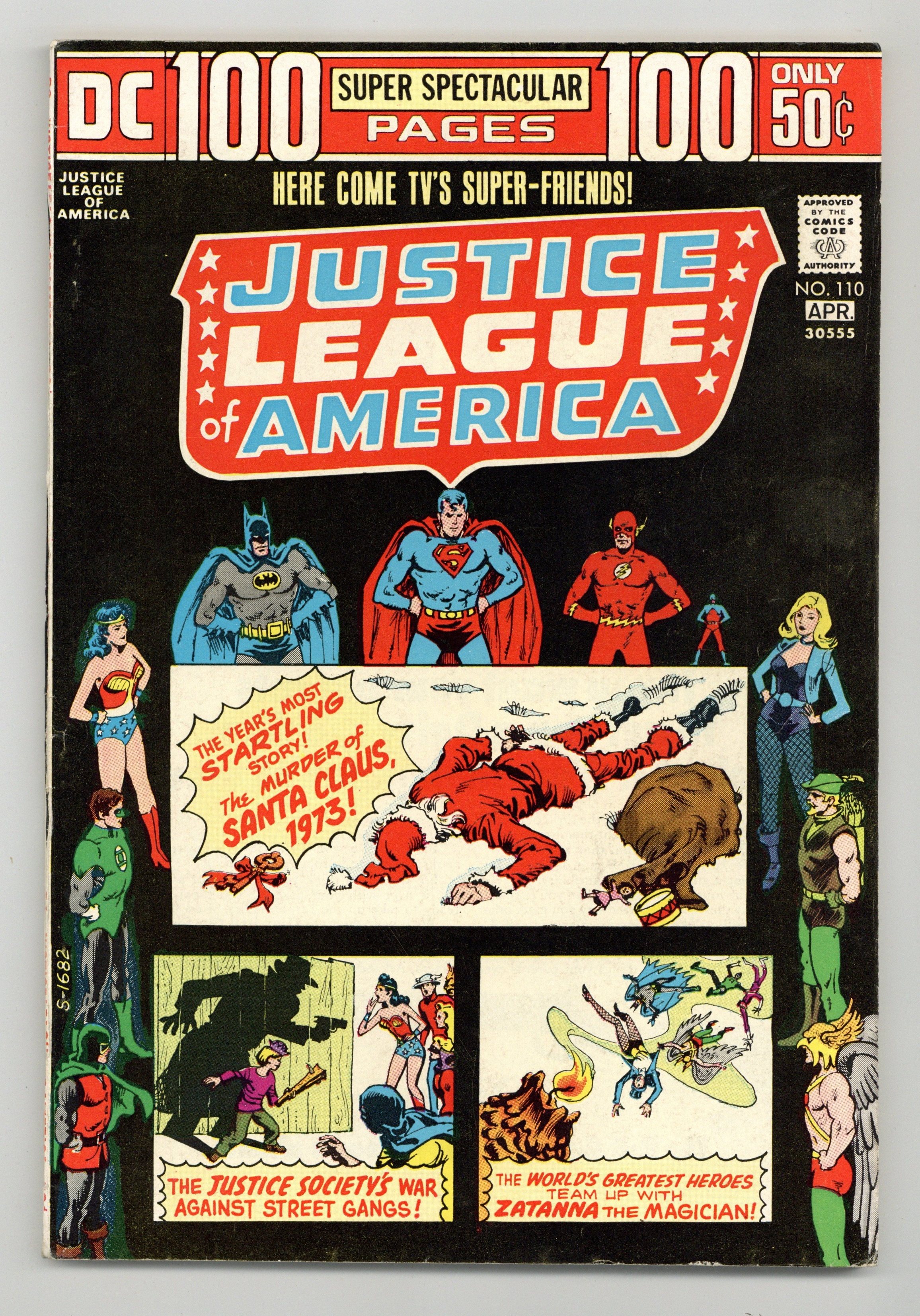 100-page giant issue. Cover art by Nick Cardy. The Man Who Murdered Santa Claus!, script by Len Wein, pencils by Dick Dillin, inks by Dick Giordano; The murder of a department store Santa Claus puts the JLA on the tail of the Key and his scheme to kill the JLA. The Plight of a Nation! starring the Justice Society of America, script by John Broome, pencils by Arthur Peddy and Carmine Infantino (splash), inks by Bernard Sachs and Frank Giacoia (splash); juvenile delinquency story. Z--as in Zatanna--and Zero Hour! starring the Justice League, script by Gardner Fox, pencils by Mike Sekowsky, inks by Sid Greene; Zatanna ends her quest to find Zatara. 100 pgs. $0.60. Cover price $0.50.