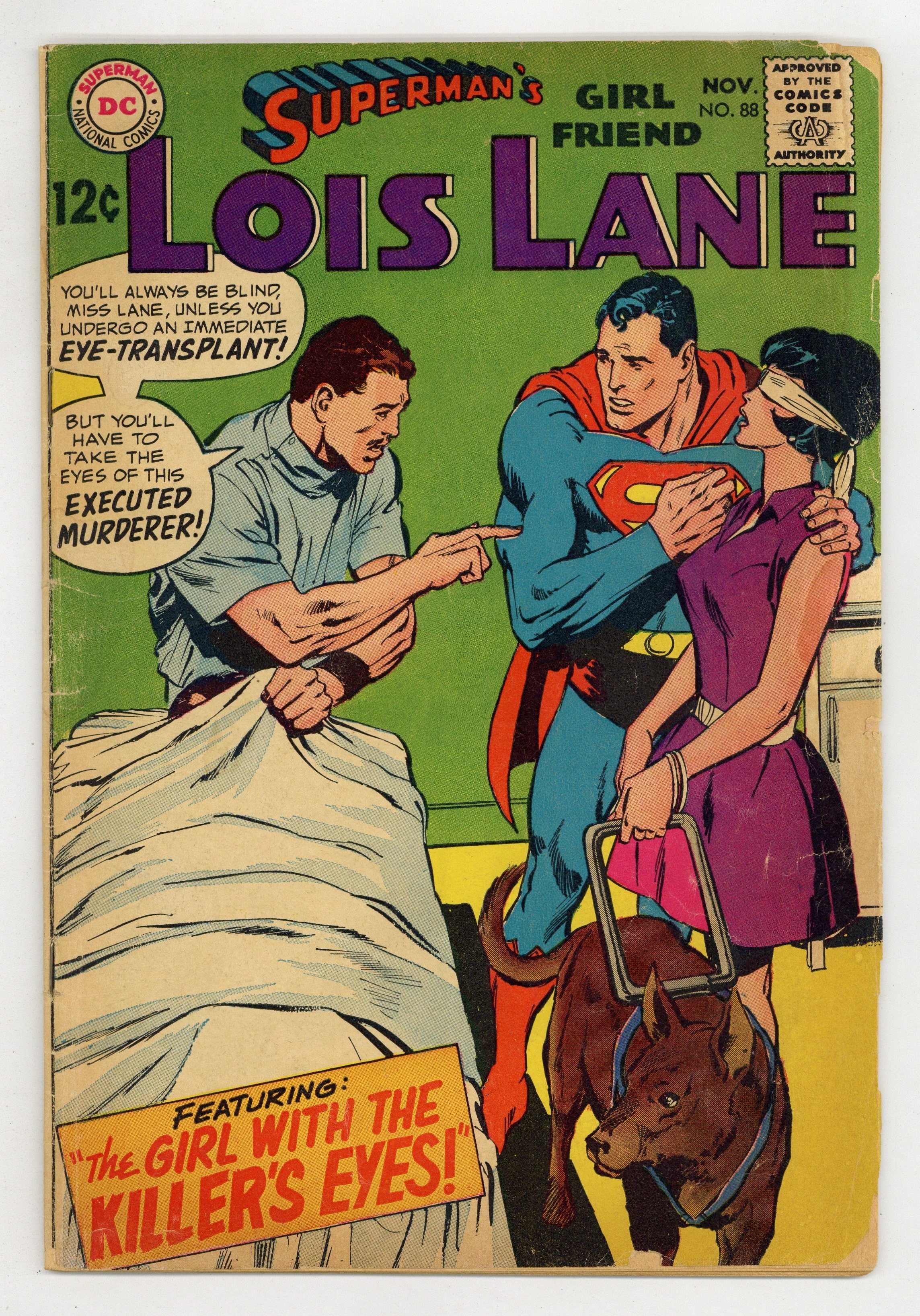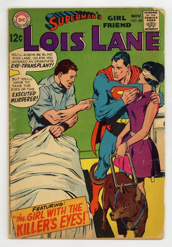 Cover art by Neal Adams. Through a Murderer's Eyes!, script by Leo Dorfman, pencils by Irv Novick, inks by Mike Esposito; A plot to discredit Lois on the witness stand has her believing that she has had a corneal transplant from a prison inmate, and that she is now seeing visions of his murder victims. House ad for Wonder Woman #179. The Perfect Husband!, script by Robert Bernstein, art by Kurt Schaffenberger; On the television show "People are Whacky," a computer selects sportsman Roger Warner, a Clark Kent look-alike, to be Lois' ideal husband. House ad for Detective Comics #381. Jack Davis art in a full-page ad for Tiger Paws bicycle tires, "The Adventures of Tigerboy." 36 Pages, Full Color. Cover price $0.12.