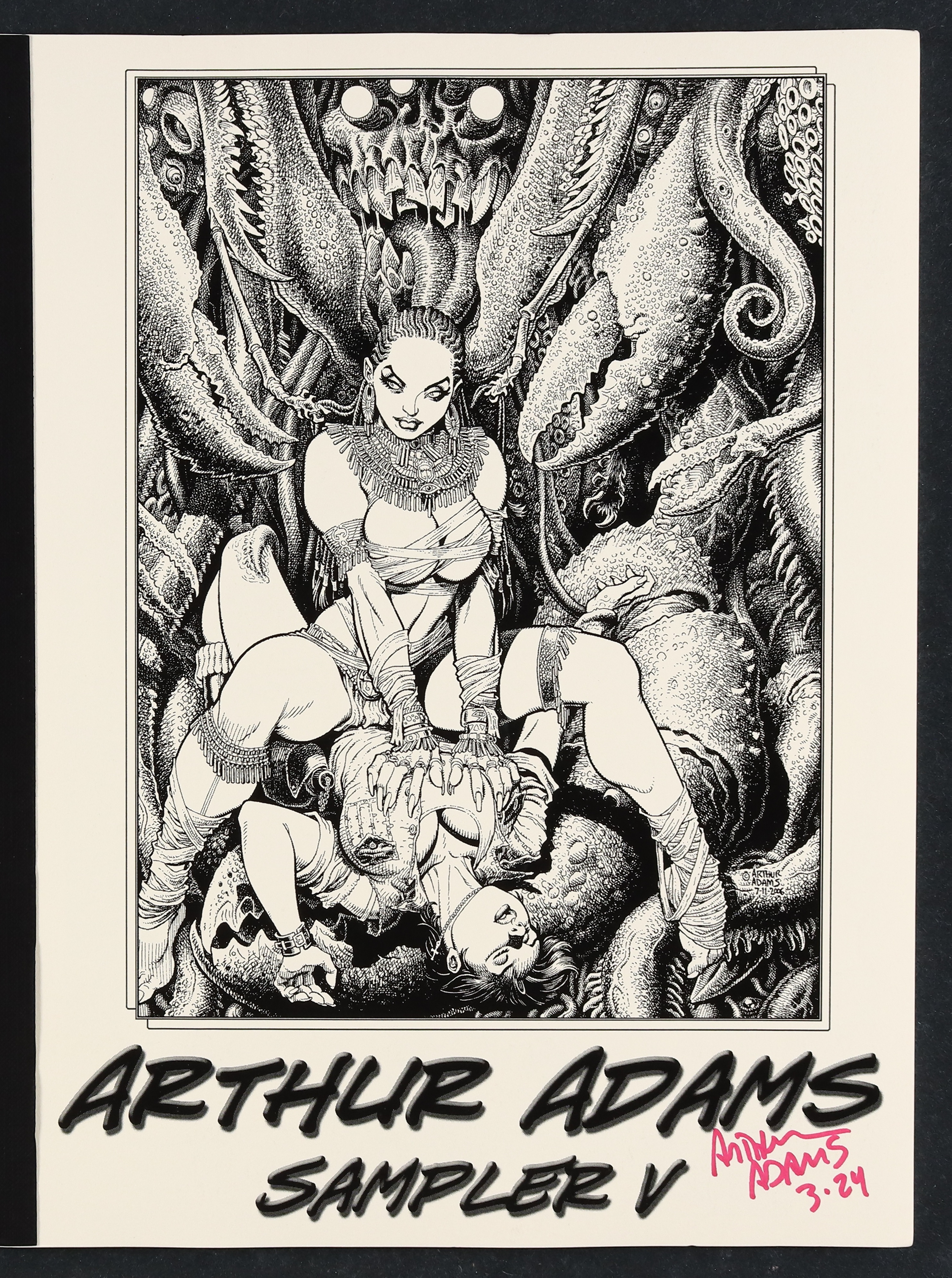 Volume 5 - "Arthur Adams Sampler V!" - Signed by Arthur Adams. Beautiful black and white commissions in Adams' inimitable exacting style. Original characters, DC and Marvel superheroes and more are featured. Softcover, 8 1/2-in. x 11-in., 50 pages, B&W.