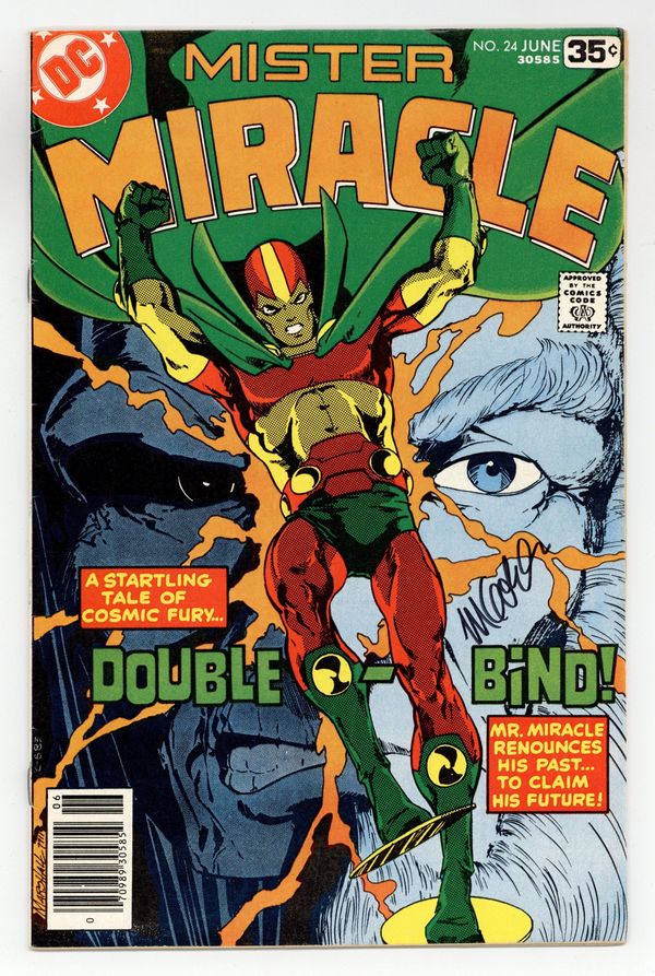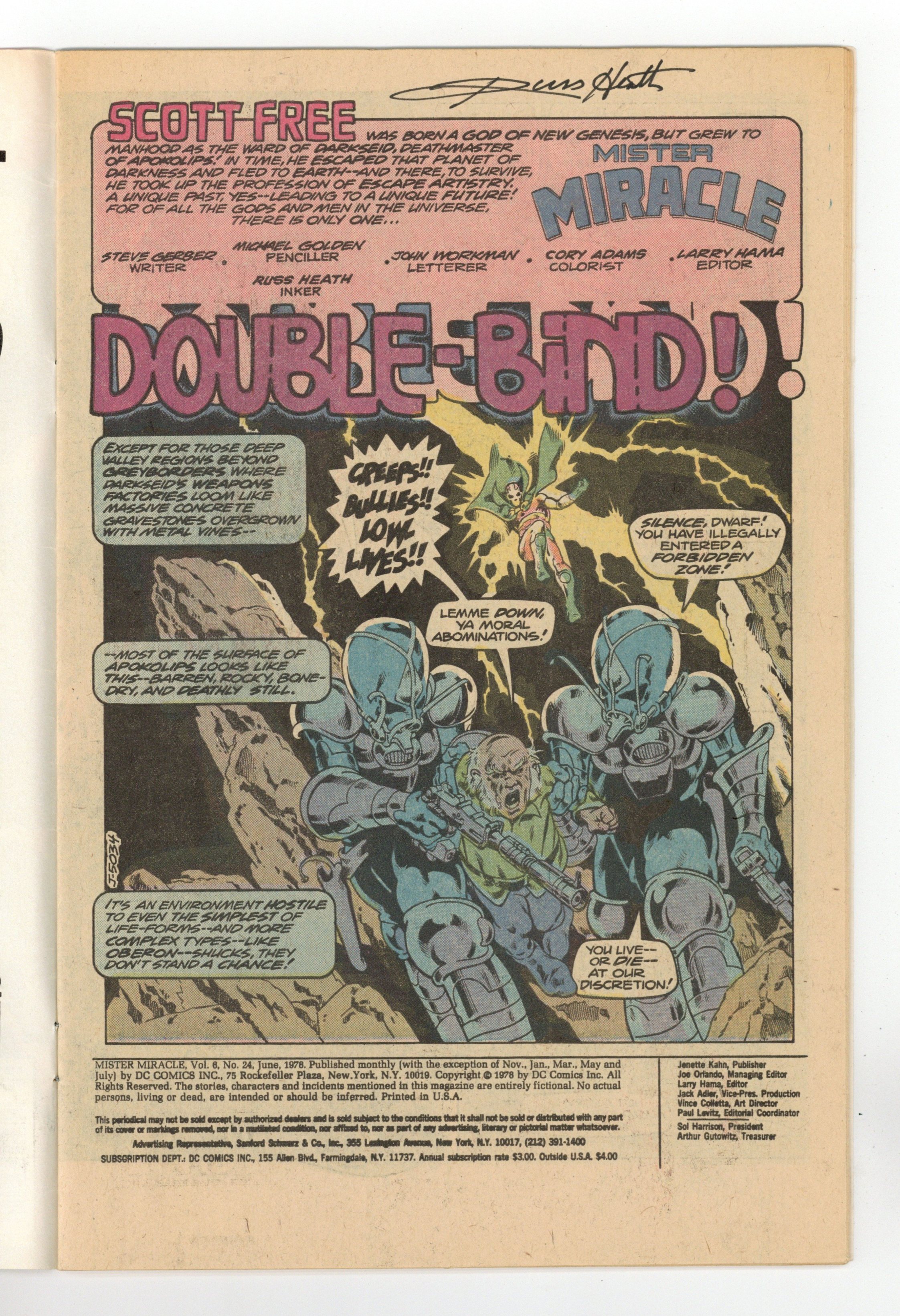 "Double Blind." Mister Miracle leaves New Genesis for Earth, where he preaches peace and ends up in Las Vegas. Script by Steve Gerber, pencils by Michael Golden, inks by Russ Heath. Cover by Marshall Rogers. Cover price $0.35.