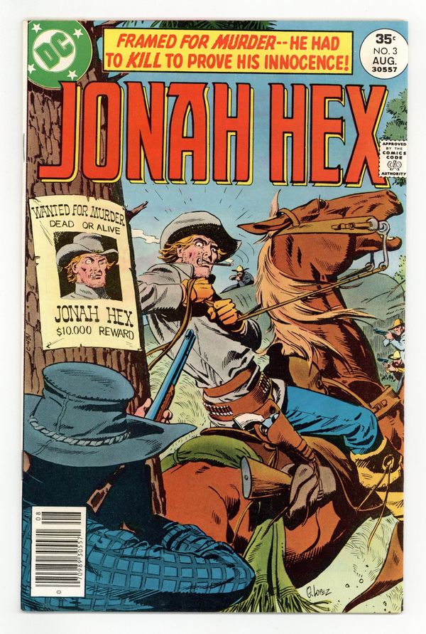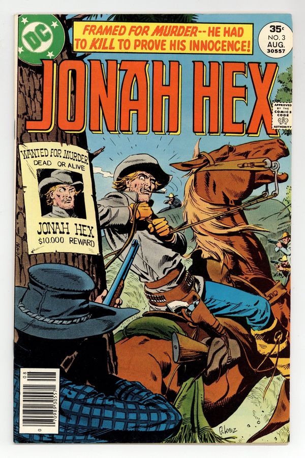 First 35c cover-priced issue. The Fugitive! - Written by Michael Fleisher. Art and Cover by José Luis García-López. Framed for murder -- Jonah had to kill to prove his innocence! Plus: Batman and Robin in 1-page Hostess Cup Cakes ad "Birds of a Feather" with pencils by Curt Swan; 2/3-page DC Publishorial "Remember the Five-Cent Phone Call?" by Jenette Kahn; and 1/3-page DC Profiles #10: Trevor Von Eeden. 32 pages, full color. Cover price $0.35.