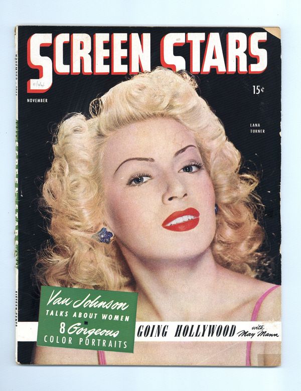 Vol. 2, No. 2. November 1944. Lana Turner cover. Screen Stars Magazine was one among many of the supermarket celebrity tabloids that focused heavily on the day to day lives of the Hollywood elite, during the golden-age of cinema. This publication is filled cover to cover with typical fodder such as candid celebrity photos (some of which are in color), gossip columns, reader's letters to the editor, and the latest motion picture advertisements. 8.5" x 10.5", 82 pages, mostly B&W with a few color photos. Cover price $0.15.