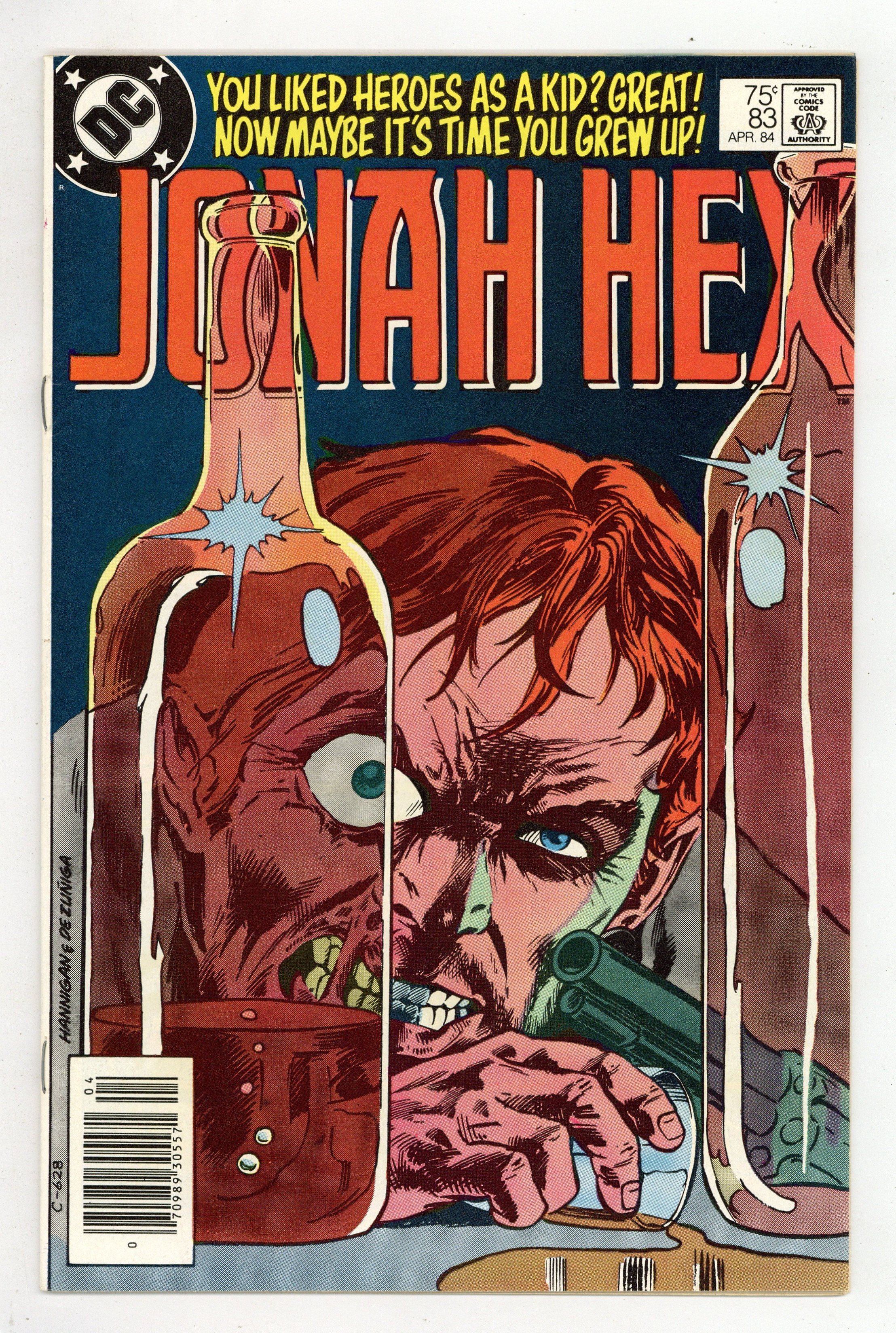 $13.75Jonah gets drunk and throws his matched Colt Dragoons in a lake in "Blues in the Bottle...Stopple in My Hand!" Characters: Jonah Hex; Mei Ling Hex; U.S. Marshal Jeremiah D. Hart; Archie Riordan; Petey Riordan; Mr. Smathers; Brett; Camille; Sandy. Written by Michael Fleisher, with art by Tony DeZuniga. Cover by Ed Hannigan and Tony DeZuniga. Cover price $0.75.