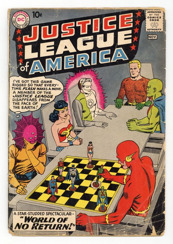 Cover art by Murphy Anderson. The World of No Return!, script by Gardner Fox, pencils by Mike Sekowsky, inks by Bernard Sachs; The Flash must beat Despero in a strange chess-like game to save the other members of the Justice League and the people of Despero's home dimension, Kalanor. Letter to the editor from comic writer Roy Thomas. 36 pgs. $0.10. Cover price $0.10.