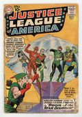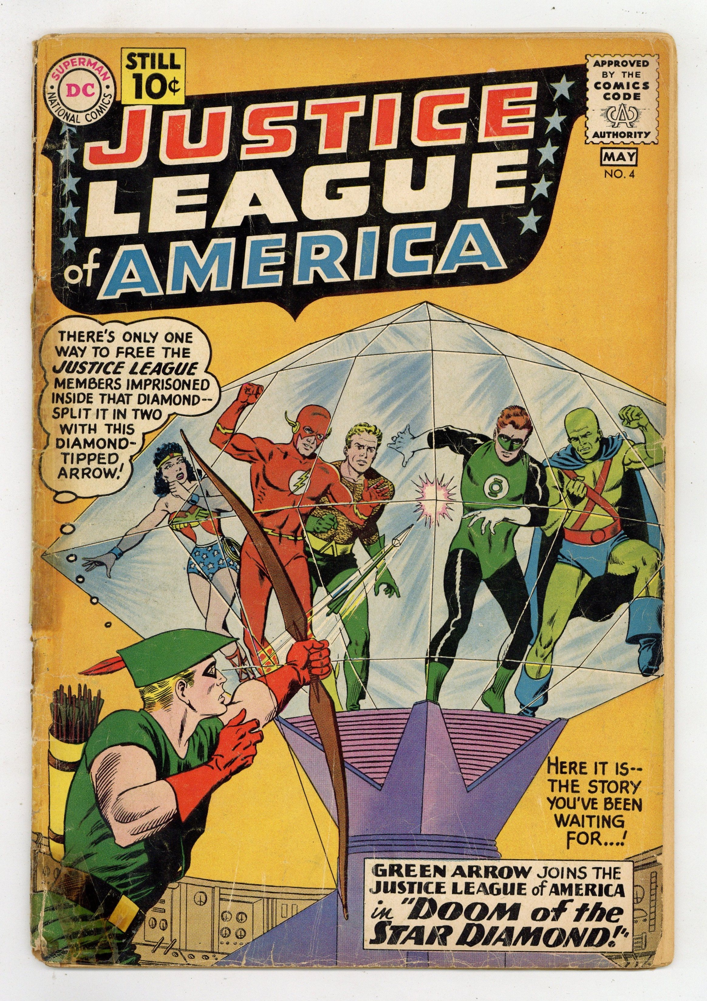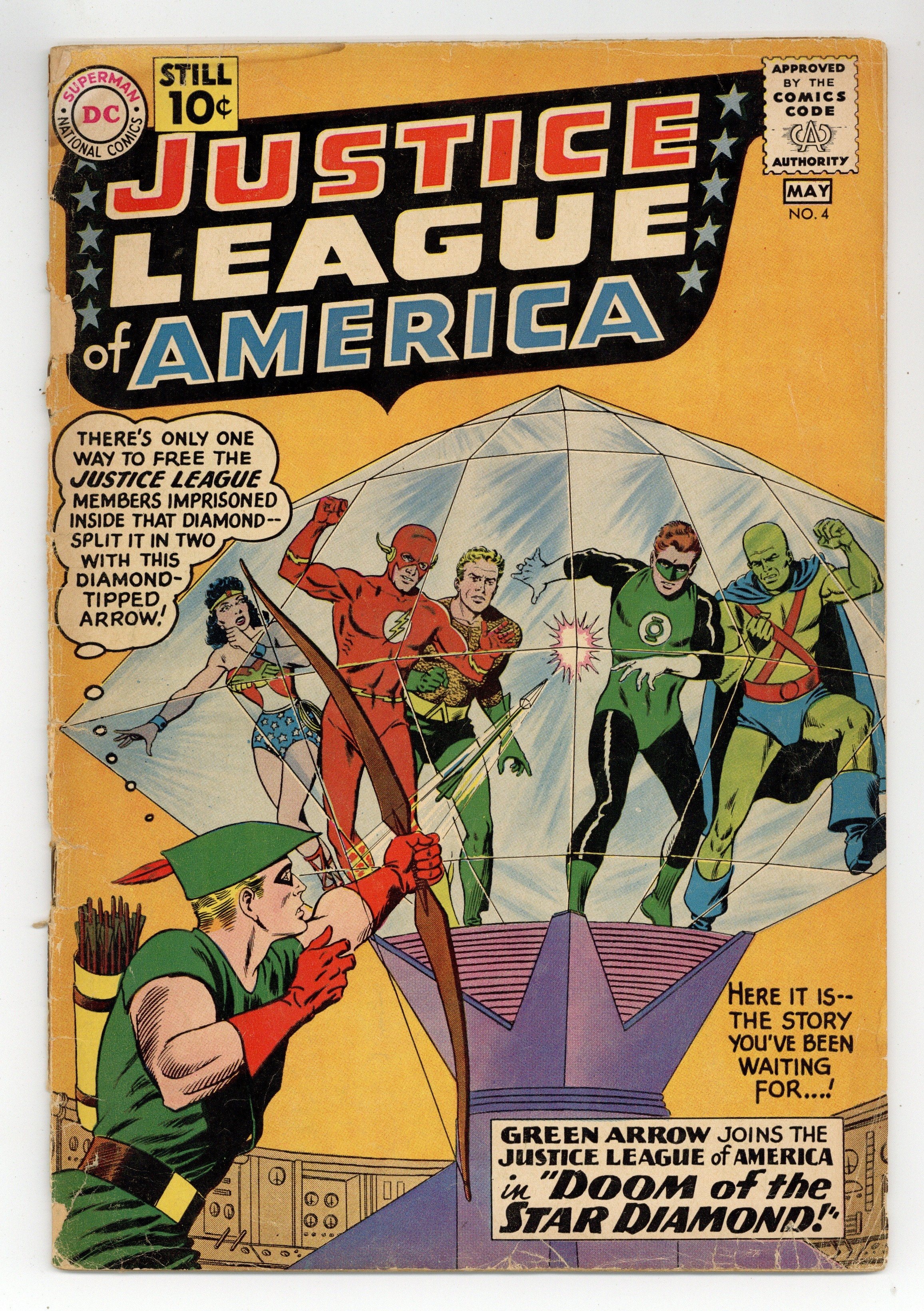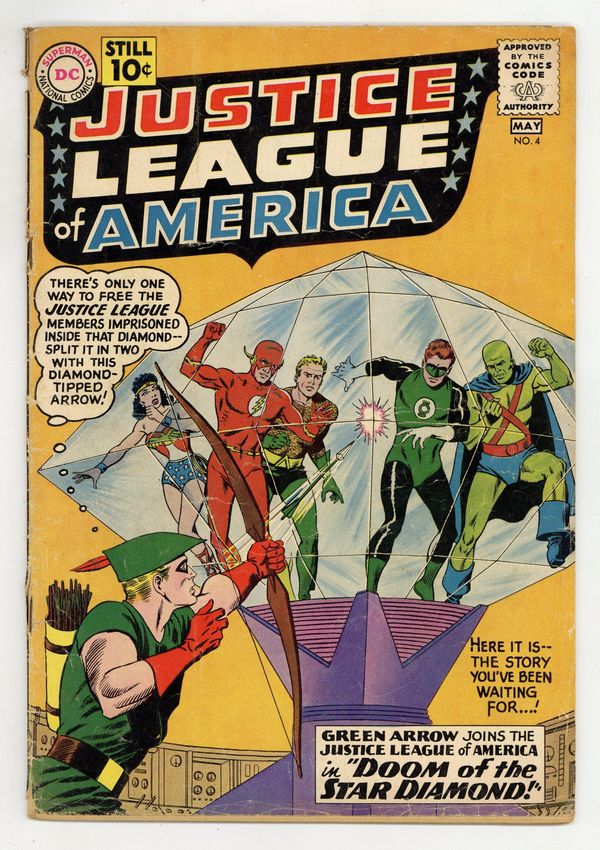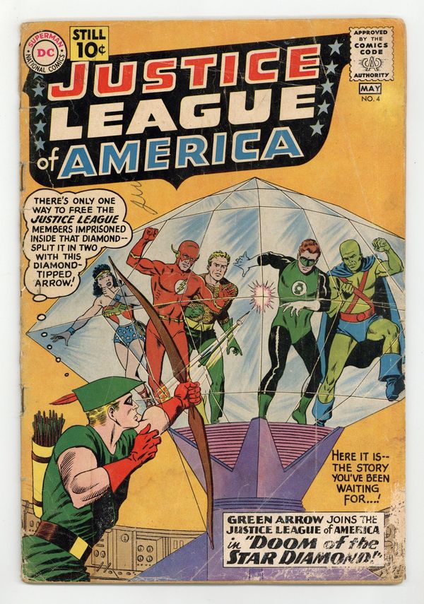 Cover art by Murphy Anderson. Doom of the Star Diamond, script by Gardner Fox, pencils by Mike Sekowsky, inks by Bernard Sachs; Carthan, banished from his homeworld Dryanna to Earth by his ruler Xandor, attempts to contact the Justice League for help but cannot do so directly; He activates three machines of destruction that hold him to Earth and takes Green Arrow hostage, hoping that the Justice League can deactivate the machines and free him. Diamonds of Destiny! article. A letter from Roy Thomas. 36 pgs. $0.10. Cover price $0.10.