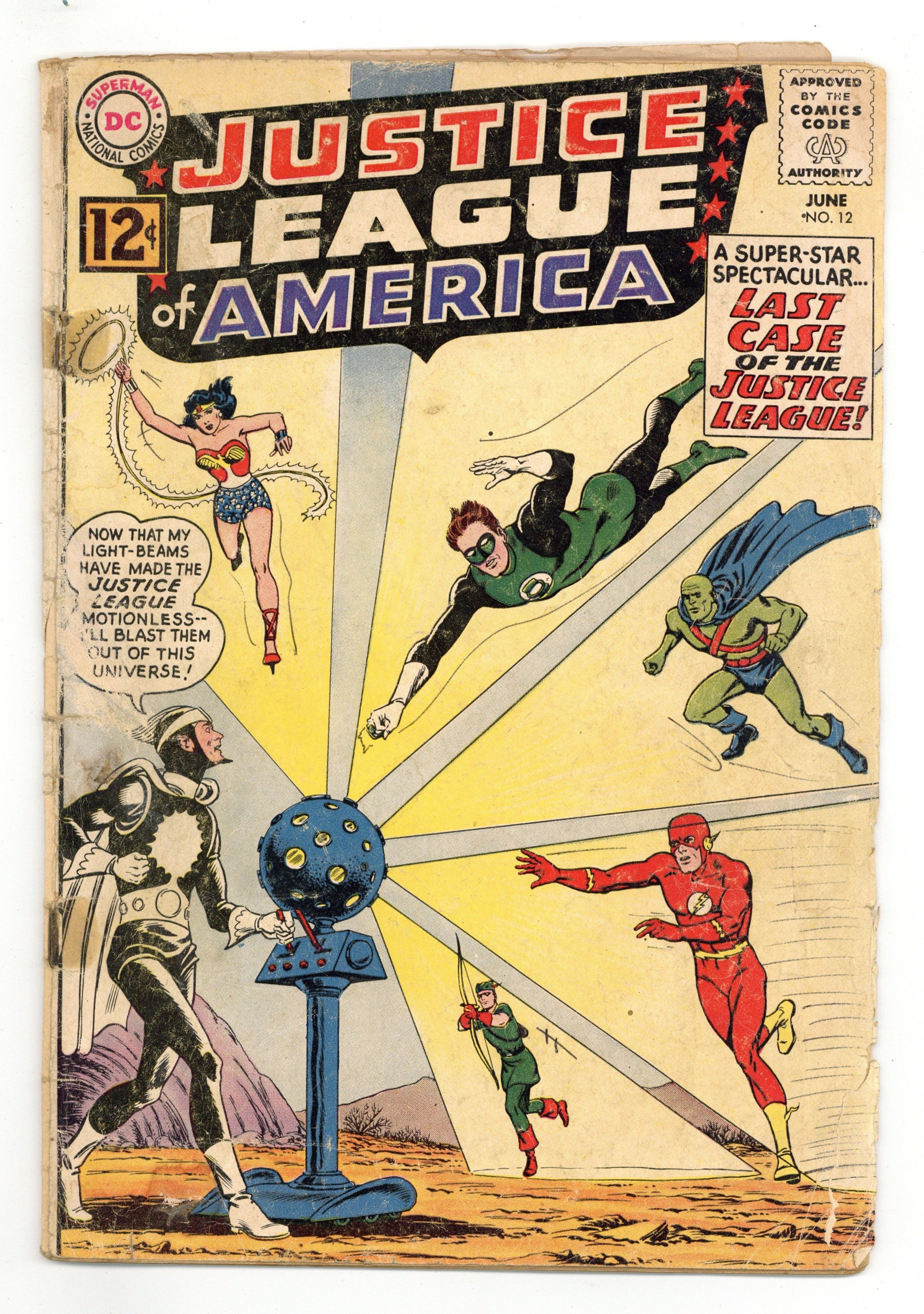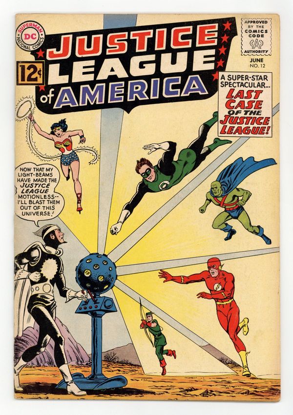Origin and 1st appearance of Dr. Light. Cover art by Murphy Anderson. The Last Case of the Justice League!, script by Gardner Fox, pencils by Mike Sekowsky, inks by Bernard Sachs; Snapper Carr is summoned to the Justice League Sanctuary, only to find Dr. Light there; Light tells Snapper that he transported the rest of the Justice League to a surreal universe from which they can't escape. Once he's finished his tale, he freezes Snapper solid; But of course the Justice League saves the day. 36 pgs. $0.12. Cover price $0.12.