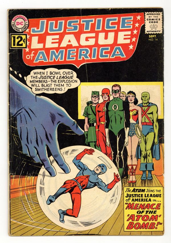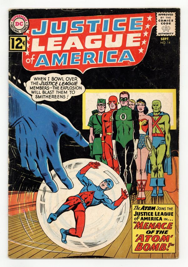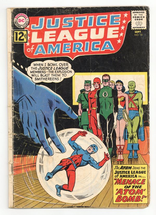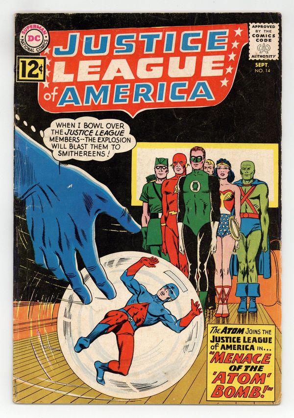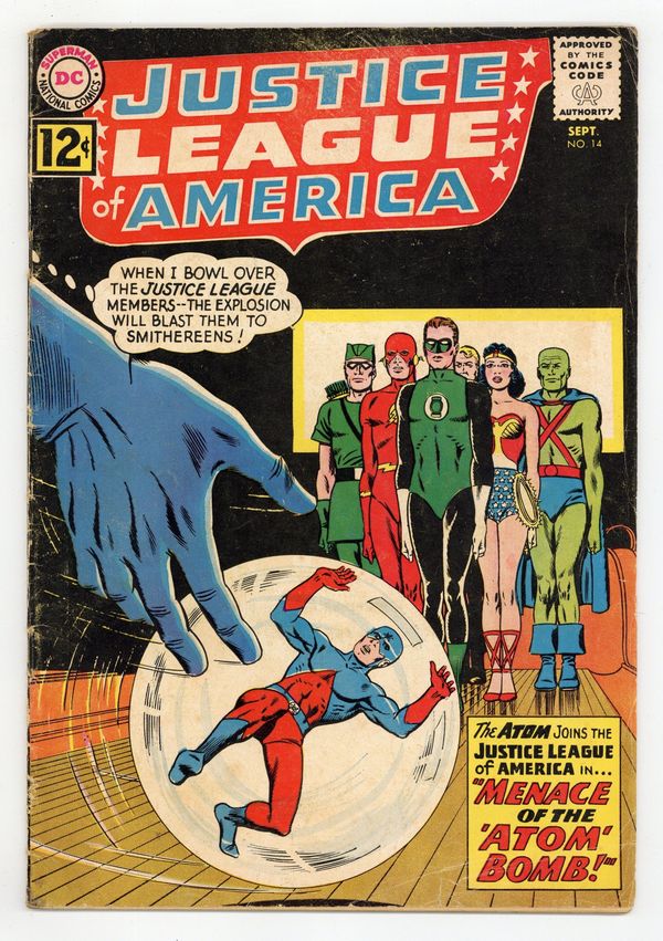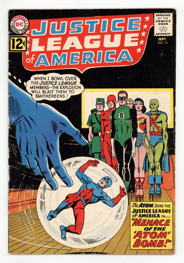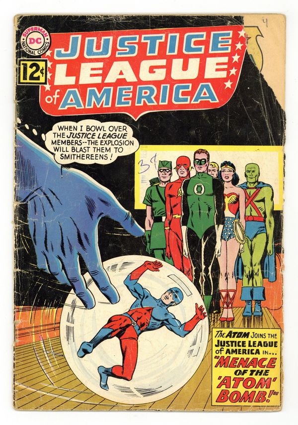 Cover art by Murphy Anderson. The Menace of the 'Atom' Bomb!, script by Gardner Fox, pencils by Mike Sekowsky, inks by Bernard Sachs; The Justice League unanimously elects the Atom for membership, but nobody remembers who he is; Green Lantern's Power Ring tells them about the Atom, and they go to investigate in Ivy Town; However, the Atom also gets amnesia, the work of Mister Memory and his de-memorizer, who has captured the entire Justice League, leaving Atom the only one who can save them. Letter to the editor from Jerry Bails. 36 pgs. $0.12. Cover price $0.12.