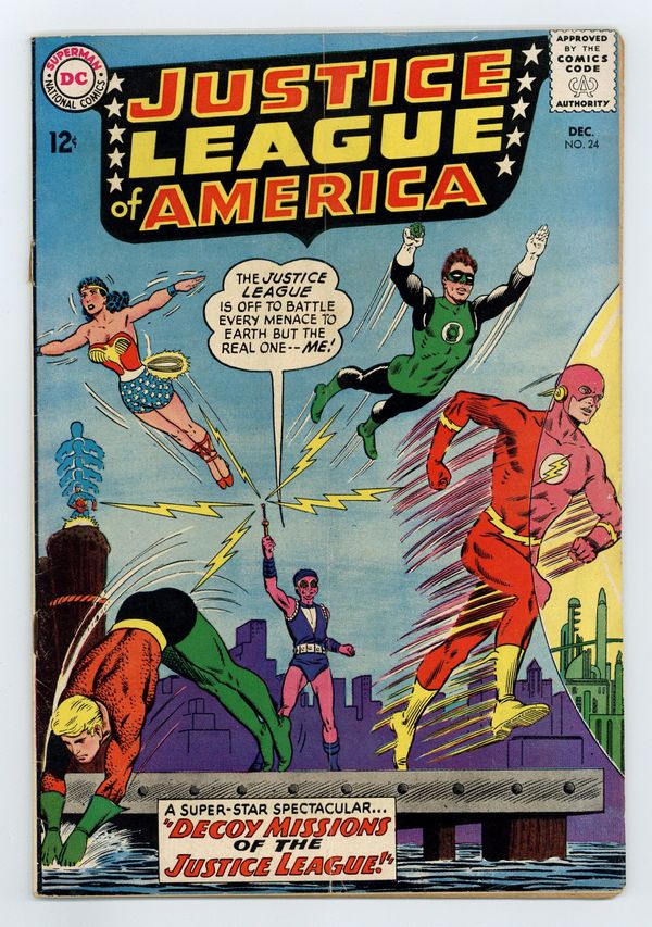 Cover art by Murphy Anderson. Decoy Missions of the Justice League, script by Gardner Fox, pencils by Mike Sekowsky, inks by Bernard Sachs; Kanjar Ro gains the ability to split off an aural form of himself and draw off aural forms of the JLA; He leaves his own aural form in his place in jail and uses the aural JLAers to lure their physical forms into traps; Adam Strange learns Kanjar Ro's plot and helps the JLA defeat him. 36 pgs. $0.12. Cover price $0.12.