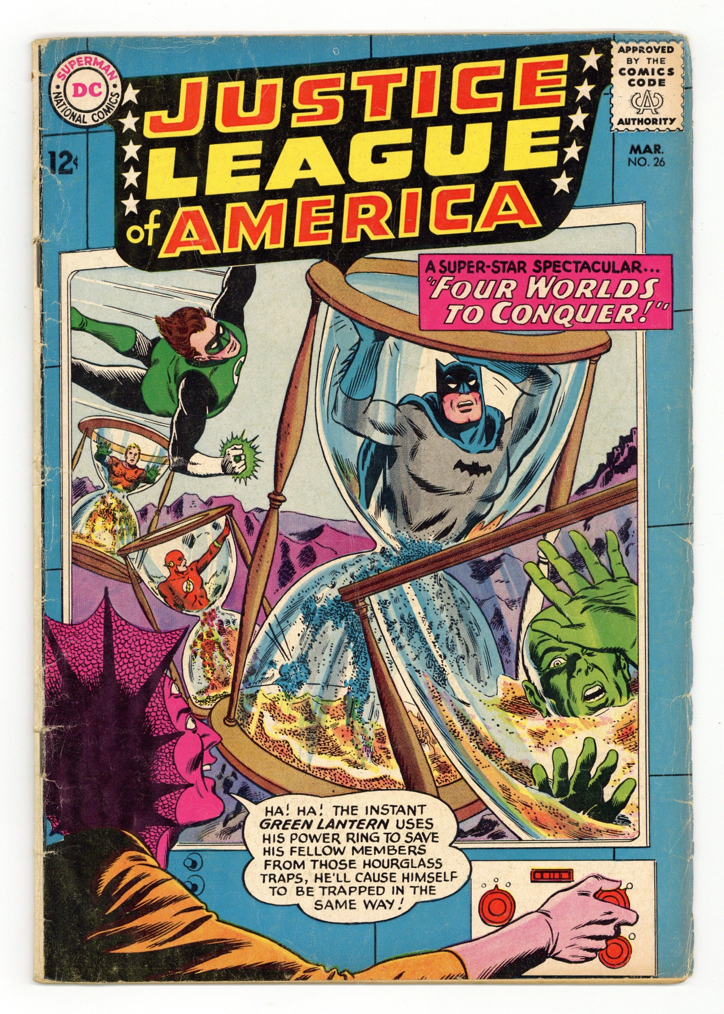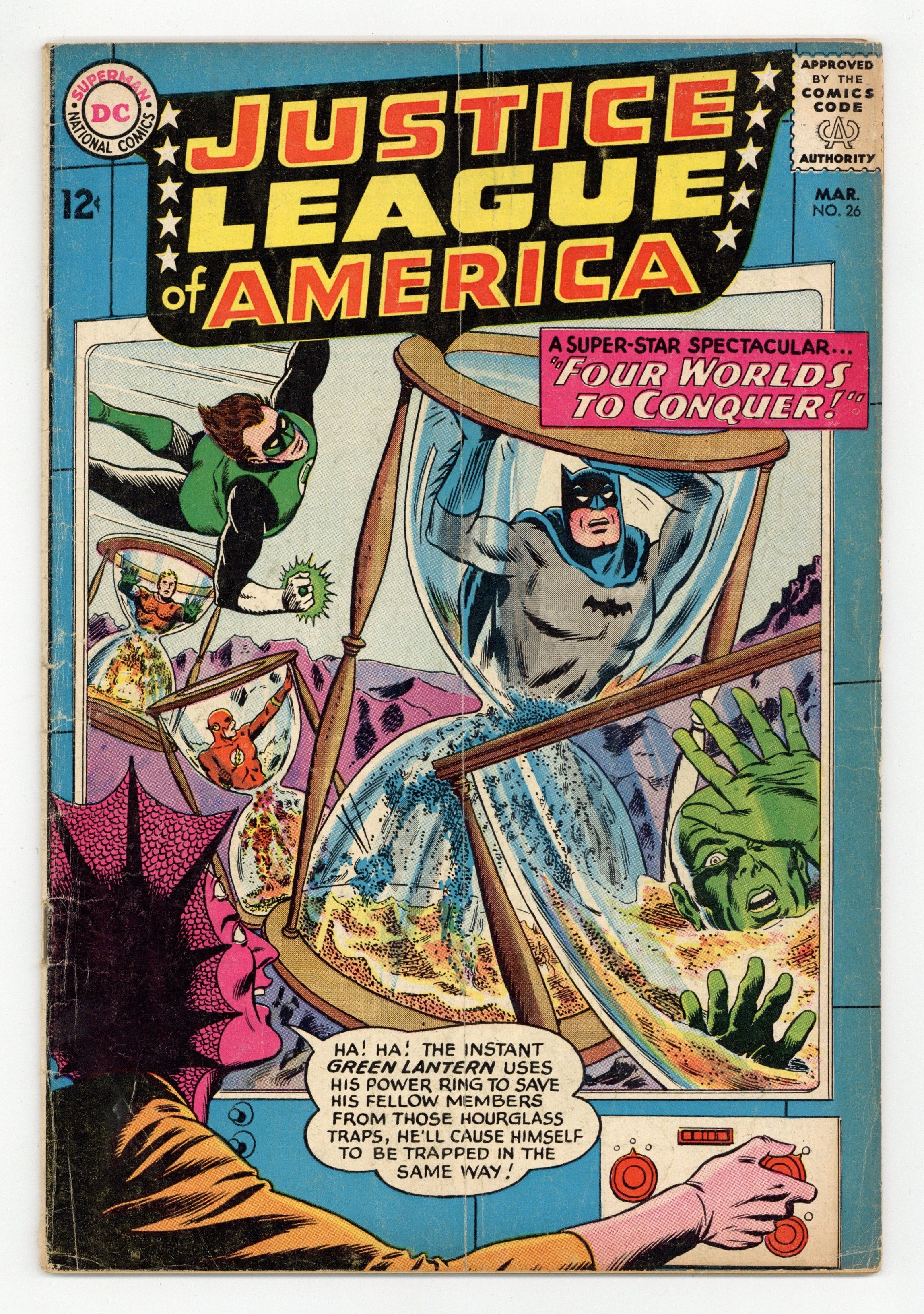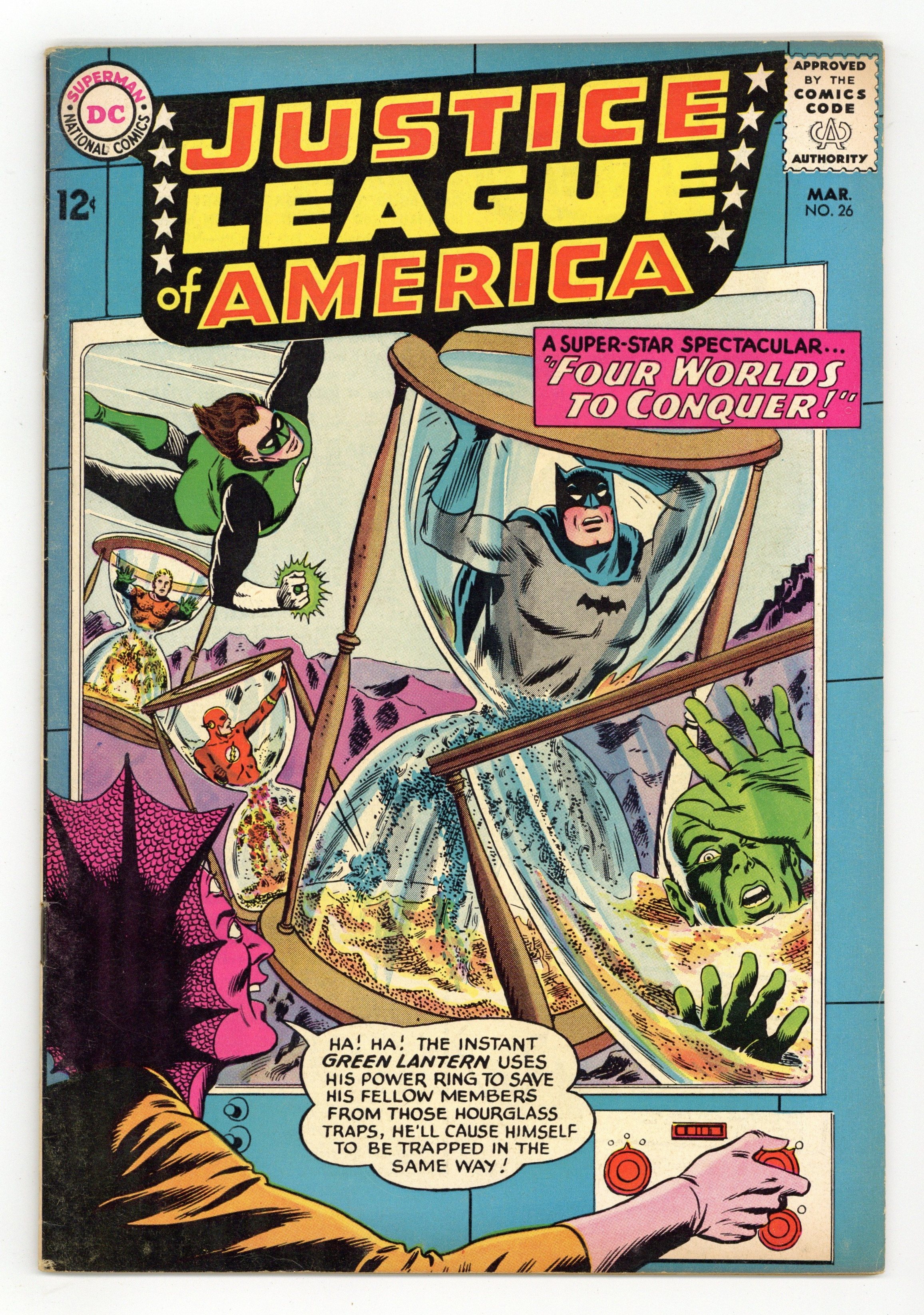 Cover pencils by Mike Sekowsky, inks by Murphy Anderson. Four Worlds to Conquer!, script by Gardner Fox, pencils by Mike Sekowsky, inks by Bernard Sachs; Despero escapes his prison and ages half the JLA and dispatches the other half to alternate worlds; When Despero tries to pass himself off as an aged Superman, Wonder Woman snares him in her magic lasso and makes him return the missing members and de-age the others. Give and Take public service announcement, script by Jack Schiff, art by Sheldon Moldoff. 36 pgs. $0.12. Cover price $0.12.