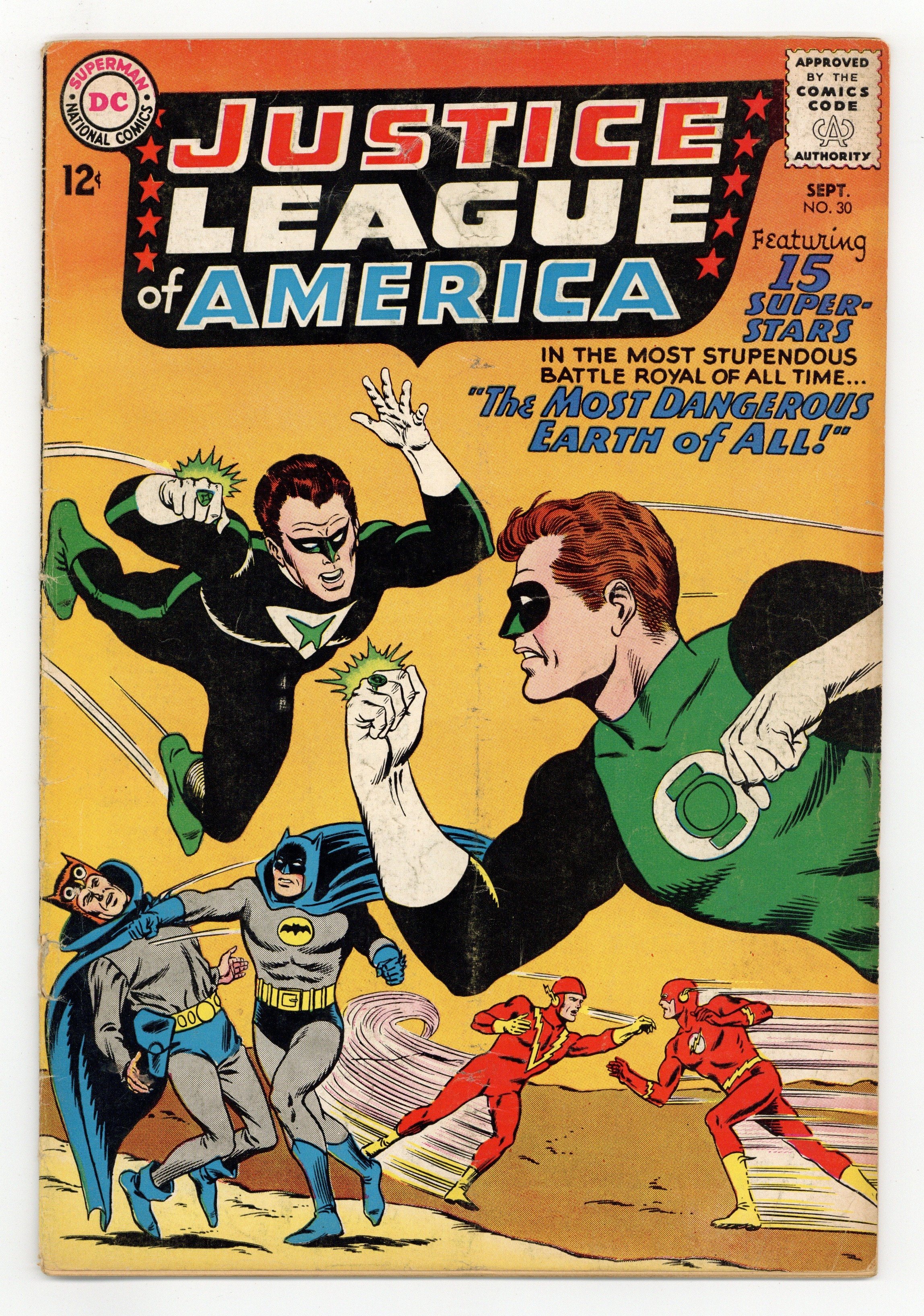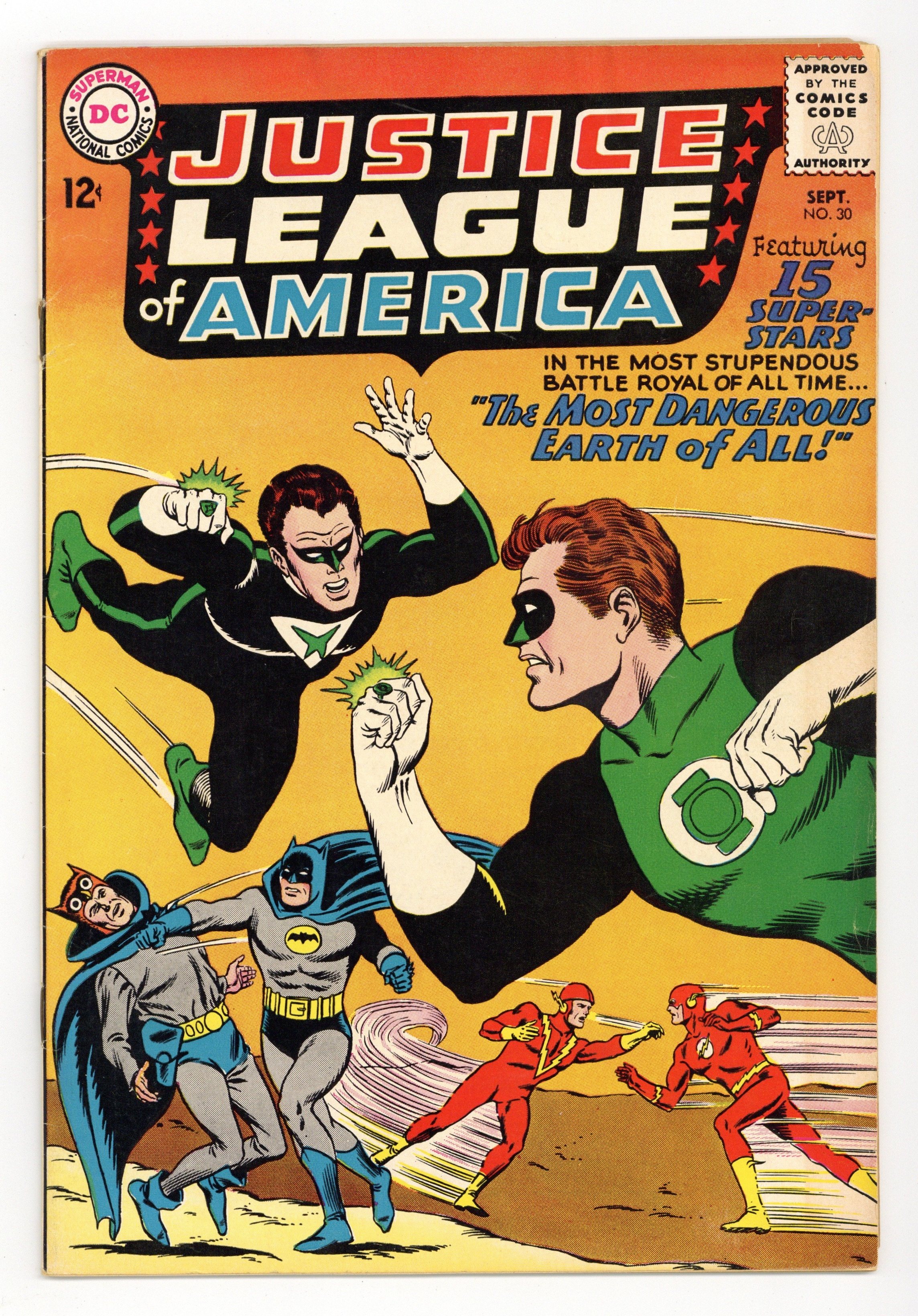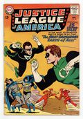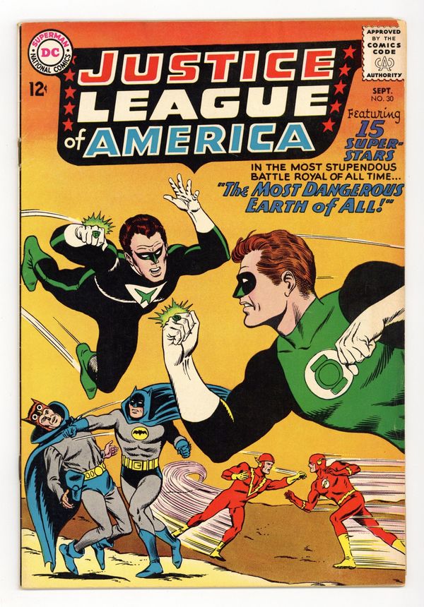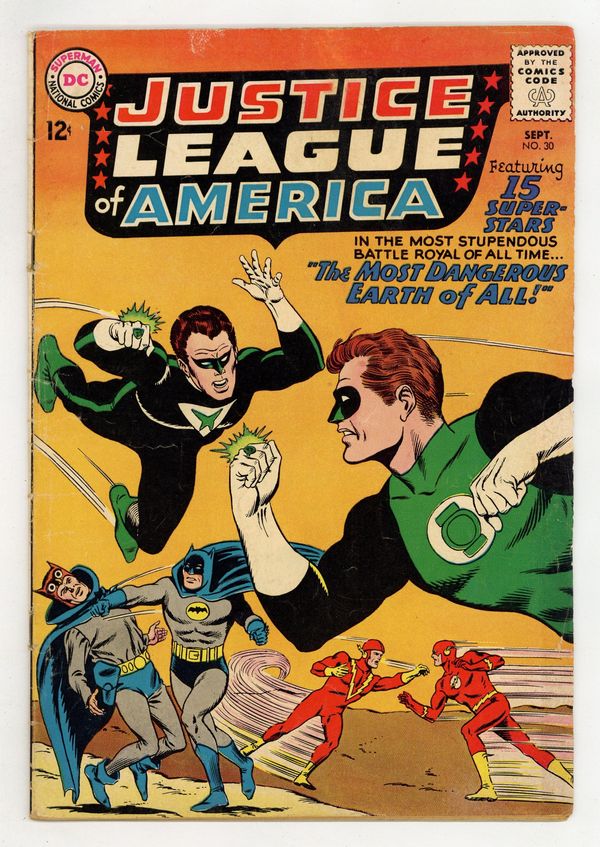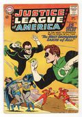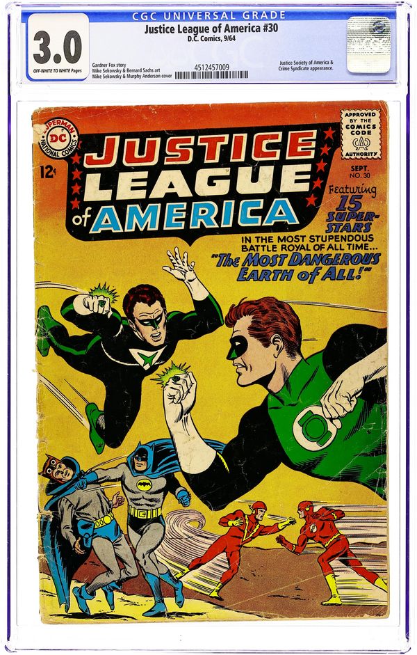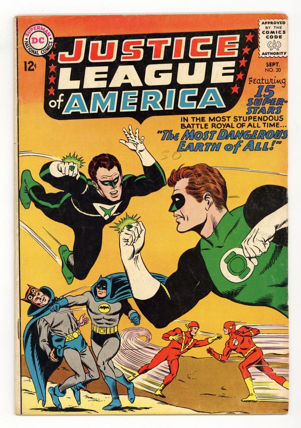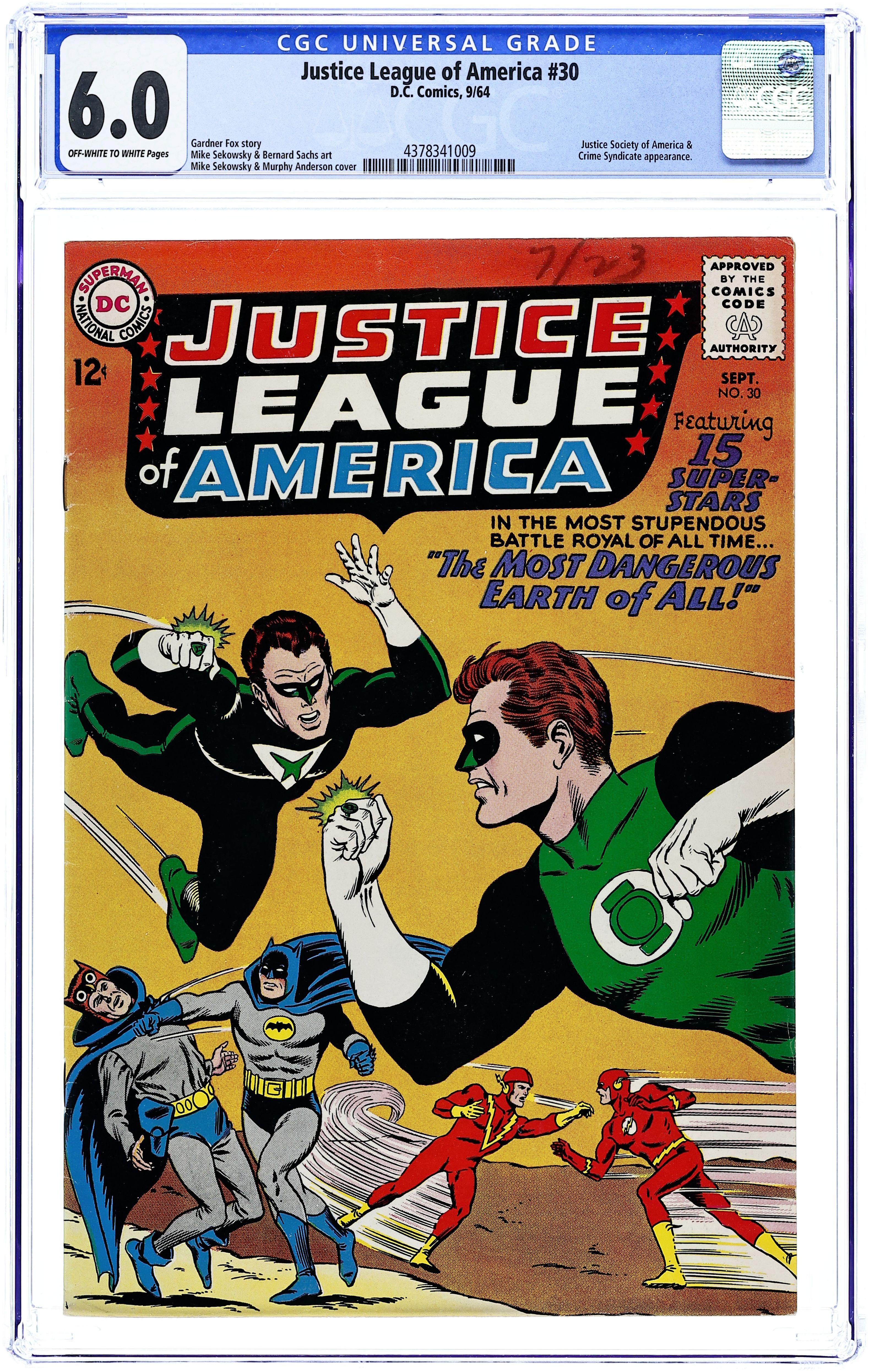 Cover pencils by Mike Sekowsky, inks by Murphy Anderson. The Most Dangerous Earth of All, script by Gardner Fox, pencils by Mike Sekowsky, inks by Bernard Sachs; The JSA is tricked into being transported to an interdimensional prison by the Crime Syndicate (using the same word 'Volthoom' that captured the JLA last issue), so the JLA must battle the Crime Syndicate on Earth-2; The JLA then gets the Syndicate to over-exert themselves, imprisons them between the dimensions, and later frees the JSA from their dimensional trap set by the Syndicate to destroy the earths should they have lost vs. both teams. Rocky and Bullwinkle star in a one-page Cheerios ad. 32 pgs. $0.12. Cover price $0.12.