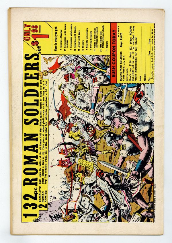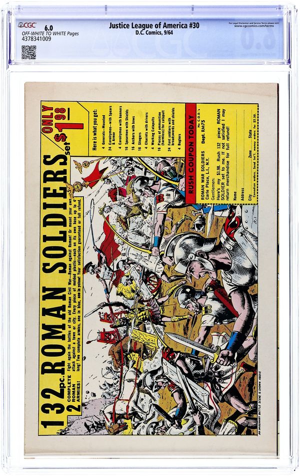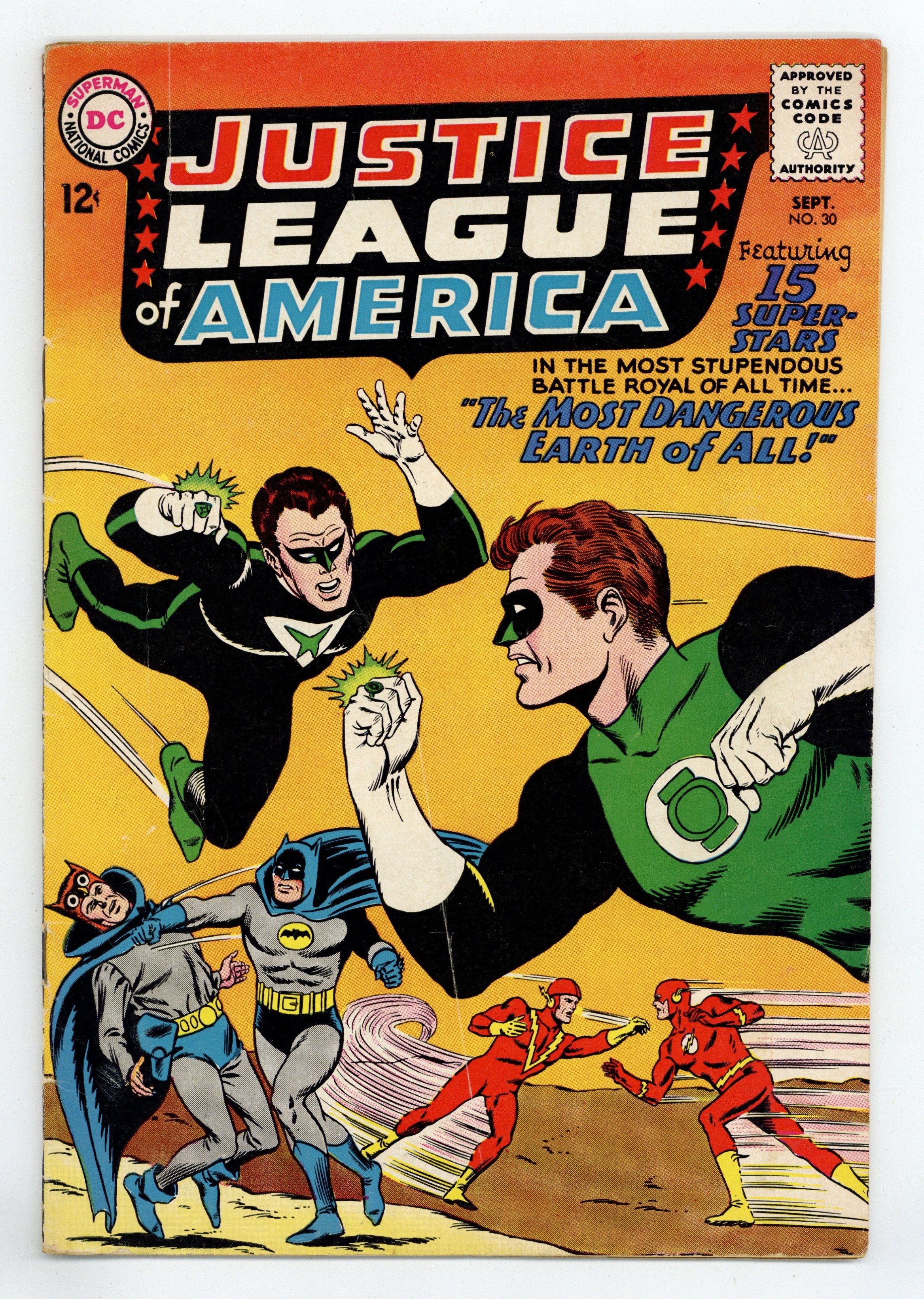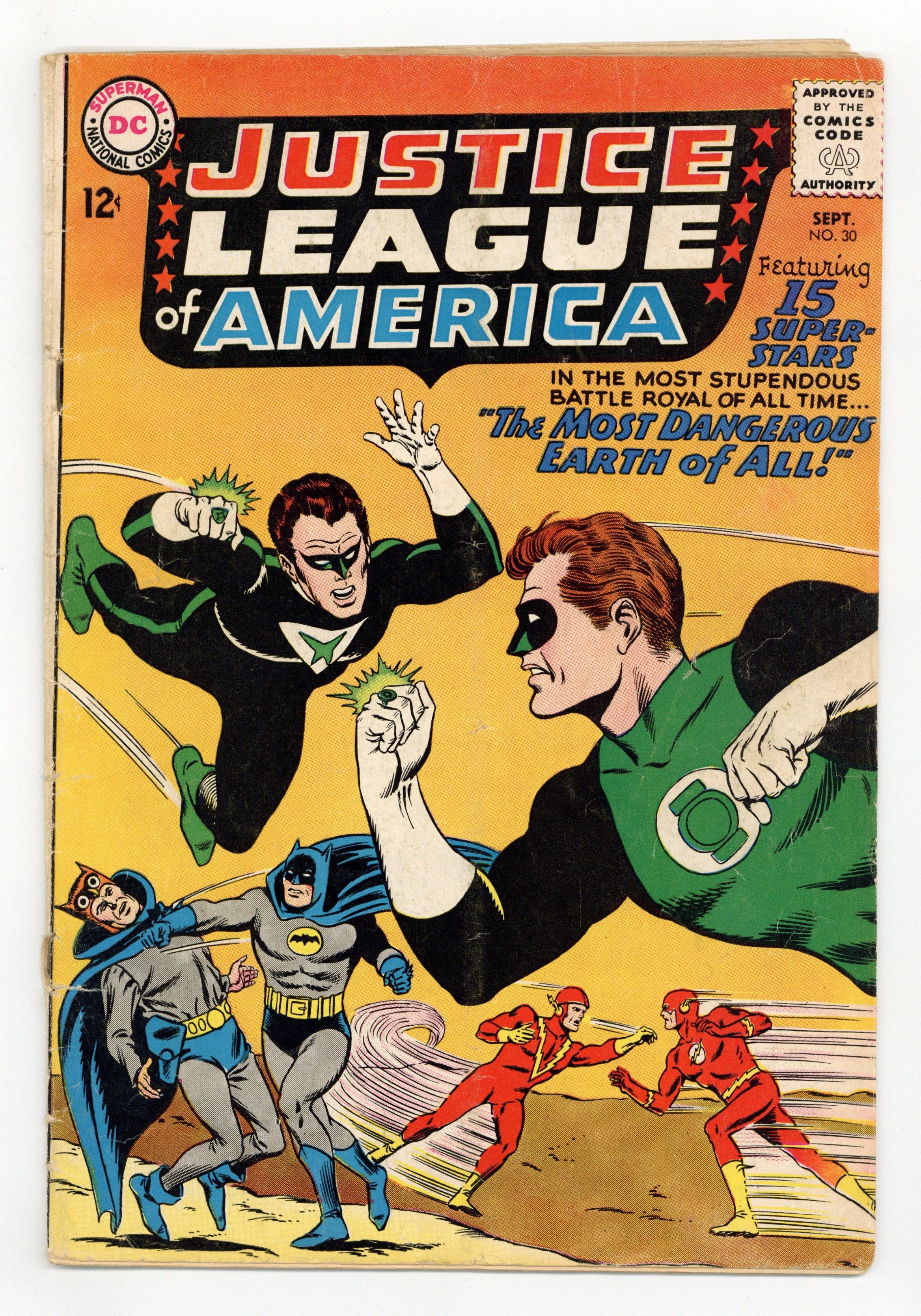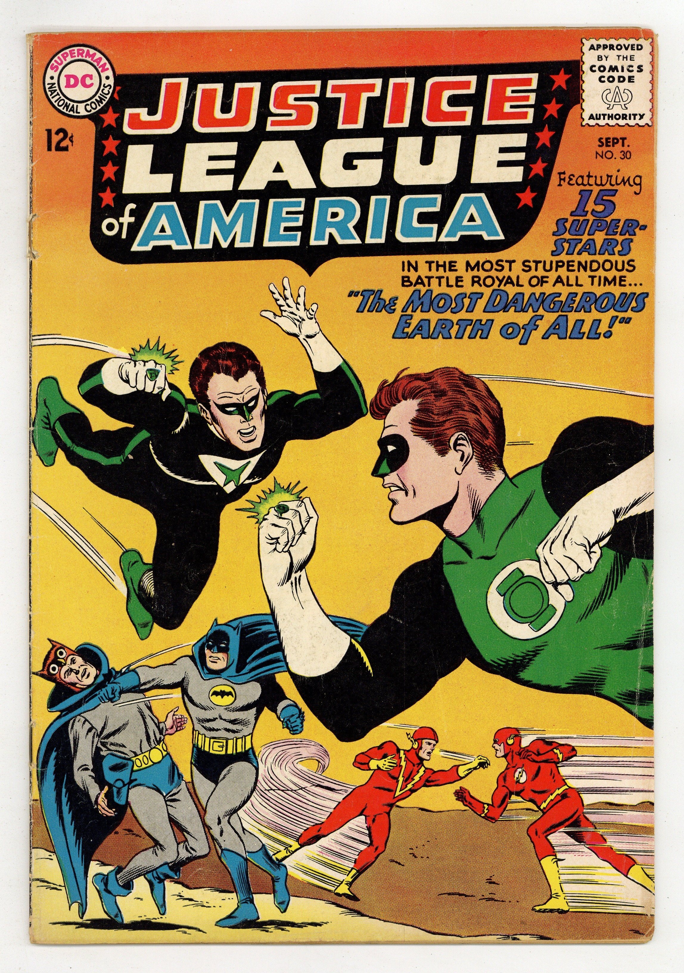 Cover pencils by Mike Sekowsky, inks by Murphy Anderson. The Most Dangerous Earth of All, script by Gardner Fox, pencils by Mike Sekowsky, inks by Bernard Sachs; The JSA is tricked into being transported to an interdimensional prison by the Crime Syndicate (using the same word 'Volthoom' that captured the JLA last issue), so the JLA must battle the Crime Syndicate on Earth-2; The JLA then gets the Syndicate to over-exert themselves, imprisons them between the dimensions, and later frees the JSA from their dimensional trap set by the Syndicate to destroy the earths should they have lost vs. both teams. Rocky and Bullwinkle star in a one-page Cheerios ad. 32 pgs. $0.12. Cover price $0.12.