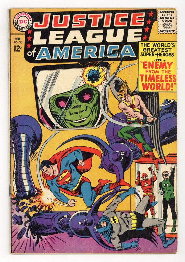 $20.00Cover pencils by Mike Sekowsky, inks by Murphy Anderson. Enemy from the Timeless World!, script by Gardner Fox, pencils by Mike Sekowsky, inks by Bernard Sachs; When Earthmen from the future tap the energy of the JLAers to defeat the Alien-Ator, he becomes aware of the JLA and sets one half against the other. Amazing Ratios fact page by Julius Schwartz. Letter to the editor from comics writer Roy Thomas. Superboy stars in a one-page public service announcement, "Don't Give Fire a Place to Start!" 36 pgs. $0.12. Cover price $0.12.