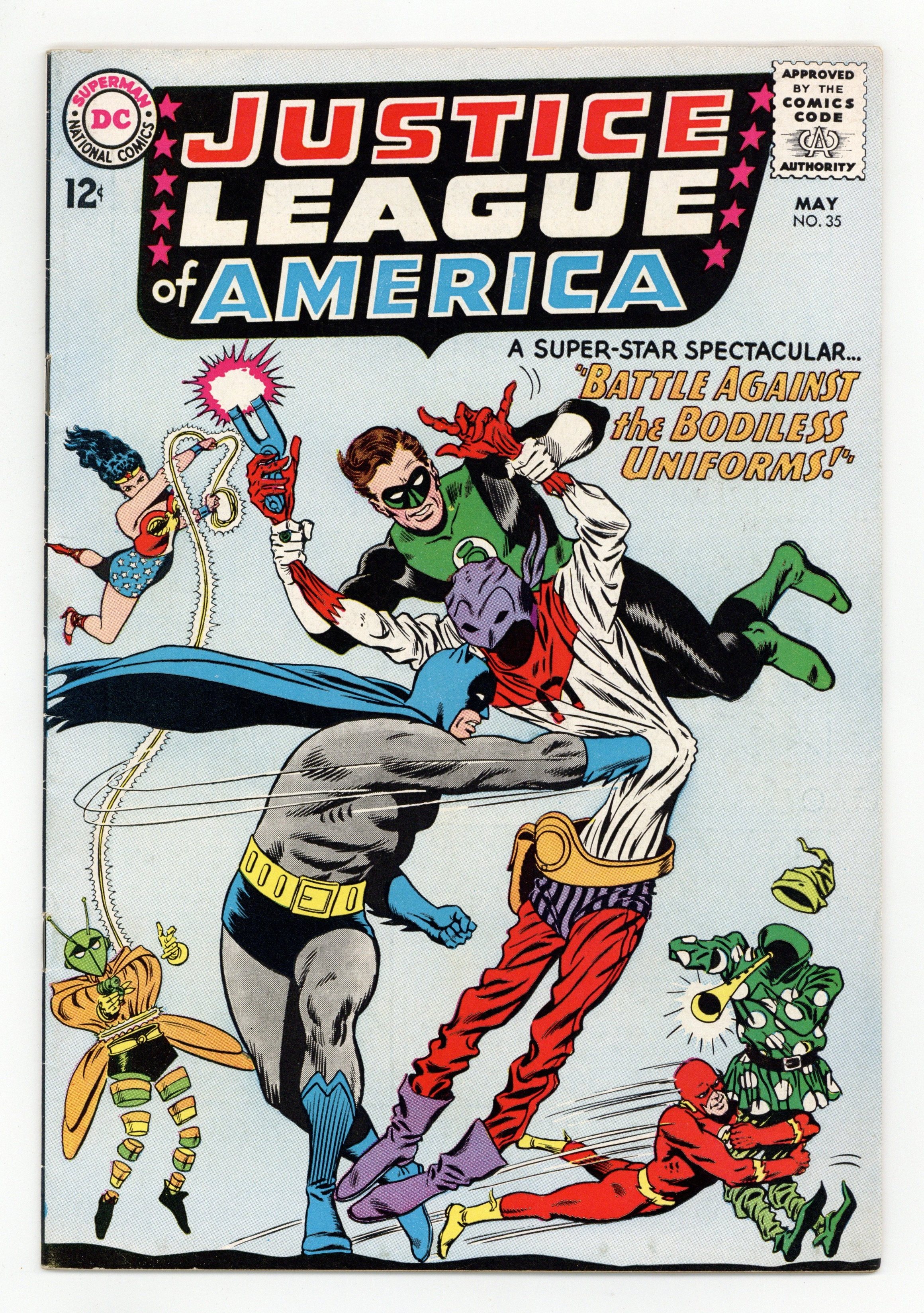 Cover pencils by Mike Sekowsky, inks by Murphy Anderson. Battle Against the Bodiless Uniforms, script by Gardner Fox, pencils by Mike Sekowsky, inks by Bernard Sachs; The Demons Three create duplicates of JLA villains in an effort to get the JLA to release them from their imprisonment. Rocky and Bullwinkle star in a one-page Cheerios ad. 36 pgs. $0.12. Cover price $0.12.