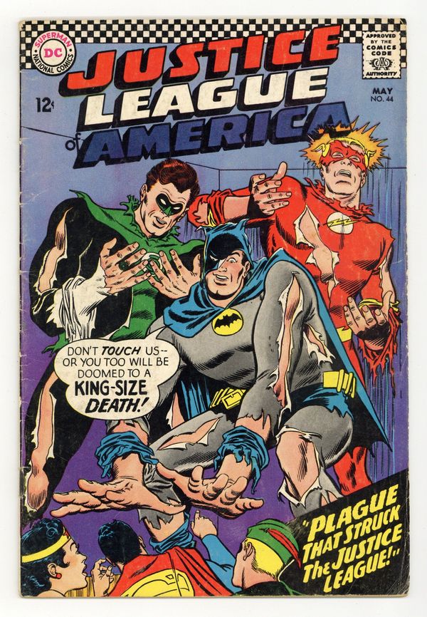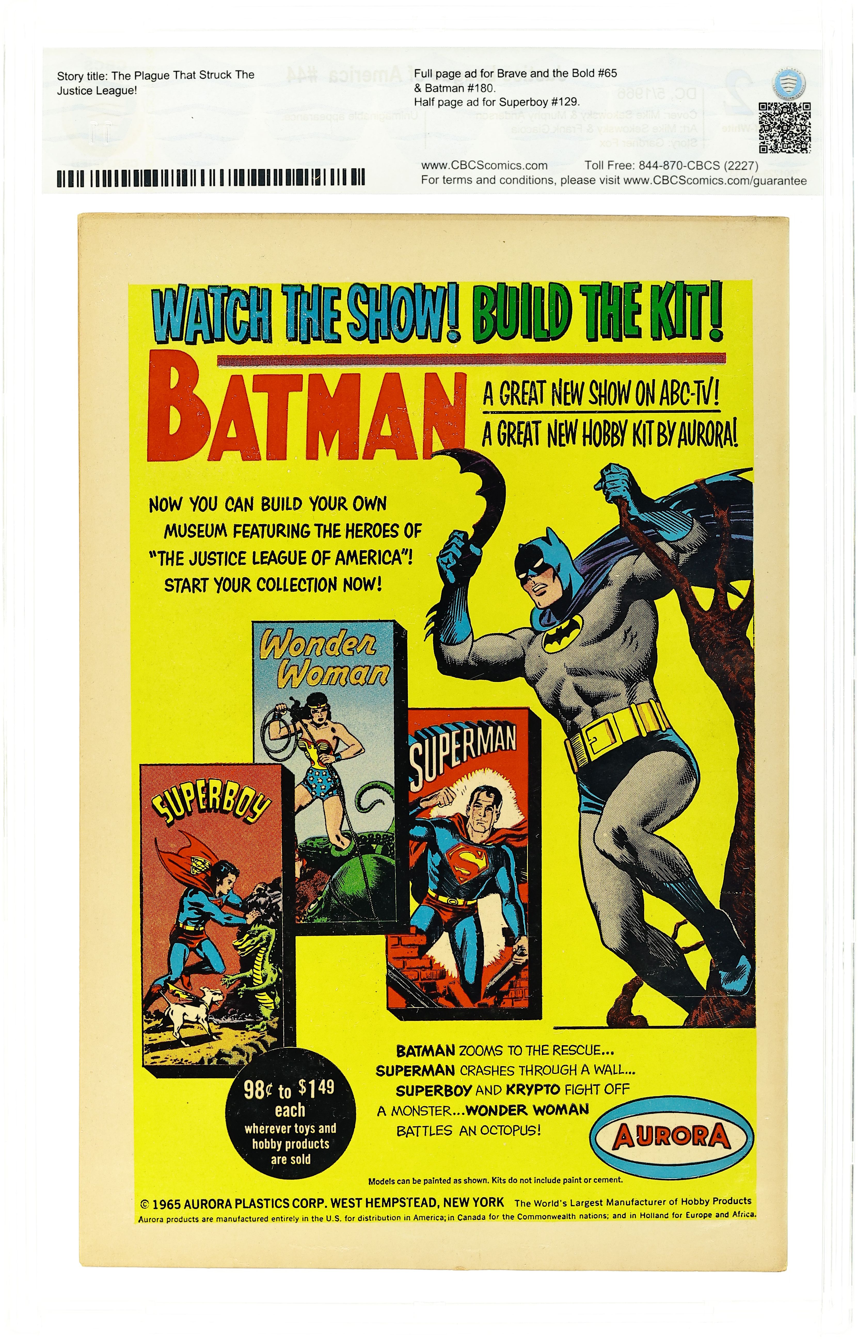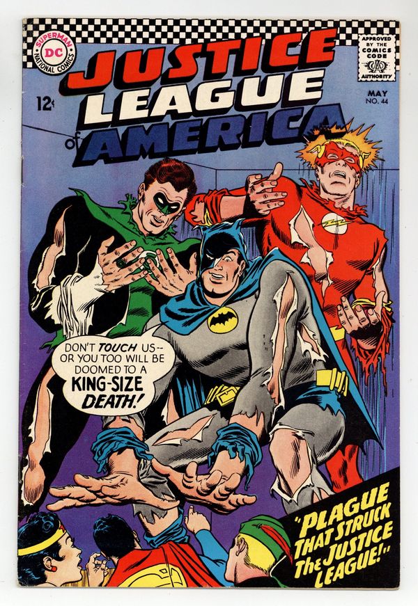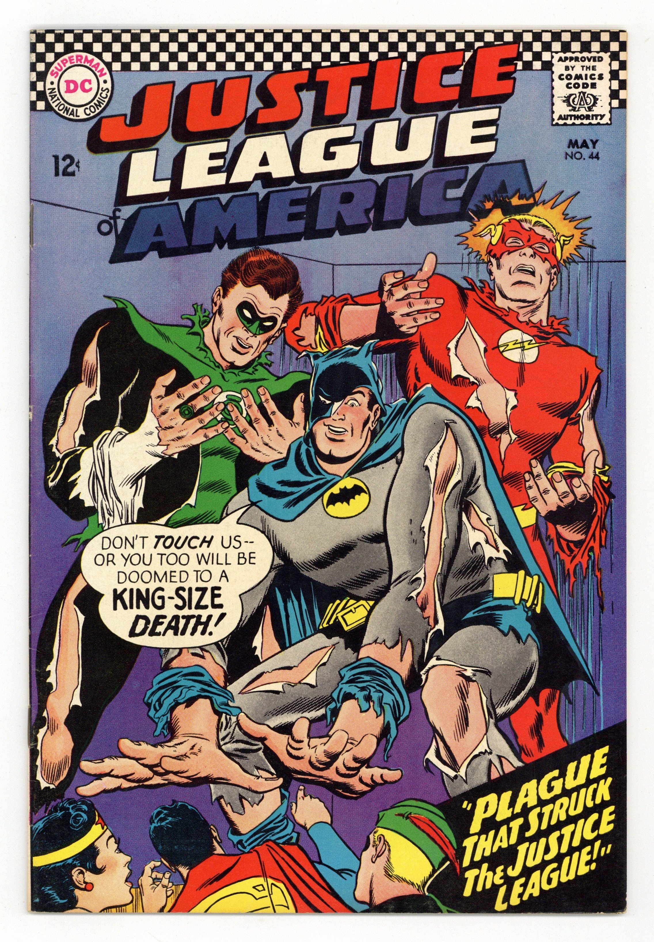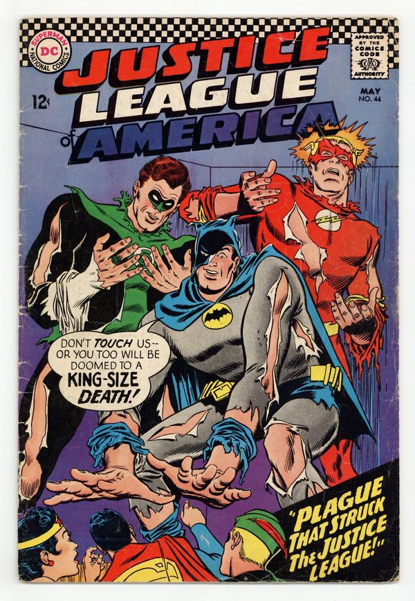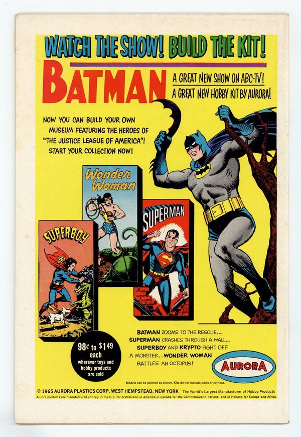 Cover pencils by Mike Sekowsky, inks by Murphy Anderson. The Plague That Struck the Justice League!, script by Gardner Fox, pencils by Mike Sekowsky, inks by Frank Giacoia; When the JLAers who previously fought the Unimaginable suddenly double in size, the alien Dr. Bendorion comes to Earth to help cure them; But Batman suspects that Dr. Bendorion is not what he seems, and he is revealed as the Unimaginable. Rocky and Bullwinkle star in a one-page Cheerios ad. 36 pgs. $0.12. Cover price $0.12.