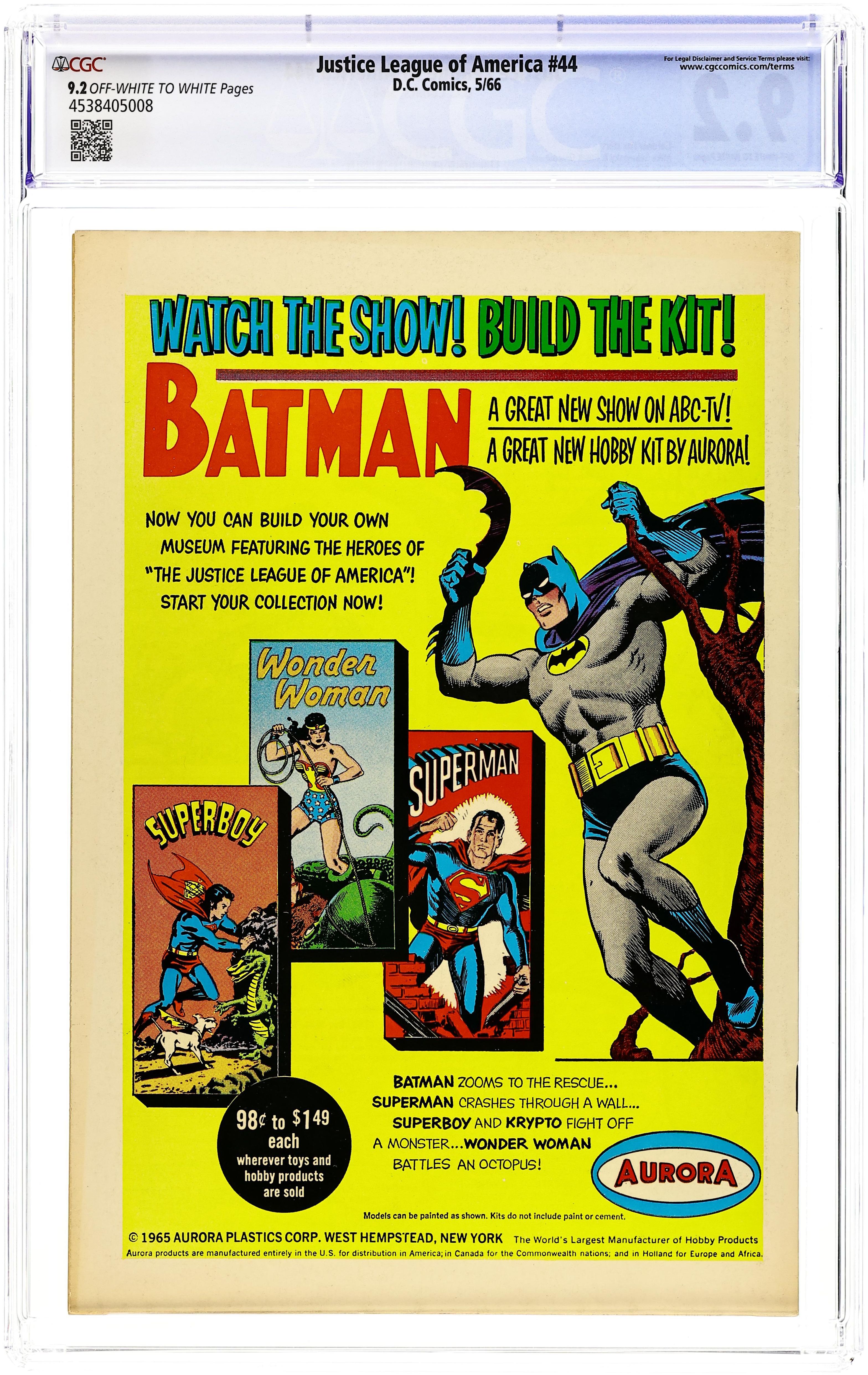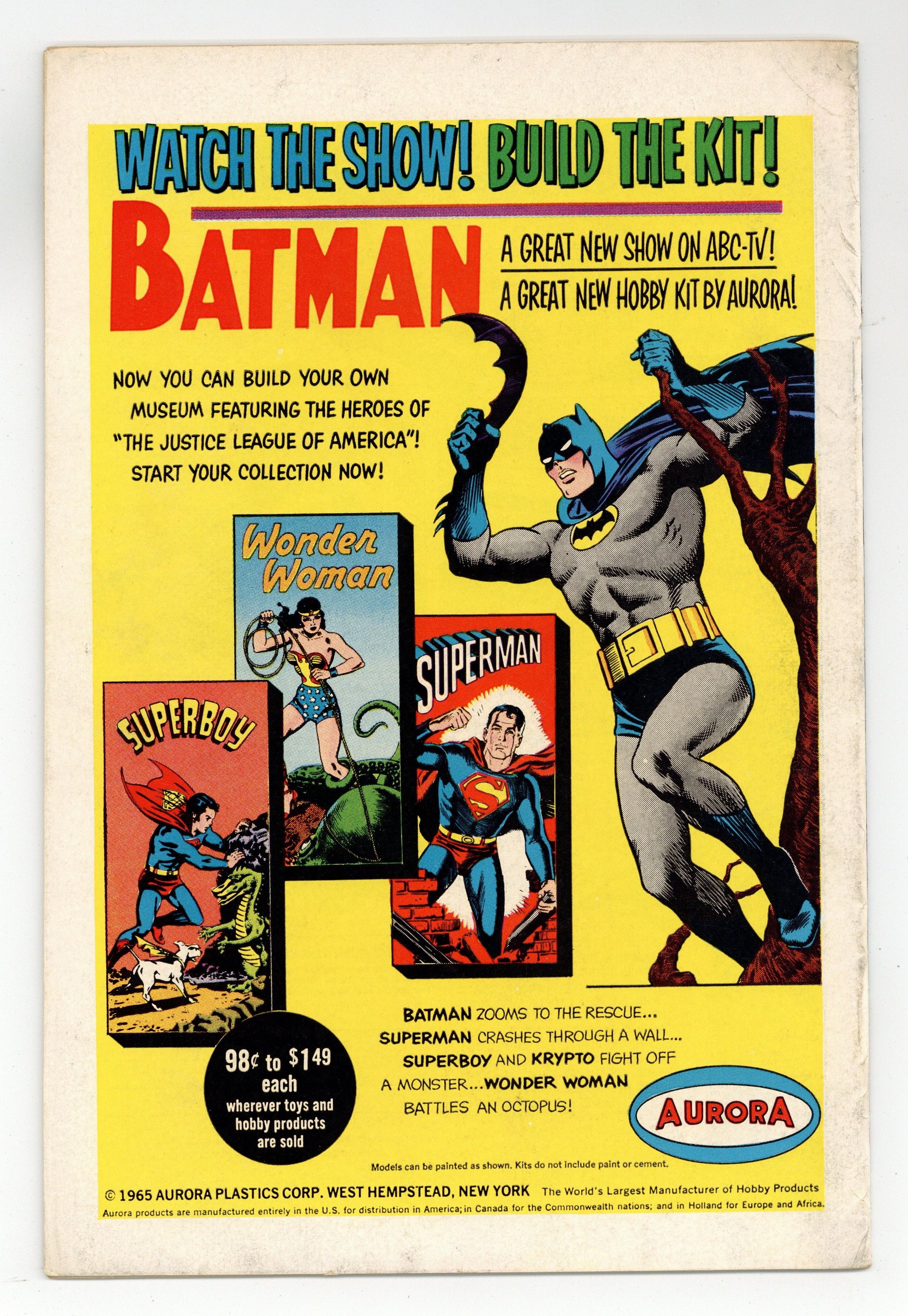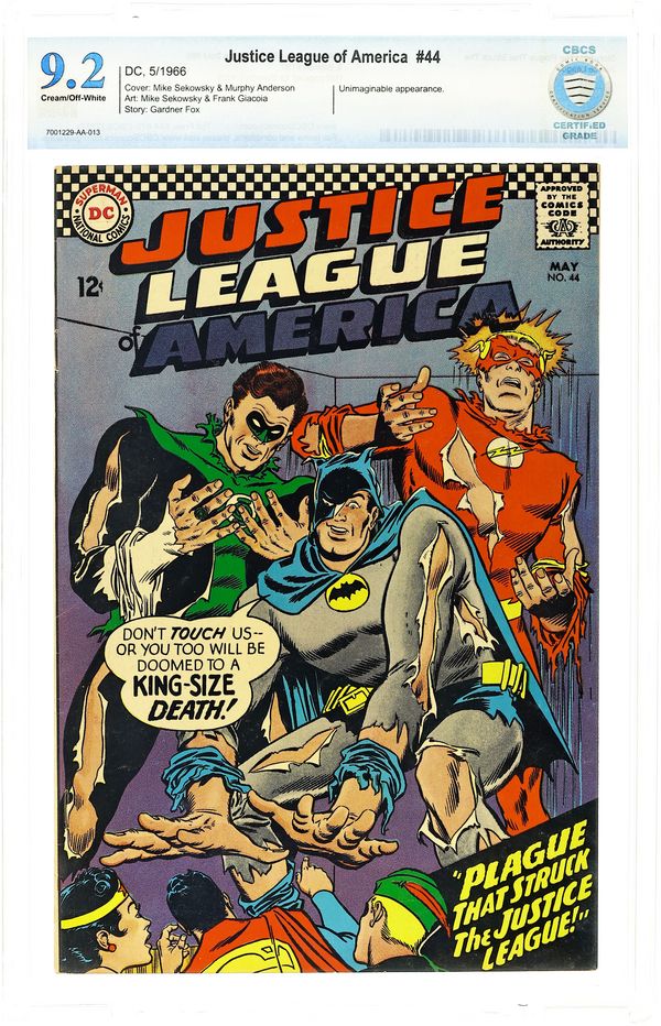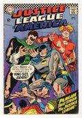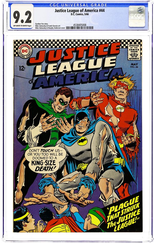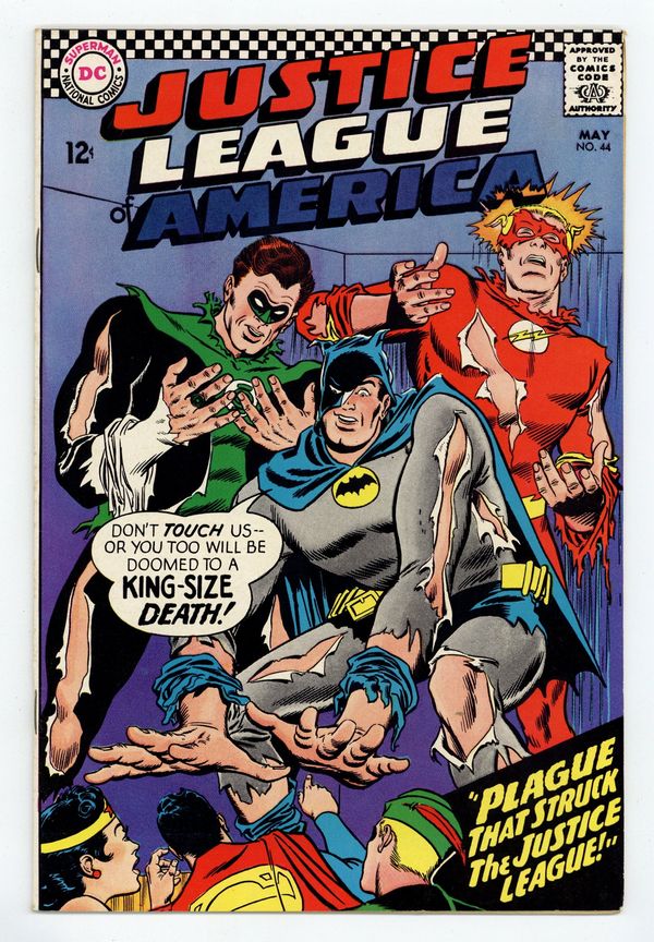 Cover pencils by Mike Sekowsky, inks by Murphy Anderson. The Plague That Struck the Justice League!, script by Gardner Fox, pencils by Mike Sekowsky, inks by Frank Giacoia; When the JLAers who previously fought the Unimaginable suddenly double in size, the alien Dr. Bendorion comes to Earth to help cure them; But Batman suspects that Dr. Bendorion is not what he seems, and he is revealed as the Unimaginable. Rocky and Bullwinkle star in a one-page Cheerios ad. 36 pgs. $0.12. Cover price $0.12.