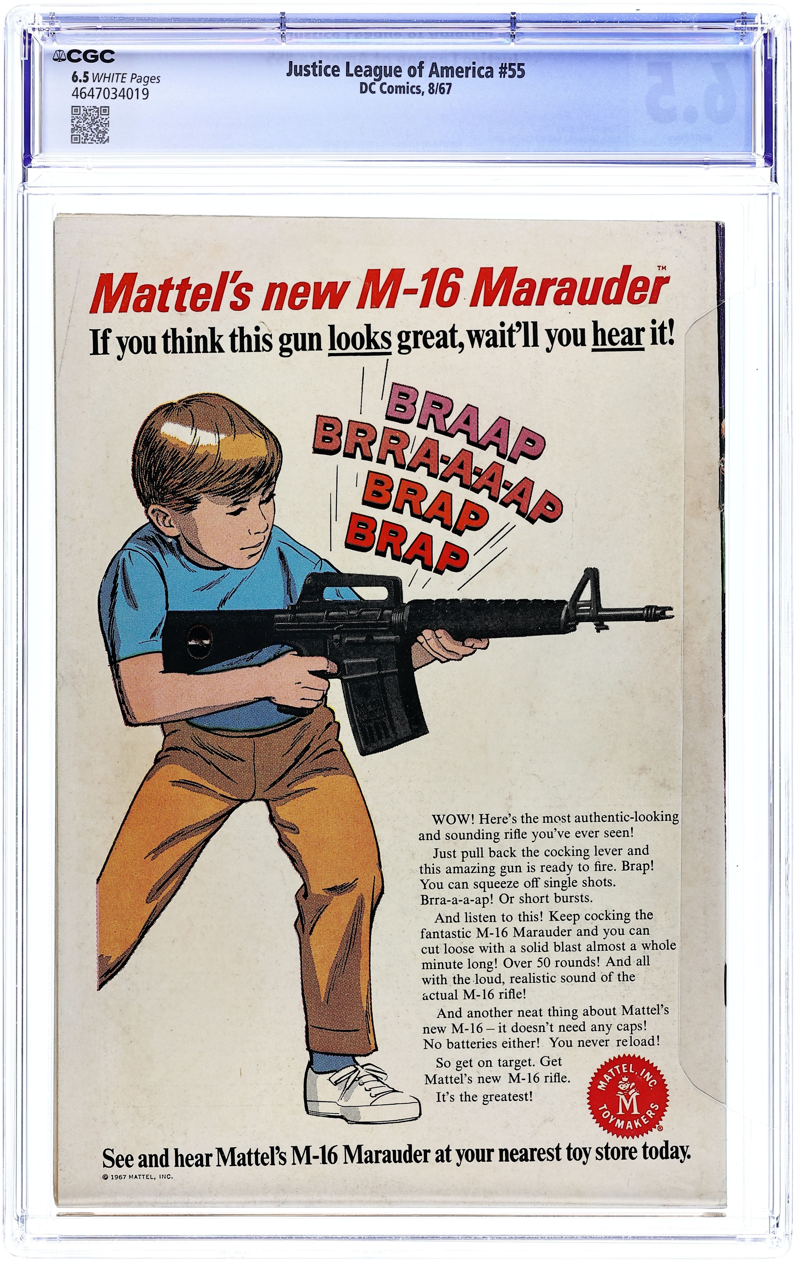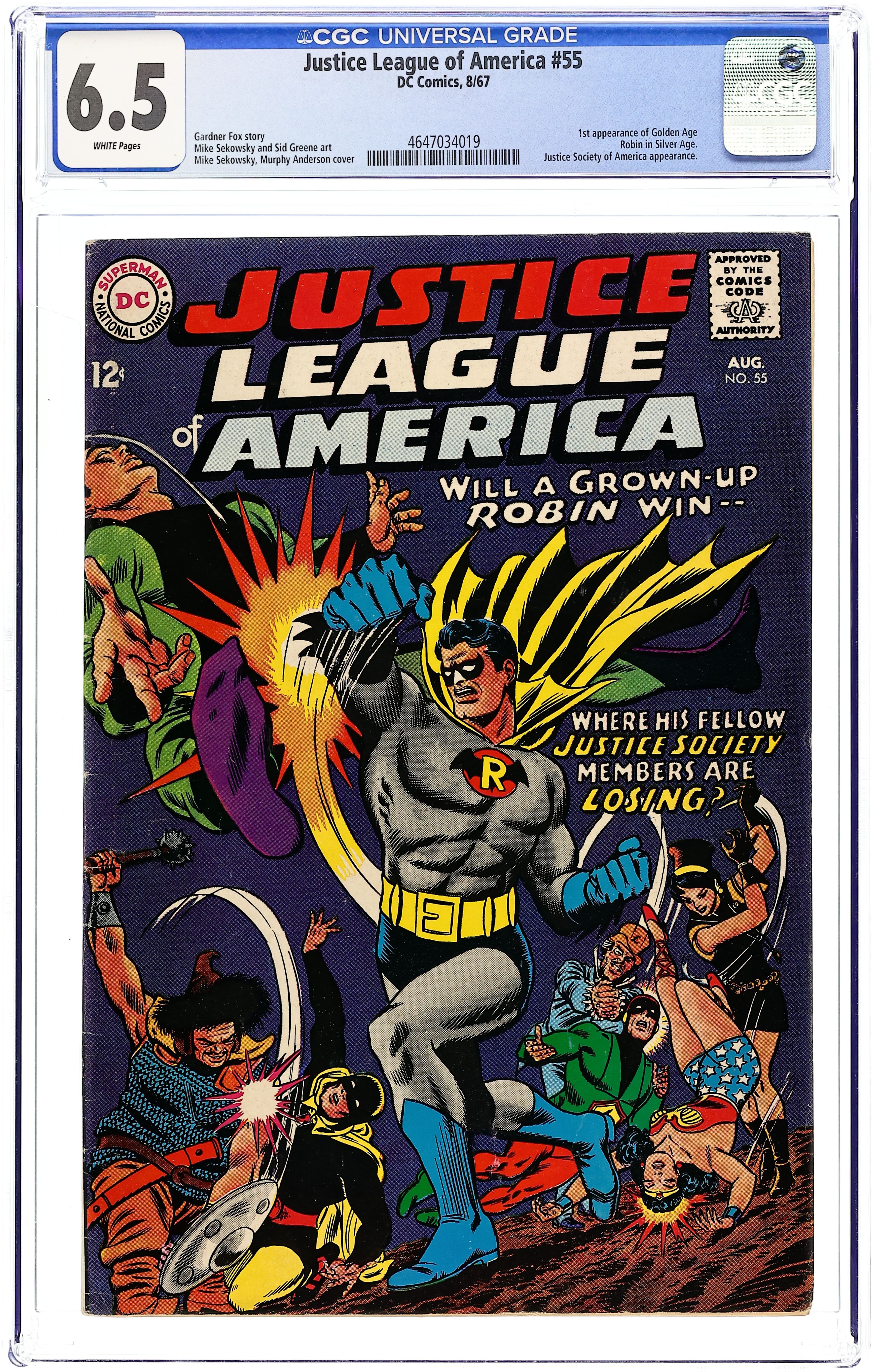 1st Silver Age appearance of Golden Age Robin. Cover pencils by Mike Sekowsky, inks by Murphy Anderson. The Super-Crisis That Struck Earth-Two!, script by Gardner Fox, pencils by Mike Sekowsky, inks by Sid Greene; The JSA, with new member an adult Robin, confront and are defeated by four normal persons on Earth-2, powered by black matter from another universe; When they ask for help from the JLA using Johnny's T-Bolt, he brings them a battered JLA team, suffering the same problem as their counterparts; Both groups them learn the black matter's origins, and resolve to end the problem on Earth-2 first, lest both worlds be destroyed; features the Arrowcar. Letter to the editor from comics writer Bob Rozakis. 36 pgs. $0.12. Cover price $0.12.
