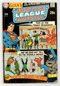 $16.75Giant #G-65. This giant-sized issue reprints "The Cosmic Fun-House!" (script by Gardner Fox, pencils by Mike Sekowsky, inks by Bernard Sachs; from JLA # 7) and "The Last Case of the Justice League" (script by Fox, art by Sekowsky/Sachs; from issue 12). Also featured are two team pin-ups with accompanying text histories. One is a beautiful two-page spread drawn by Murphy Anderson featuring the complete roster of the Golden Age Justice Society of America. The second pin-up, a full-pager, features the Seven Soldiers of Victory. Cool stuff! Cover price $0.25.