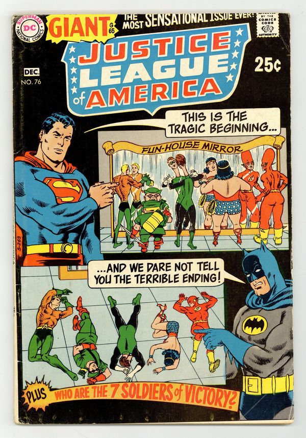 Giant #G-65. This giant-sized issue reprints "The Cosmic Fun-House!" (script by Gardner Fox, pencils by Mike Sekowsky, inks by Bernard Sachs; from JLA # 7) and "The Last Case of the Justice League" (script by Fox, art by Sekowsky/Sachs; from issue 12). Also featured are two team pin-ups with accompanying text histories. One is a beautiful two-page spread drawn by Murphy Anderson featuring the complete roster of the Golden Age Justice Society of America. The second pin-up, a full-pager, features the Seven Soldiers of Victory. Cool stuff! Cover price $0.25.