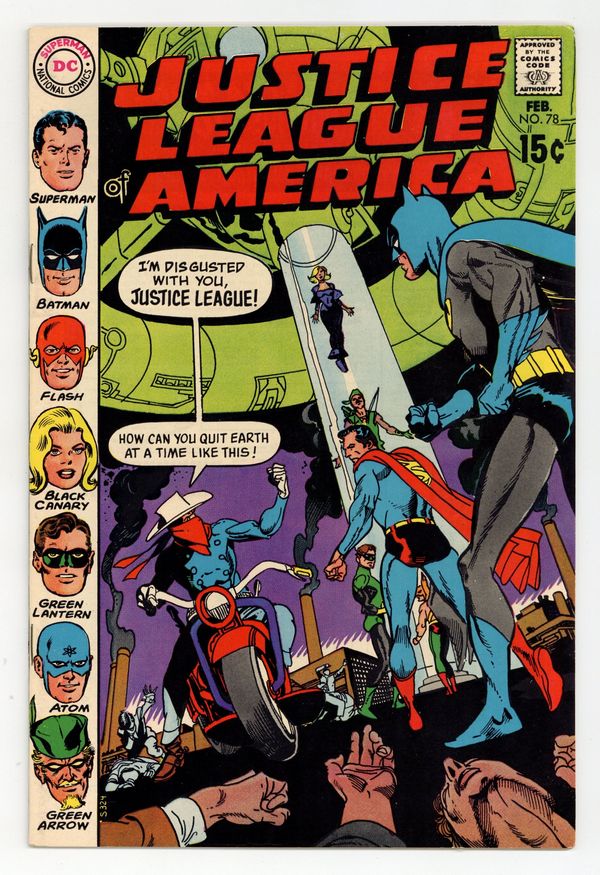 1st Silver Age appearance Vigilante. 1st appearance of the Justice League Satellite. Cover art by Gil Kane. The Coming of the Doomsters, script by Denny O'Neil, pencils by Dick Dillin, inks by Joe Giella; The League moves into their new satellite headquarters, which is located 22,300 miles above the United States. The Man Who Hated Science, script by Jack Miller, art by John Giunta. 36 pgs. $0.15. Cover price $0.15.