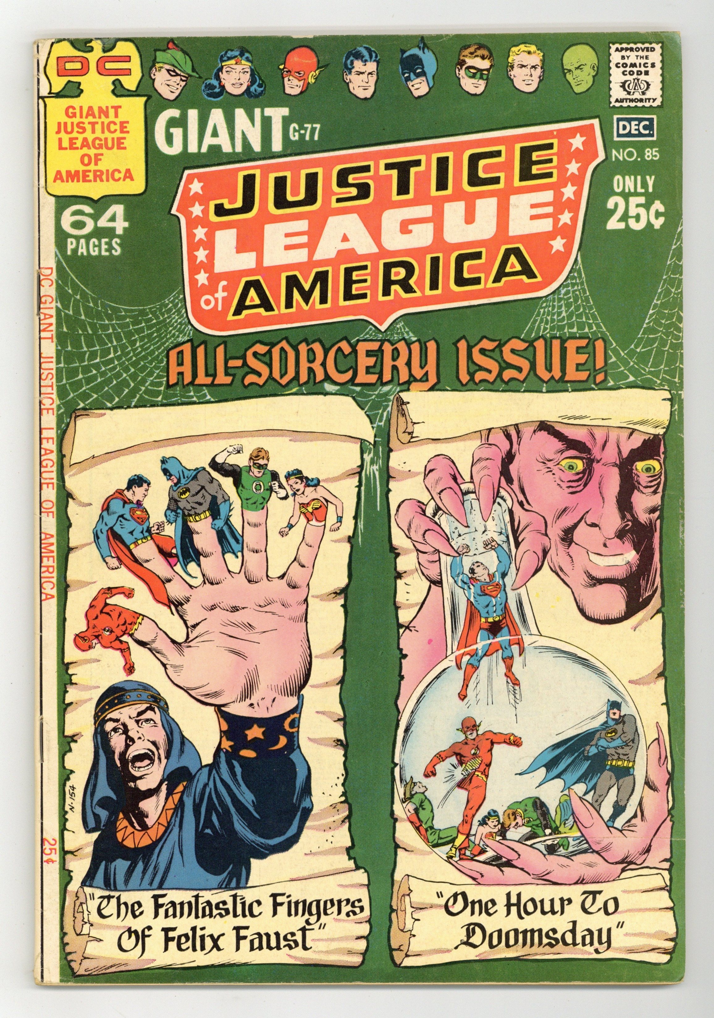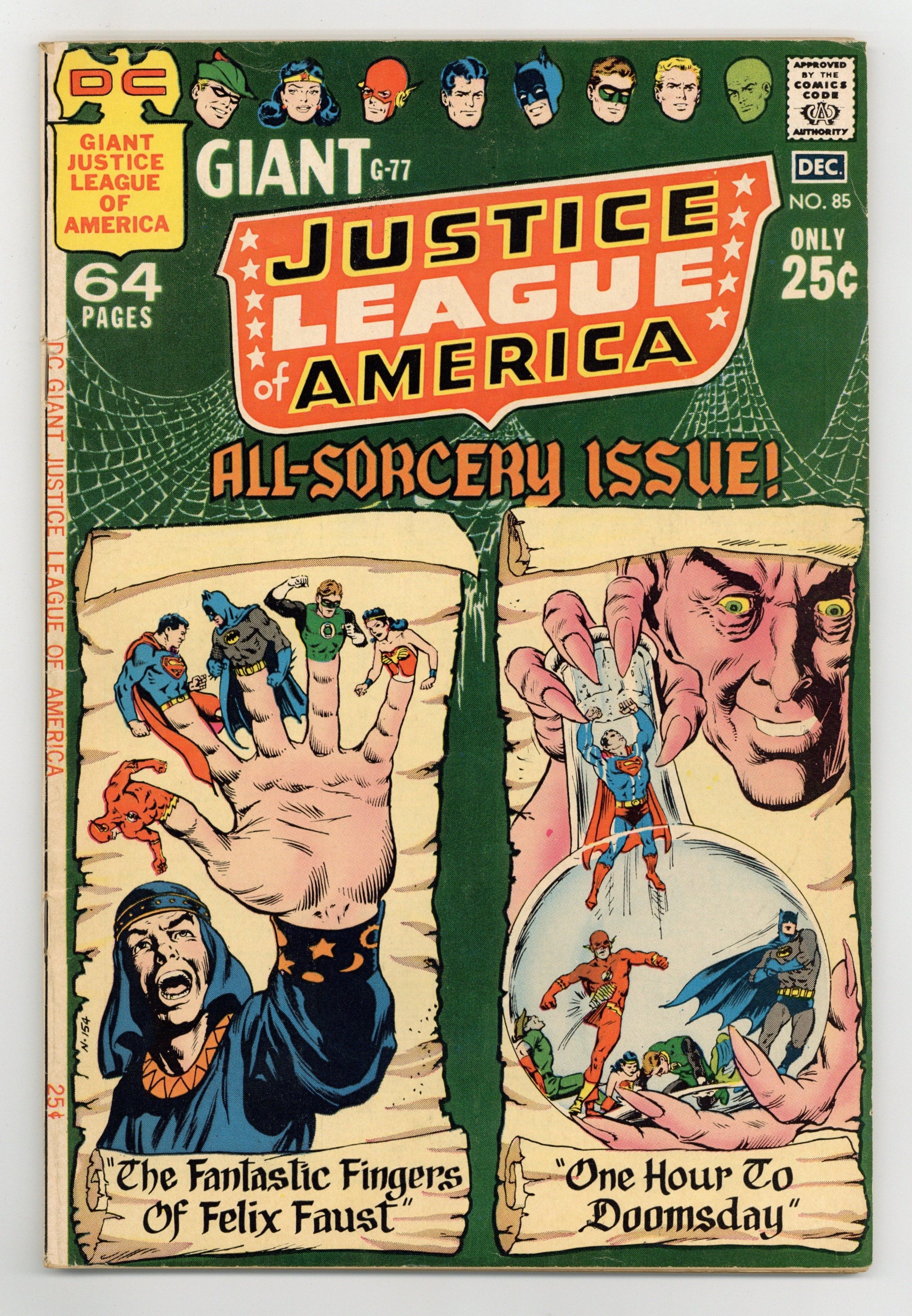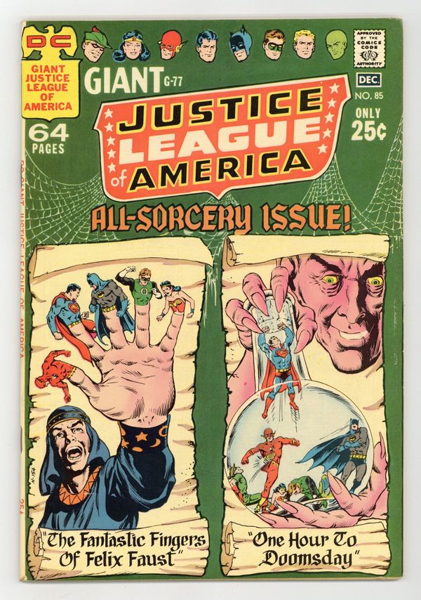 Cover art by Murphy Anderson. Reprints. The Fantastic Fingers of Felix Faust!, script by Gardner Fox, pencils by Mike Sekowsky, inks by Bernard Sachs; Felix Faust learns that the Demons Three--Abnegezar, Rath, and Ghast--can only be freed from a spell involving the Red Jar of Calythos, the Green Bell of Uthool, and the Silver Wheel of Nyorlath, which were hidden long ago by their jailers, the Timeless Ones. Meanwhile, the Lord of Time unleashes warriors of the past and future on the present to steal for him; As the League tries to stop him, they disappear one by one and find themselves under the control of Felix Faust, who orders them to retrieve the items needed to free the Demons Three. One Hour to Doomsday!, script by Gardner Fox, pencils by Mike Sekowsky, inks by Bernard Sachs. Lives of a Rocket Lancer! featuring Knights of the Galaxy, script by Robert Kanigher, pencils by Carmine Infantino, inks by Bernard Sachs. 68 pgs. $0.25. Cover price $0.25.