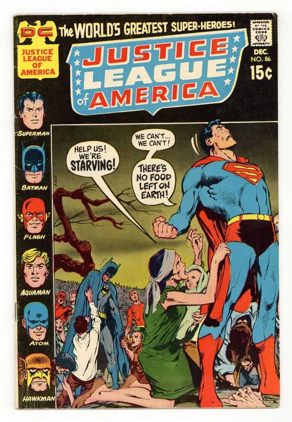 Cover art by Neal Adams. Earth's Final Hour! starring the JLA, Mera (cameo), Aqualad (cameo), The Zapper, and Pajna Darr (flashback), script by Mike Friedrich and Dennis O'Neil (script consultant), pencils by Dick Dillin, inks by Joe Giella; the League deals with a worldwide famine. 32 pgs. $0.15. Cover price $0.15.