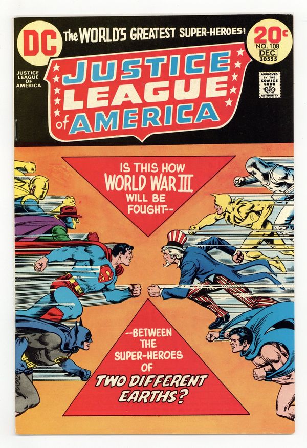 Cover art by Nick Cardy. Thirteen Against the Earth!, script by Len Wein, pencils by Dick Dillin, inks by Dick Giordano; The three teams split up to tackle the machines controlling the Earth, with each machine more difficult to destroy than the last; When the three groups confront the final machine inside of an orbiting satellite, the machine reveals its origins of how the Nazis created it to help run things, but it eventually turned on its creators and Adolf Hitler himself seeing them as inferior per its programming; The last machine is destroyed by Red Tornado's sacrifice yet again, and the three groups, triumphant, return to their respective earths along with the surviving Red Tornado, who chooses to stay on Earth-1. A letter from comics writer Mike W. Barr. 32 pgs. $0.20. Cover price $0.20.