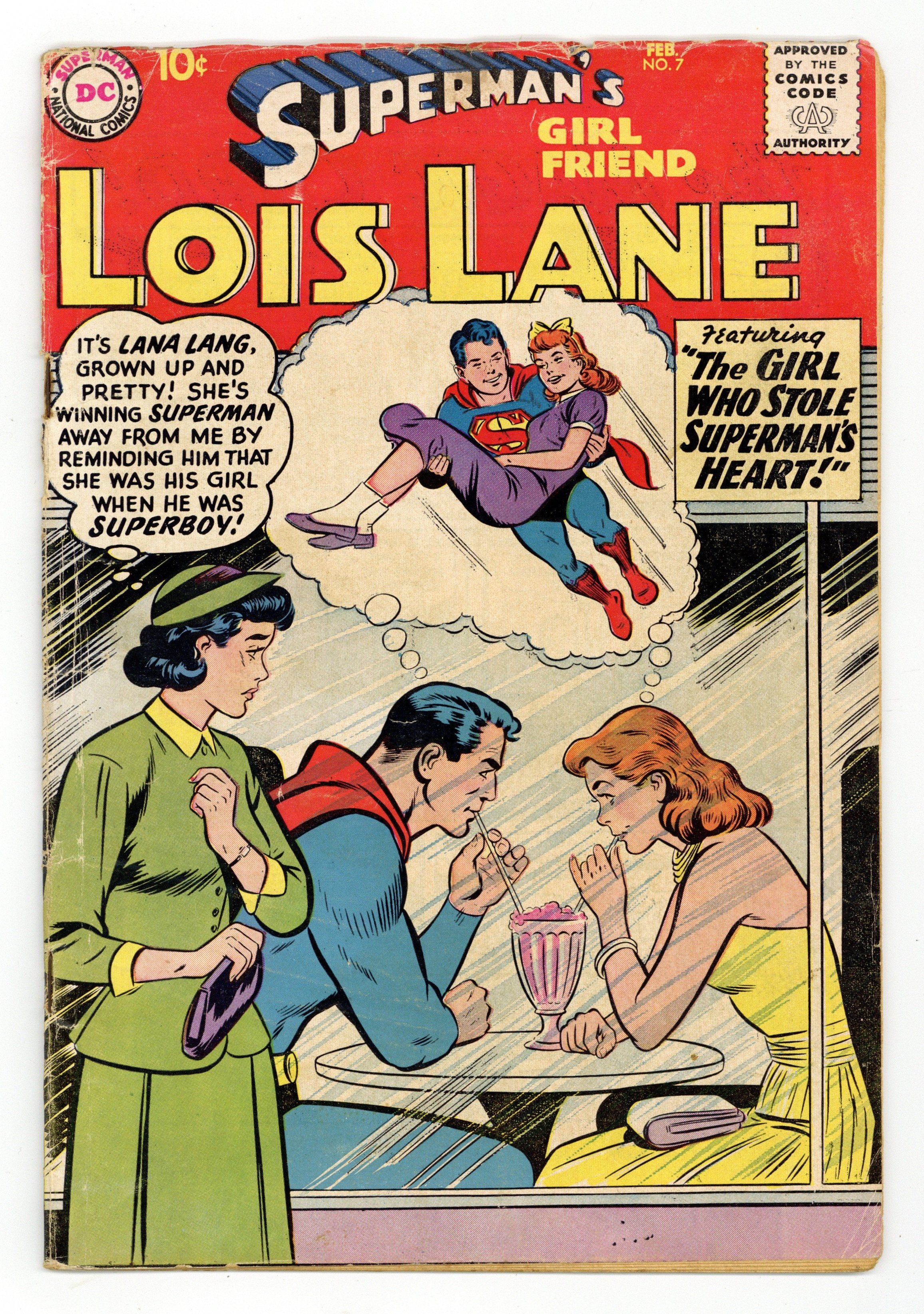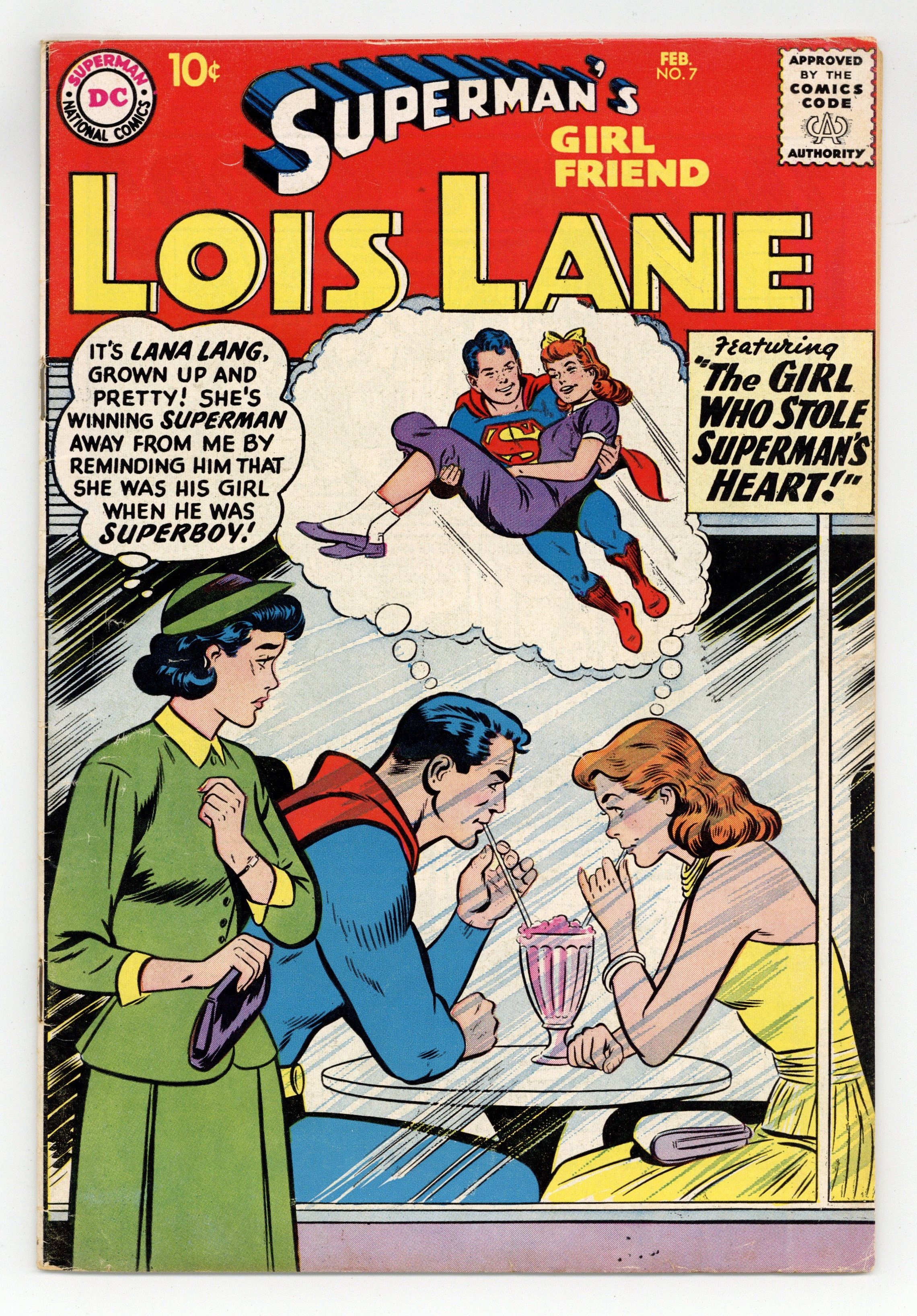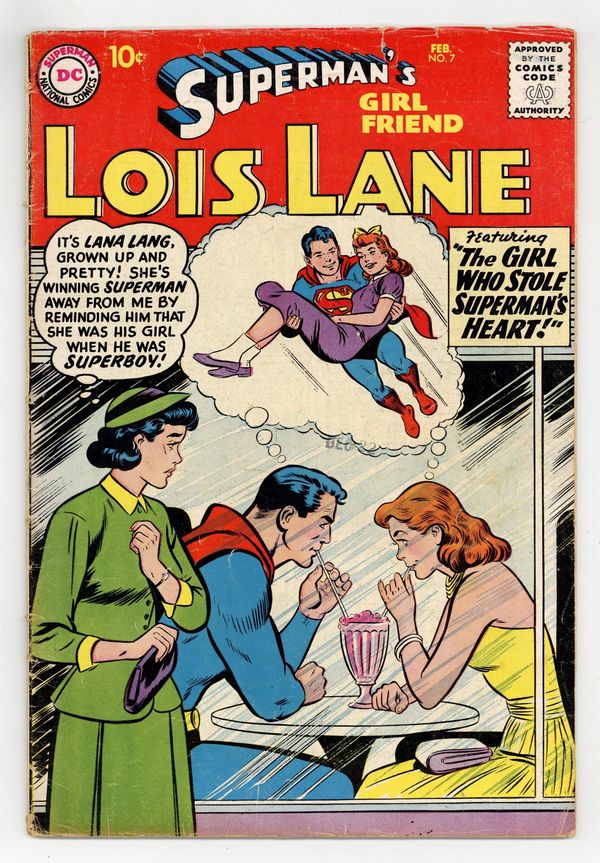 Cover pencils by Curt Swan, inks by Ray Burnley. The Magic Card! public service announcement about the library, script by Jack Schiff, art by Bernard Baily. Lois Lane's Kiss of Death!, script by Robert Bernstein, art by Kurt Schaffenberger; After three men who have kissed Lois die under mysterious circumstances, she develops a reputation of being cursed. House ad for The Flash #105. Meet TV's Lois Lane; Artlcle on Noel Neill, who portrayed Lois Lane in the syndicated television series The Adventures of Superman from 1953 to 1958. When Lois Lane Forgot Superman!, script by Alvin Schwartz, pencils by Wayne Boring, inks by Stan Kaye; Lois has herself hypnotised to forget Superman ever existed -- but then she falls for Clark Kent. Varsity Vic and Little Pete humor pages by Henry Boltinoff. The Girl Who Stole Superman, script by Jerry Coleman, art by Kurt Schaffenberger; Lana comes to stay with Lois when she becomes unemployed, but Lois is convinced Lana is using her to get to Superman. 36 Pages, Full Color. Cover price $0.10.