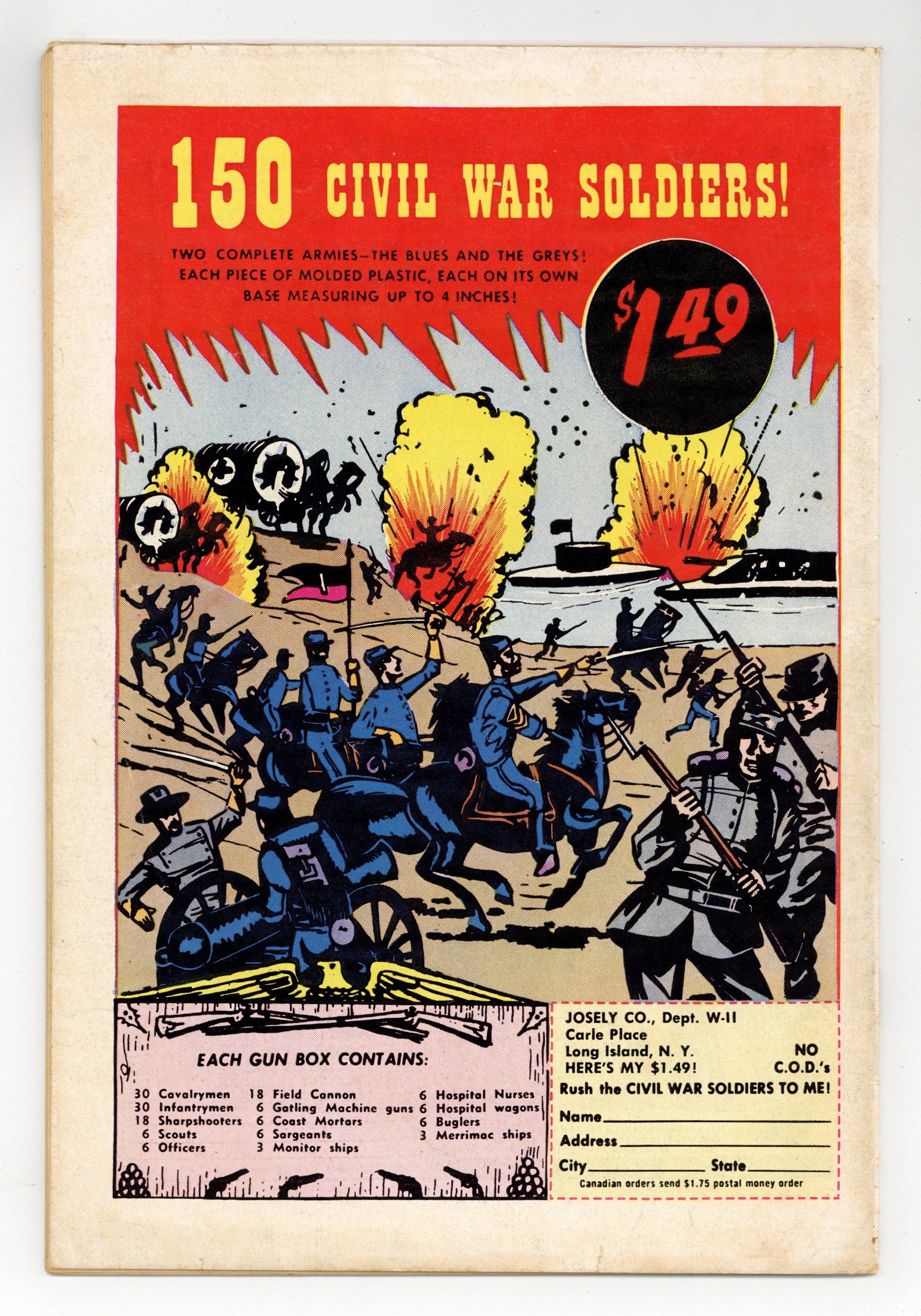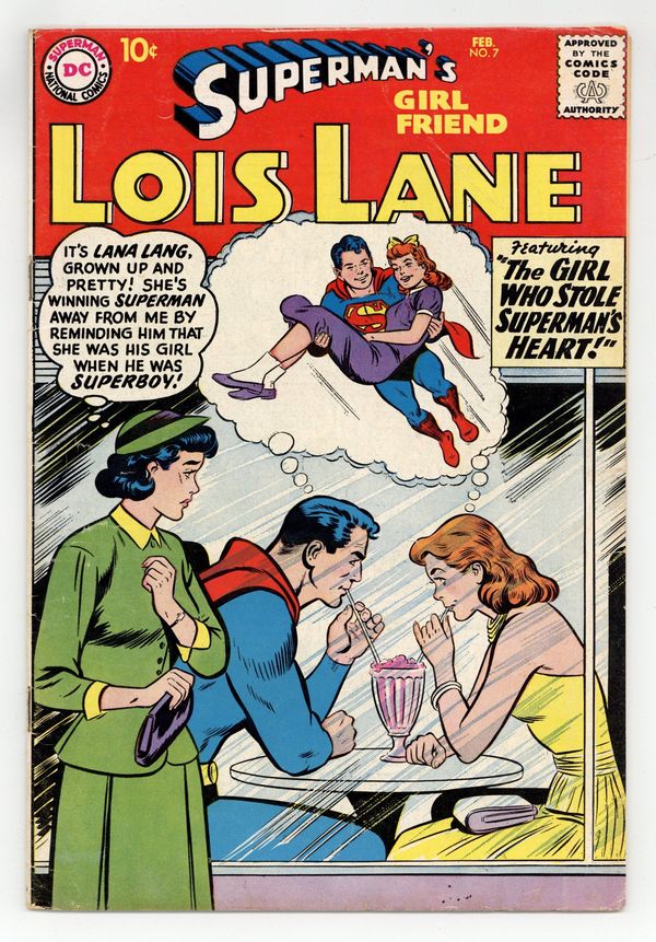Tags: Superman$113.00Cover pencils by Curt Swan, inks by Ray Burnley. The Magic Card! public service announcement about the library, script by Jack Schiff, art by Bernard Baily. Lois Lane's Kiss of Death!, script by Robert Bernstein, art by Kurt Schaffenberger; After three men who have kissed Lois die under mysterious circumstances, she develops a reputation of being cursed. House ad for The Flash #105. Meet TV's Lois Lane; Artlcle on Noel Neill, who portrayed Lois Lane in the syndicated television series The Adventures of Superman from 1953 to 1958. When Lois Lane Forgot Superman!, script by Alvin Schwartz, pencils by Wayne Boring, inks by Stan Kaye; Lois has herself hypnotised to forget Superman ever existed -- but then she falls for Clark Kent. Varsity Vic and Little Pete humor pages by Henry Boltinoff. The Girl Who Stole Superman, script by Jerry Coleman, art by Kurt Schaffenberger; Lana comes to stay with Lois when she becomes unemployed, but Lois is convinced Lana is using her to get to Superman. 36 Pages, Full Color. Cover price $0.10.