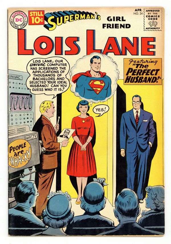 Cover pencils by Curt Swan, inks by Stan Kaye. The Super-Surprise!, art by Kurt Schaffenberger; Superman is baffled when Lois displays super powers, all is revealed when "Lois" is shown to be Sylvia of Kandor. A Salute to Our American Indians! public service announcement, script by Jack Schiff, art by Bernard Baily. The Perfect Husband!, script by Robert Bernstein, art by Kurt Schaffenberger; On the television show "People are Whacky," a computer selects sportsman Roger Warner, a Clark Kent look-alike, to be Lois' ideal husband. House ad for Showcase #31 [featuring Aquaman]. Lois Lane ... Traitor!, script by Robert Bernstein, art by John Forte; When the King of Pahla is nearly assassinated, all the evidence points to Lois as the murderer. 36 Pages, Full Color. Cover price $0.10.
