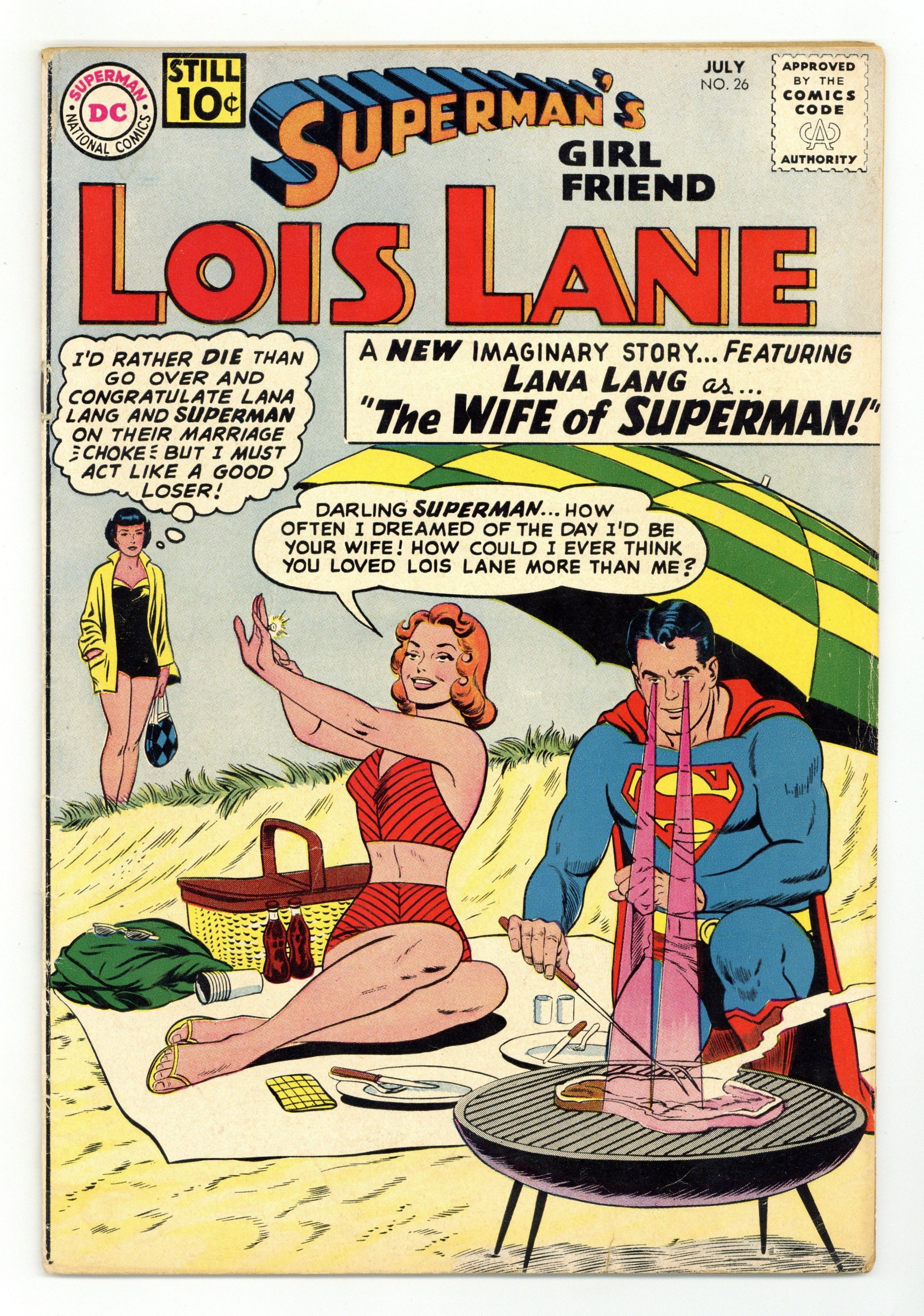 Cover pencils by Curt Swan, inks by John Forte. The Day Superman Married Lana Lang!, art by Kurt Schaffenberger; Superman marries Lana and gives his wife super-powers, crucially, Lana is immune to kryptonite and has to save her husband on numerous occasions. Lois Lane's Childhood, script by Jerry Siegel, art by Kurt Schaffenberger; Lois and Kal-El's childhood are paralleled on different worlds, amazingly the future Superman is still able to save Lois's life. The Mad Woman of Metropolis!, script by Robert Bernstein, art by Kurt Schaffenberger; "Killer" Meigs' men try to convince Lois she is going insane to get revenge for her helping put their boss in prison. House ad for Superman Annual #3. House ad for Secret Origins #1. 36 Pages, Full Color. Cover price $0.10.