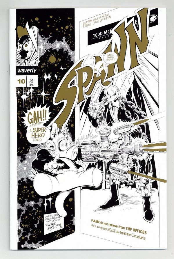 Published Dec 2020 by Aardvark-Vanaheim.$25.00Standard Gold Variant C Cover - Limited to 350 copies. A 48 page deluxe, expanded edition with updated art, new covers, and rarities! Cover by Todd McFarlane, Dave Sim. Story by Dave Sim. Art by Todd McFarlane, Dave Sim. "Crossing Over!" Guest-starring Cerebus. Todd Mcfarlane's masterful inking style radically changed the aesthetics of comic-books forever. Transforming the 1980s homogeneous bullpen style of the Big 2 to the hyper-dynamic style that dominates the modern era. McFarlane's loose, detailed, energetic art alongside Sims cartoon realism brush and line work highlights the power of each artist in the pages of this new edition of SPAWN No. 10! Still as fresh and relevant today as when it first appeared, Dave Sim and Aardvark-Vanaheim have partnered with The Waverly Press to present Sim's new modified version of this classic tale published nearly three decades ago, expanded with new content and rarities from this comics milestone. While the original edition of SPAWN No. 10 was published in full color, this special edition - at Dave Sims insistence - presents the story in black and white. In the original edition, McFarlane drew what Dave Sim has called the definitive Cerebus (...more people saw Todds Cerebus that one month than had seen my Cerebus in the decade prior to SPAWN No. 10). "Remastered" pages with Dave Sim's new art! Working gingerly and painstakingly around his career-ending (2015) wrist ailment, Sim fulfilled what he calls a last ambition to render the Kitchener Sequence as he originally pictured it. He also redrew the Cerebus figures throughout the issue. B&W. 48pgs.