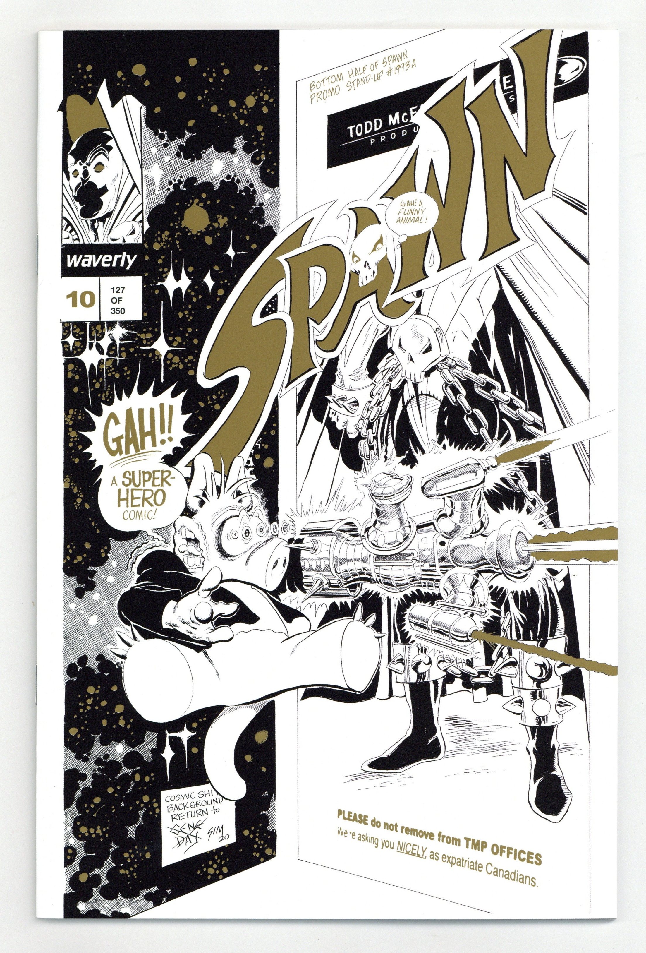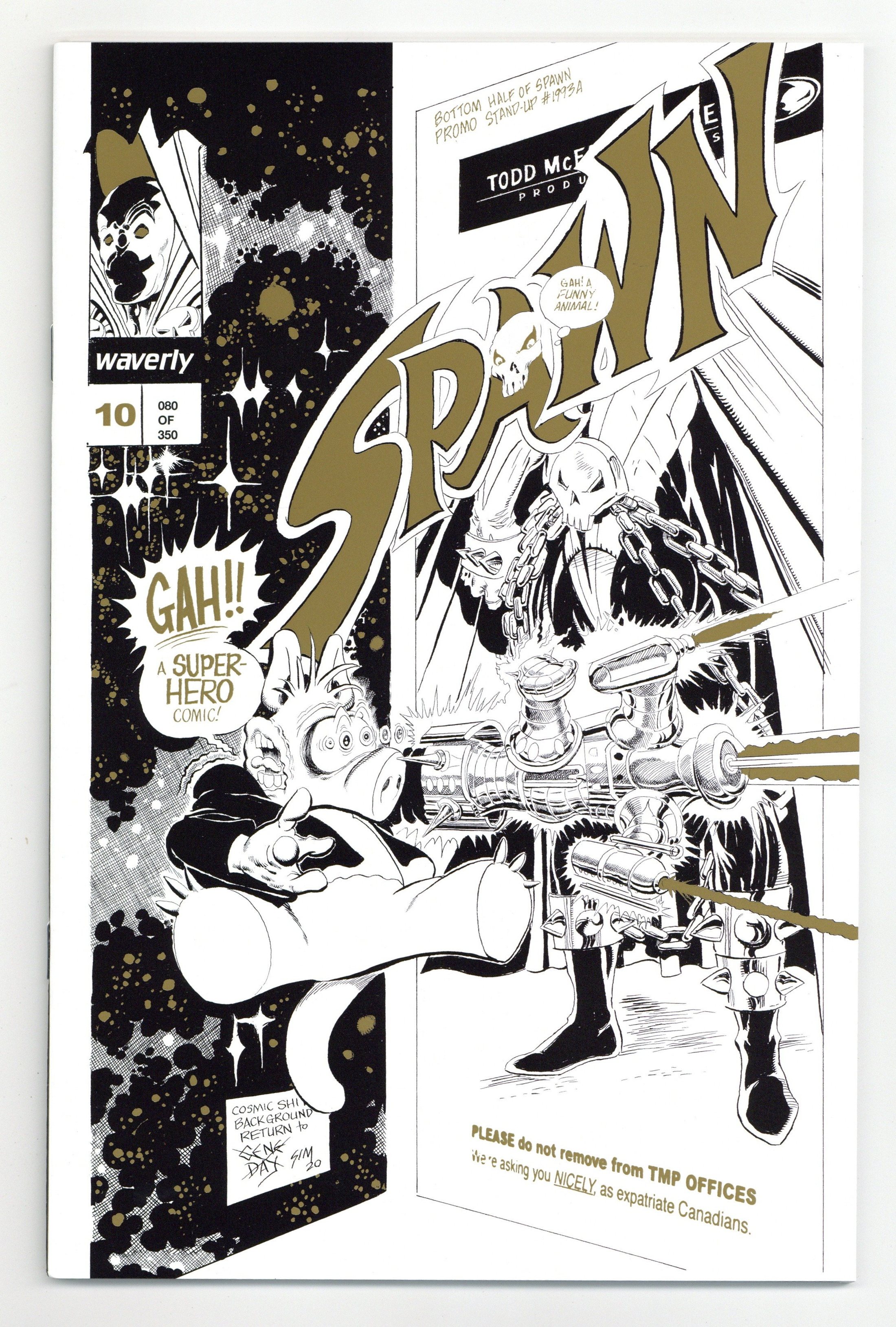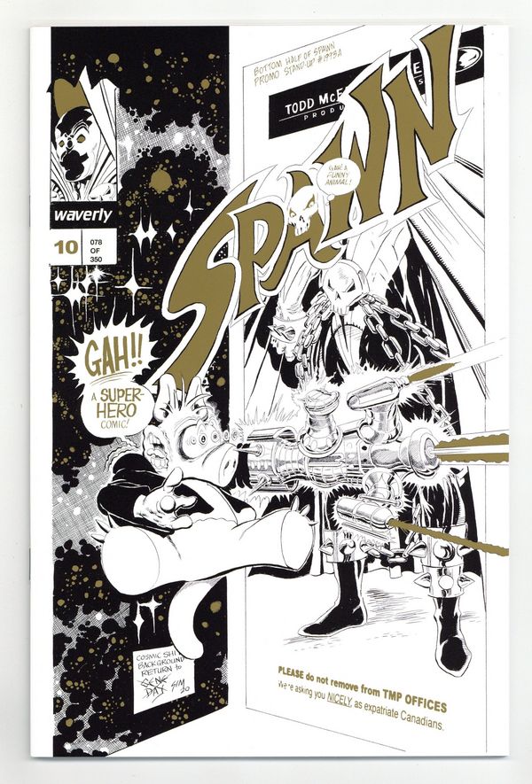 Standard Gold Variant C Cover - Limited to 350 copies. A 48 page deluxe, expanded edition with updated art, new covers, and rarities! Cover by Todd McFarlane, Dave Sim. Story by Dave Sim. Art by Todd McFarlane, Dave Sim. "Crossing Over!" Guest-starring Cerebus. Todd Mcfarlane's masterful inking style radically changed the aesthetics of comic-books forever. Transforming the 1980s homogeneous bullpen style of the Big 2 to the hyper-dynamic style that dominates the modern era. McFarlane's loose, detailed, energetic art alongside Sims cartoon realism brush and line work highlights the power of each artist in the pages of this new edition of SPAWN No. 10! Still as fresh and relevant today as when it first appeared, Dave Sim and Aardvark-Vanaheim have partnered with The Waverly Press to present Sim's new modified version of this classic tale published nearly three decades ago, expanded with new content and rarities from this comics milestone. While the original edition of SPAWN No. 10 was published in full color, this special edition - at Dave Sims insistence - presents the story in black and white. In the original edition, McFarlane drew what Dave Sim has called the definitive Cerebus (...more people saw Todds Cerebus that one month than had seen my Cerebus in the decade prior to SPAWN No. 10). "Remastered" pages with Dave Sim's new art! Working gingerly and painstakingly around his career-ending (2015) wrist ailment, Sim fulfilled what he calls a last ambition to render the Kitchener Sequence as he originally pictured it. He also redrew the Cerebus figures throughout the issue. B&W. 48pgs.