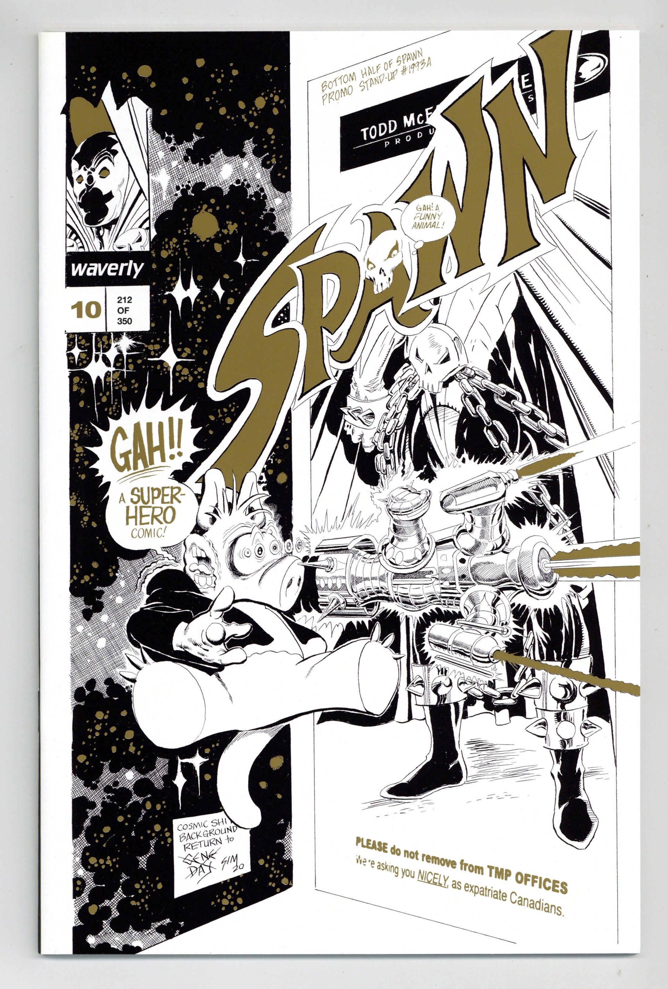 Published Dec 2020 by Aardvark-Vanaheim.$30.00Standard Gold Variant C Cover - Limited to 350 copies. A 48 page deluxe, expanded edition with updated art, new covers, and rarities! Cover by Todd McFarlane, Dave Sim. Story by Dave Sim. Art by Todd McFarlane, Dave Sim. "Crossing Over!" Guest-starring Cerebus. Todd Mcfarlane's masterful inking style radically changed the aesthetics of comic-books forever. Transforming the 1980s homogeneous bullpen style of the Big 2 to the hyper-dynamic style that dominates the modern era. McFarlane's loose, detailed, energetic art alongside Sims cartoon realism brush and line work highlights the power of each artist in the pages of this new edition of SPAWN No. 10! Still as fresh and relevant today as when it first appeared, Dave Sim and Aardvark-Vanaheim have partnered with The Waverly Press to present Sim's new modified version of this classic tale published nearly three decades ago, expanded with new content and rarities from this comics milestone. While the original edition of SPAWN No. 10 was published in full color, this special edition - at Dave Sims insistence - presents the story in black and white. In the original edition, McFarlane drew what Dave Sim has called the definitive Cerebus (...more people saw Todds Cerebus that one month than had seen my Cerebus in the decade prior to SPAWN No. 10). "Remastered" pages with Dave Sim's new art! Working gingerly and painstakingly around his career-ending (2015) wrist ailment, Sim fulfilled what he calls a last ambition to render the Kitchener Sequence as he originally pictured it. He also redrew the Cerebus figures throughout the issue. B&W. 48pgs.