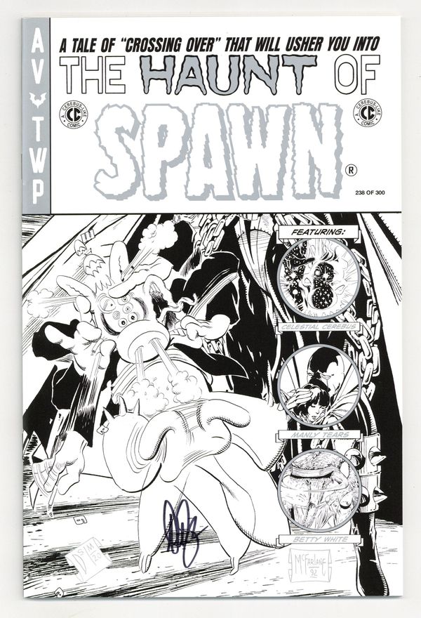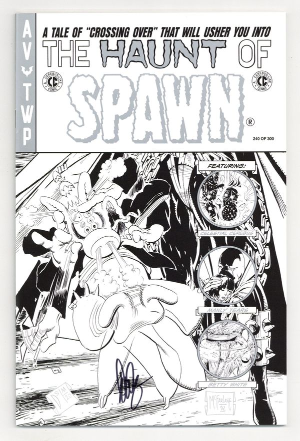 Published Dec 2020 by Aardvark-Vanaheim.$24.00Classic Platinum Variant A Cover - Signed by Dave Sim - Limited to 300 copies. A 48 page deluxe, expanded edition with updated art, new covers, and rarities! Cover by Todd McFarlane, Dave Sim. Story by Dave Sim. Art by Todd McFarlane, Dave Sim. "Crossing Over!" Guest-starring Cerebus. Todd Mcfarlane's masterful inking style radically changed the aesthetics of comic-books forever. Transforming the 1980s homogeneous bullpen style of the Big 2 to the hyper-dynamic style that dominates the modern era. McFarlane's loose, detailed, energetic art alongside Sims cartoon realism brush and line work highlights the power of each artist in the pages of this new edition of SPAWN No. 10! Still as fresh and relevant today as when it first appeared, Dave Sim and Aardvark-Vanaheim have partnered with The Waverly Press to present Sim's new modified version of this classic tale published nearly three decades ago, expanded with new content and rarities from this comics milestone. While the original edition of SPAWN No. 10 was published in full color, this special edition - at Dave Sims insistence - presents the story in black and white. In the original edition, McFarlane drew what Dave Sim has called the definitive Cerebus (...more people saw Todd's Cerebus that one month than had seen my Cerebus in the decade prior to SPAWN No. 10). "Remastered" pages with Dave Sim's new art! Working gingerly and painstakingly around his career-ending (2015) wrist ailment, Sim fulfilled what he calls a last ambition to render the Kitchener Sequence as he originally pictured it. He also redrew the Cerebus figures throughout the issue. B&W. 48pgs.