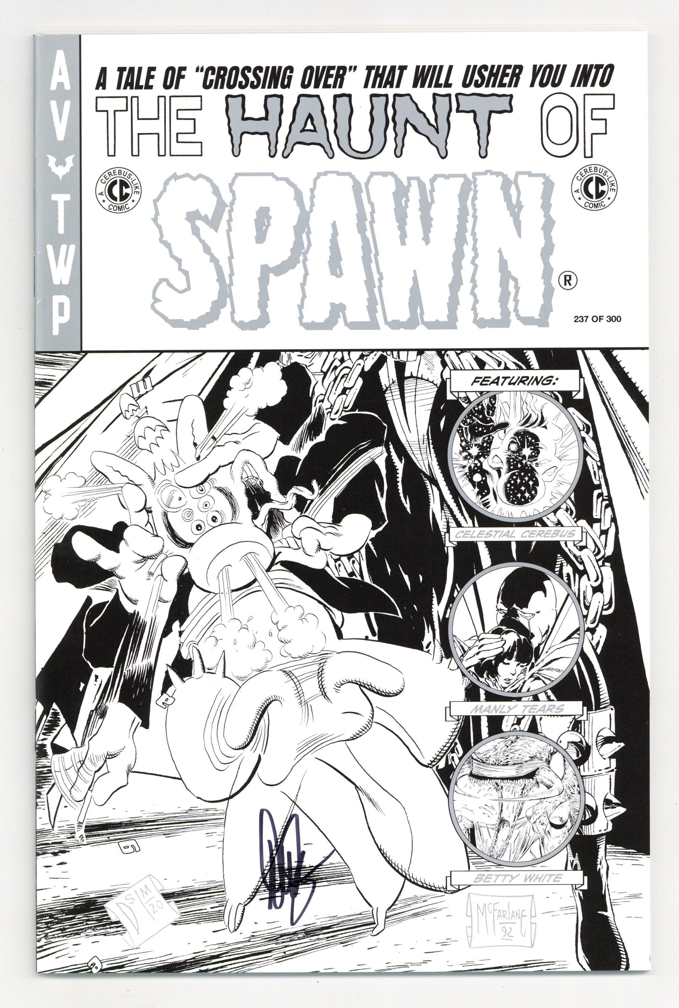 Published Dec 2020 by Aardvark-Vanaheim.$22.00Classic Platinum Variant A Cover - Signed by Dave Sim - Limited to 300 copies. A 48 page deluxe, expanded edition with updated art, new covers, and rarities! Cover by Todd McFarlane, Dave Sim. Story by Dave Sim. Art by Todd McFarlane, Dave Sim. "Crossing Over!" Guest-starring Cerebus. Todd Mcfarlane's masterful inking style radically changed the aesthetics of comic-books forever. Transforming the 1980s homogeneous bullpen style of the Big 2 to the hyper-dynamic style that dominates the modern era. McFarlane's loose, detailed, energetic art alongside Sims cartoon realism brush and line work highlights the power of each artist in the pages of this new edition of SPAWN No. 10! Still as fresh and relevant today as when it first appeared, Dave Sim and Aardvark-Vanaheim have partnered with The Waverly Press to present Sim's new modified version of this classic tale published nearly three decades ago, expanded with new content and rarities from this comics milestone. While the original edition of SPAWN No. 10 was published in full color, this special edition - at Dave Sims insistence - presents the story in black and white. In the original edition, McFarlane drew what Dave Sim has called the definitive Cerebus (...more people saw Todd's Cerebus that one month than had seen my Cerebus in the decade prior to SPAWN No. 10). "Remastered" pages with Dave Sim's new art! Working gingerly and painstakingly around his career-ending (2015) wrist ailment, Sim fulfilled what he calls a last ambition to render the Kitchener Sequence as he originally pictured it. He also redrew the Cerebus figures throughout the issue. B&W. 48pgs.