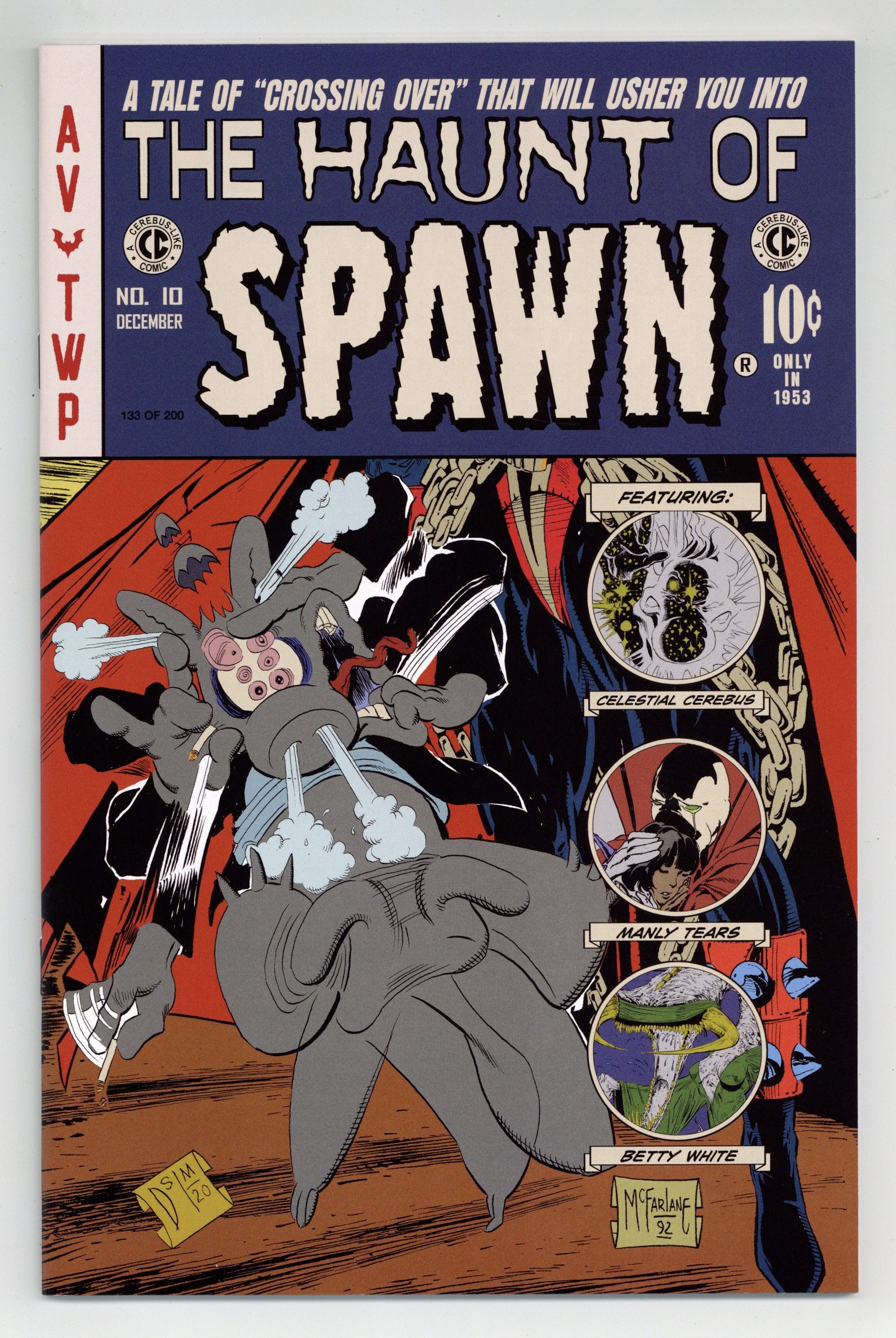 Published Dec 2020 by Aardvark-Vanaheim.$25.00Classic Cover A variant - Limited to 200 copies. A 48 page deluxe, expanded edition with updated art, new covers, and rarities! Cover by Todd McFarlane, Dave Sim, Benjamin Hobbs. Story by Dave Sim. Art by Todd McFarlane, Dave Sim. "Crossing Over!" Guest-starring Cerebus. Todd Mcfarlane's masterful inking style radically changed the aesthetics of comic-books forever. Transforming the 1980s homogeneous bullpen style of the Big 2 to the hyper-dynamic style that dominates the modern era. McFarlane's loose, detailed, energetic art alongside Sims cartoon realism brush and line work highlights the power of each artist in the pages of this new edition of SPAWN No. 10! Still as fresh and relevant today as when it first appeared, Dave Sim and Aardvark-Vanaheim have partnered with The Waverly Press to present Sim's new modified version of this classic tale published nearly three decades ago, expanded with new content and rarities from this comics milestone. While the original edition of SPAWN No. 10 was published in full color, this special edition - at Dave Sims insistence - presents the story in black and white. In the original edition, McFarlane drew what Dave Sim has called the definitive Cerebus (...more people saw Todds Cerebus that one month than had seen my Cerebus in the decade prior to SPAWN No. 10). "Remastered" pages with Dave Sim's new art! Working gingerly and painstakingly around his career-ending (2015) wrist ailment, Sim fulfilled what he calls a last ambition to render the Kitchener Sequence as he originally pictured it. He also redrew the Cerebus figures throughout the issue. B&W. 48pgs.