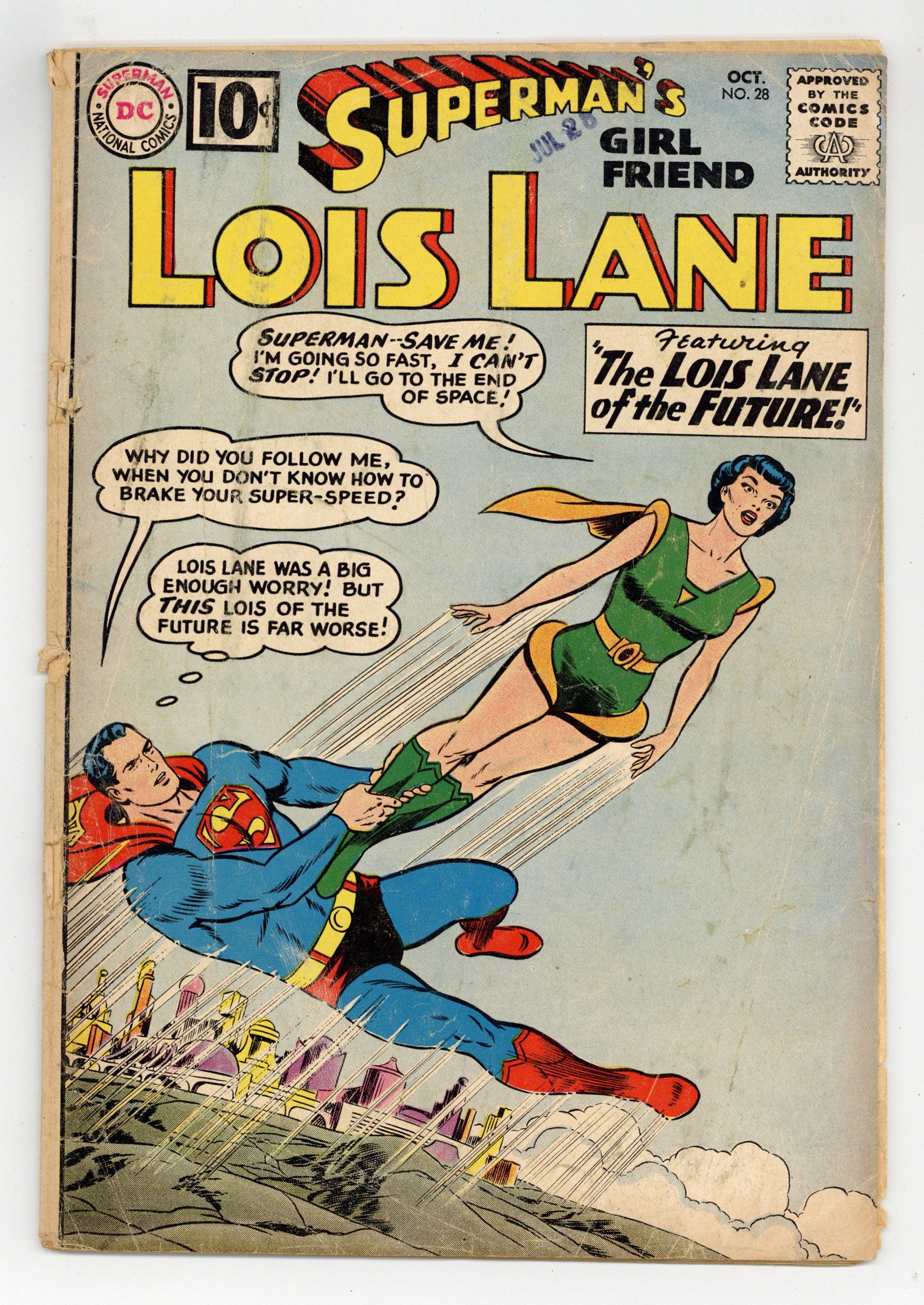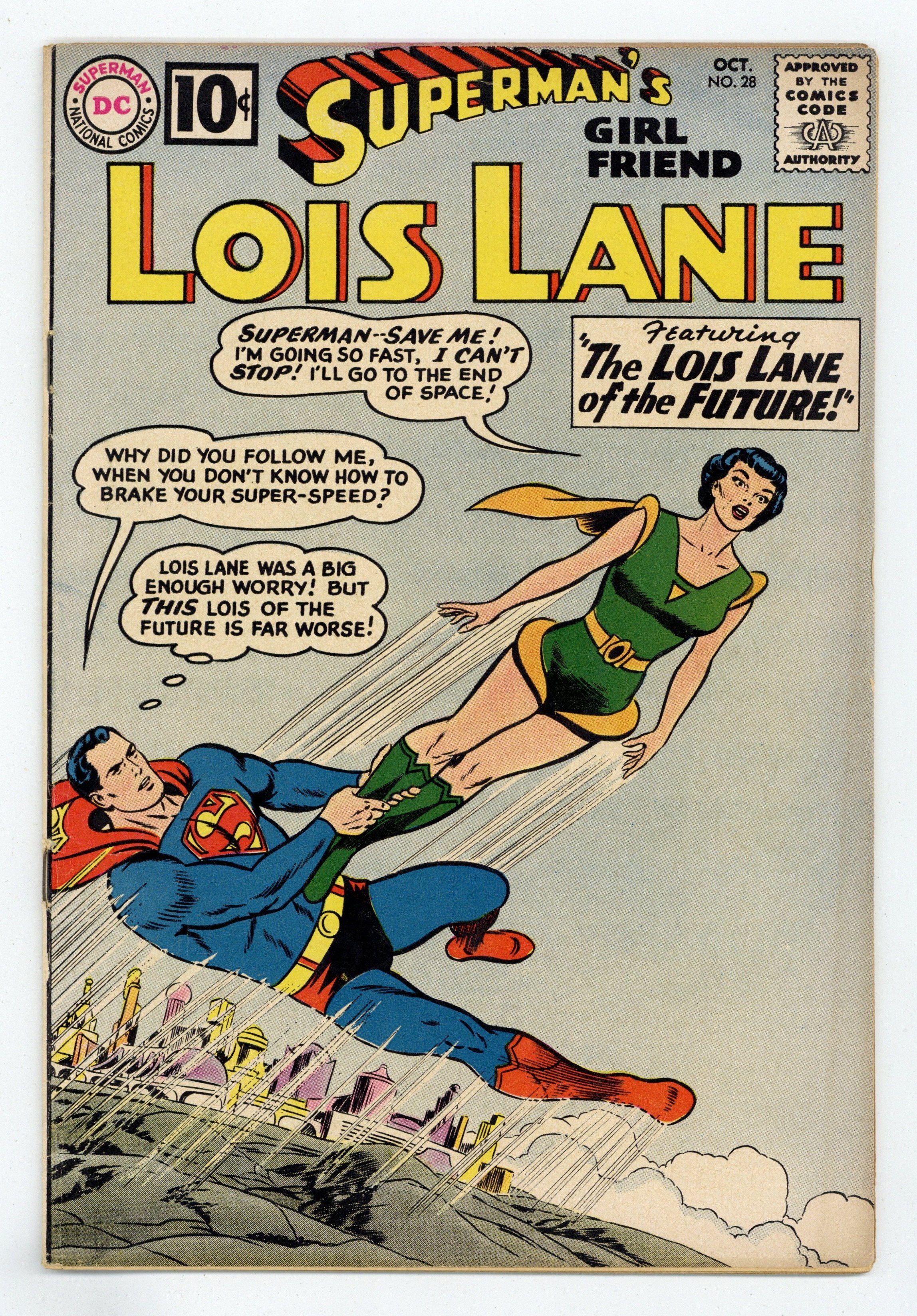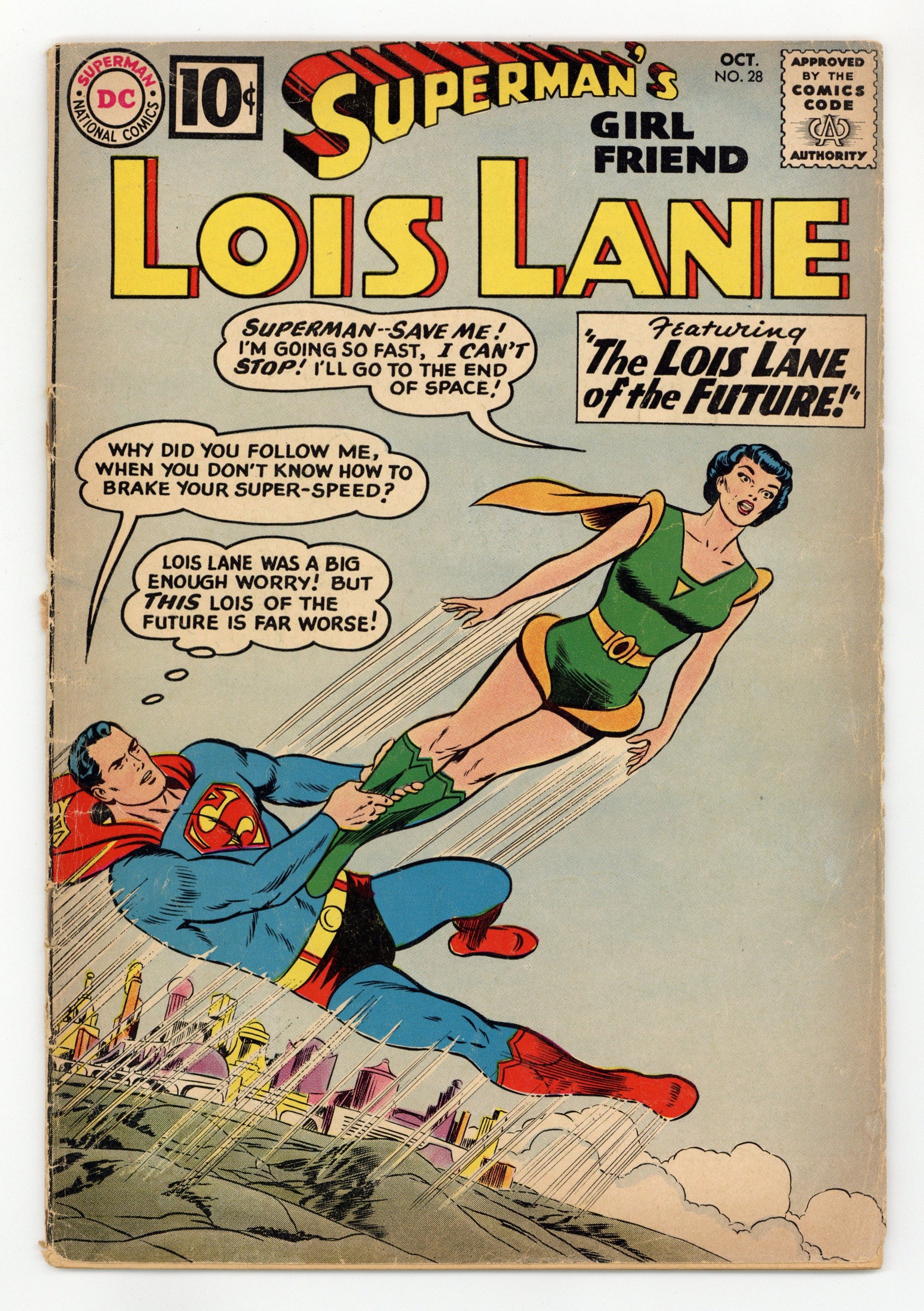Cover pencils by Curt Swan, inks by Stan Kaye. The Lois Lane of the Future!, art by John Forte; Luthor's newest invention sends Superman a thousand years into the future, where he meets the super-powered Lois 4XR and tries to figure out if she is descended from him and Lois Lane. Lois Lane's Super-Lesson!, script by Jerry Siegel, art by Kurt Schaffenberger; Lois agrees to marry the Rajah Bandhi if he can complete five super feats. House ad for Superman Annual #3. Lois Lane, Gun-Moll!, script by Bill Finger, art by Kurt Schaffenberger; When a machine that can bring out any evil in a person is used on Lois, she becomes Leopard Lady and marries Lex Luthor. 36 Pages, Full Color. Cover price $0.10.