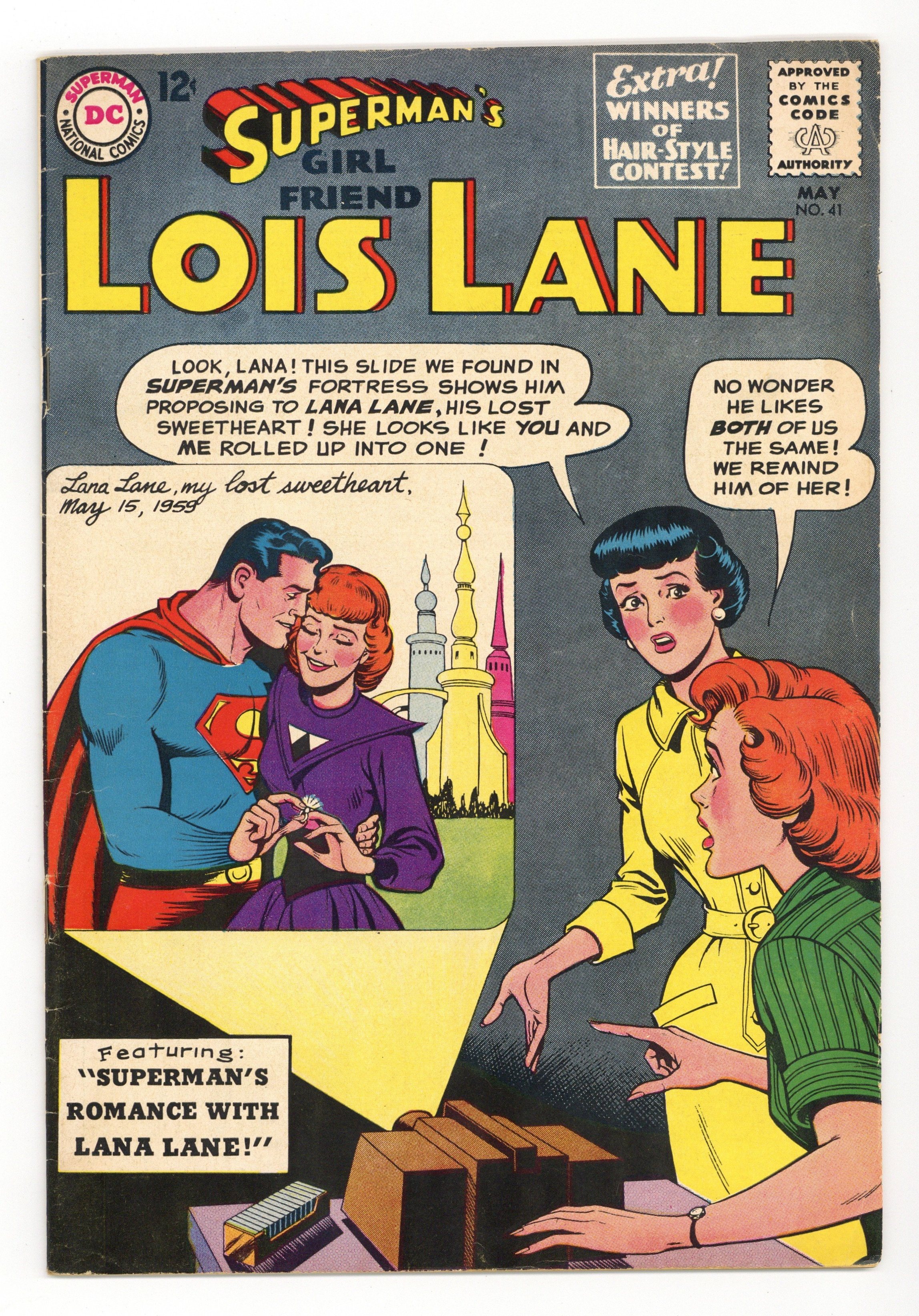 Cover art by Kurt Schaffenberger. The Devil and Lois Lane!, script by Leo Dorfman, art by Kurt Schaffenberger; When Superman overhears Lois tell her college boyfriend, Lance Jason, that she would sell her soul to the devil for a chance to marry Superman, he decides to teach her a lesson and masquerades as Satan, offering Lois her dream marriage in exchange for her soul. Winners of Lois Lane Hair-Style Contest. The Super-Suitor of Soomar!, art by Kurt Schaffenberger; Lois visits the planet Soomar where she meets a girl reporter much like herself, except that she resists the attentions of Soomar's super-hero, Super-Male. Superman's Romance with Lana Lane!, pencils by Curt Swan, inks by George Klein; While visiting Superman's Fortress, Lois and Lana find a picture of Superman proposing to a girl who looks like both of them. 36 Pages, Full Color. Cover price $0.12.