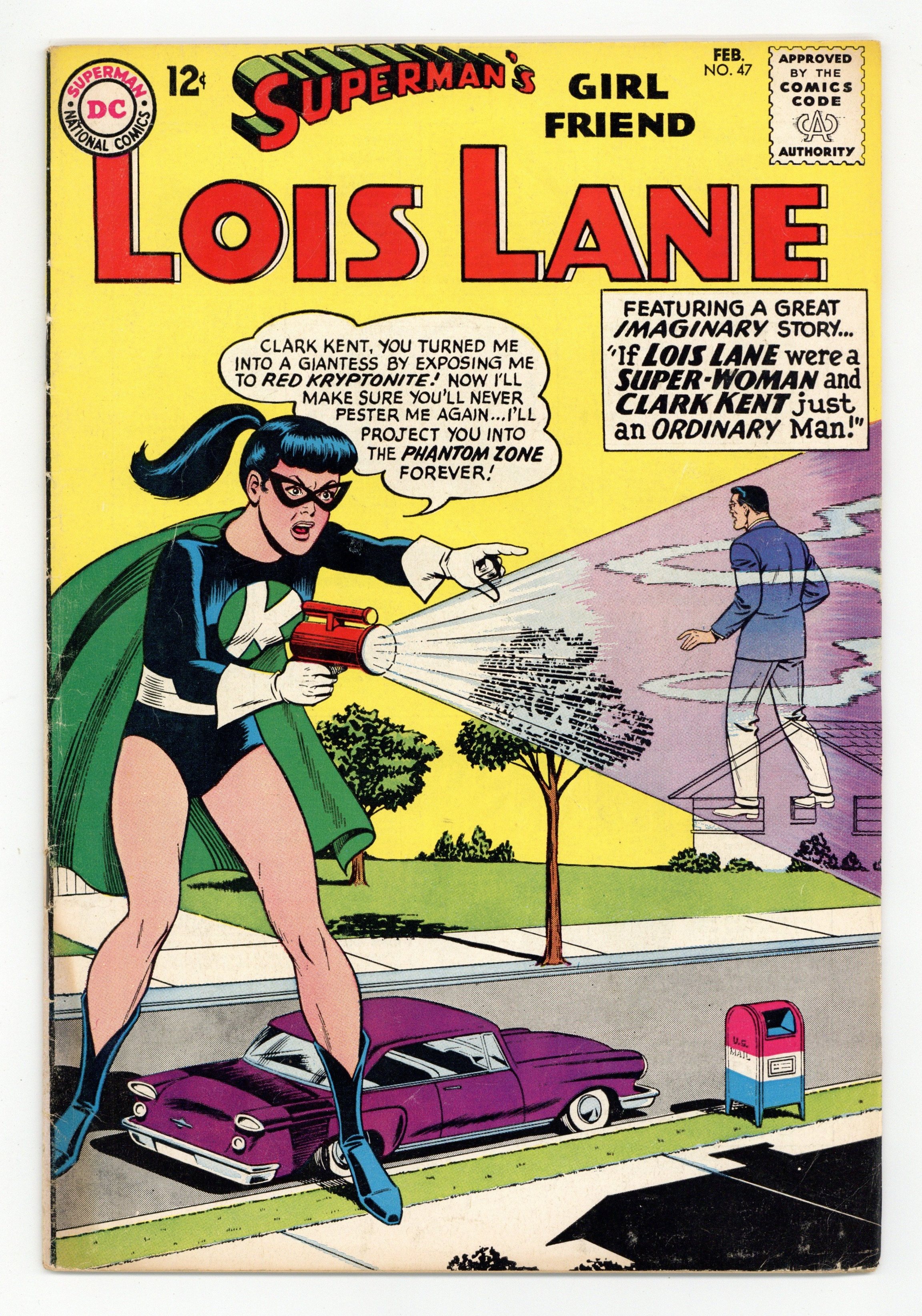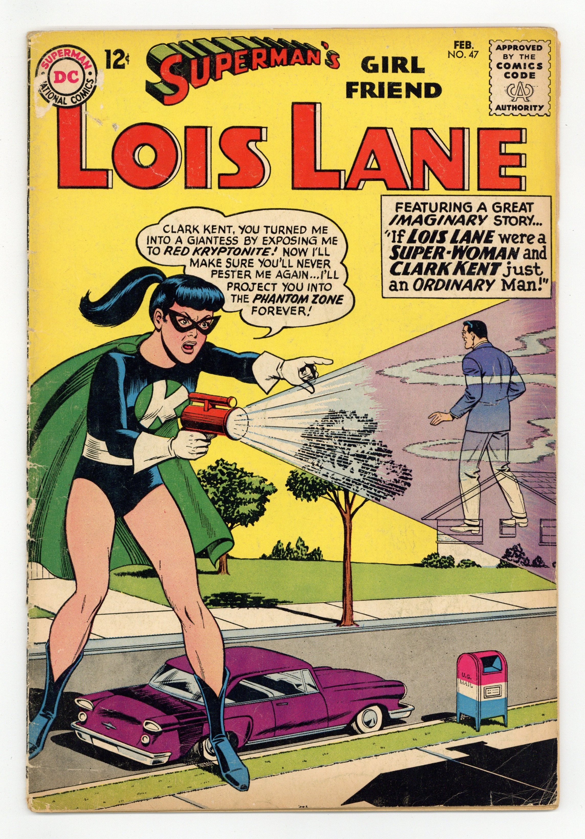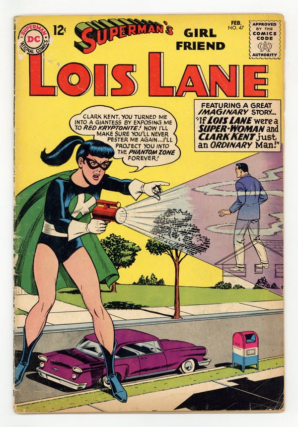 Tags: Superman$17.99Cover art by Kurt Schaffenberger. The Incredible Delusion!, art by Kurt Schaffenberger; Lois believes that the Perry White that has returned from vacation is an imposter. Special Christmas Quiz, script by Jack Schiff, art by Ruben Moreira. Lois Lane's Jungle Jeopardy!, art by Kurt Schaffenberger; Lois Lane travels to the Amazon with the Peace Corps; Secretly she is on the trail of the jewel thief Stace Lorin. The Super-Life of Lois Lane!, art by Kurt Schaffenberger; Lois Lane uses a super-computer to view what life would have been like if she was from Krypton instead of Clark. House ad for The Brave and the Bold #52. 36 Pages, Full Color. Cover price $0.12.