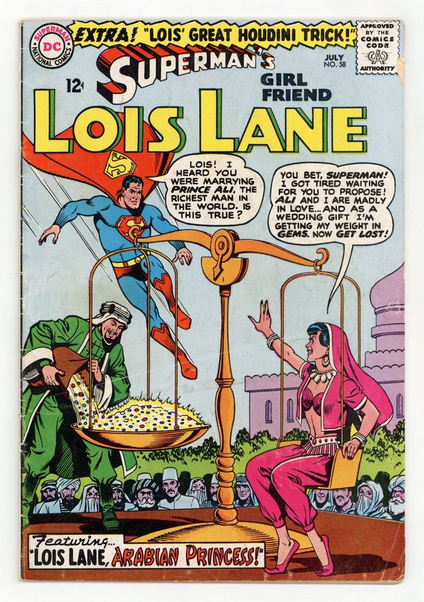 Cover art by Kurt Schaffenberger. Lois Lane's Great Houdini Trick!, script by Otto Binder, art by Kurt Schaffenberger; Lois sets out to expose a Swami and ends up finding a mobster in hiding. Binky Shows "How to Make New Friends!", art by Bob Oksner. Lois Lane, Spy-Hunter, script by Otto Binder, art by Kurt Schaffenberger; Lois tracks down a spy ring at a circus. Rocky and Bullwinkle Cheerios ad. The Captive Princess!, script y Otto Binder, art by Kurt Schaffenberger; Lois is lost in a sandstorm and stumbles into a small Arabian country where Prince Alie wants her to be his bride. Rocky and Bullwinkle star in a one-page Cheerios ad. 36 Pages, Full Color. Cover price $0.12.