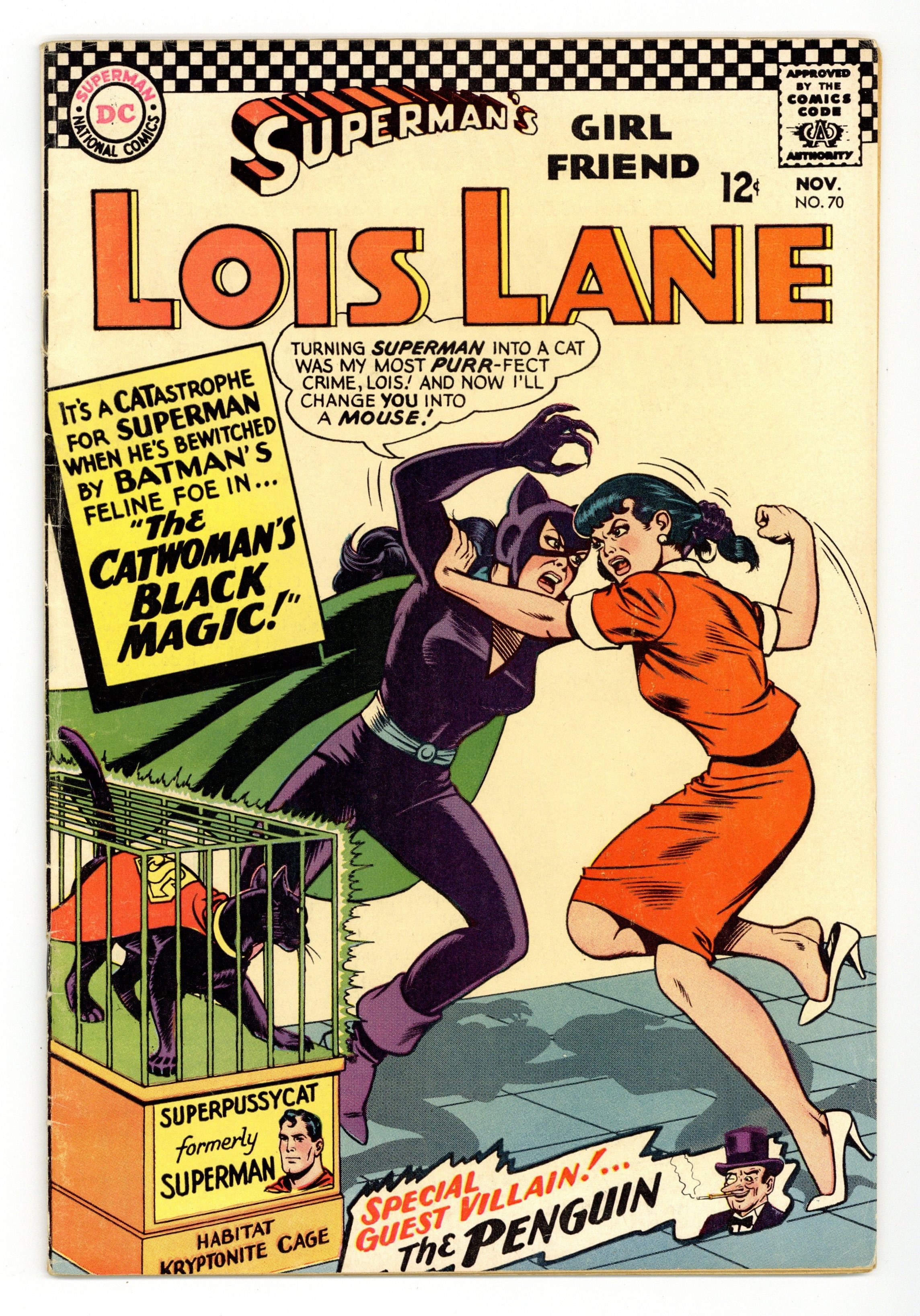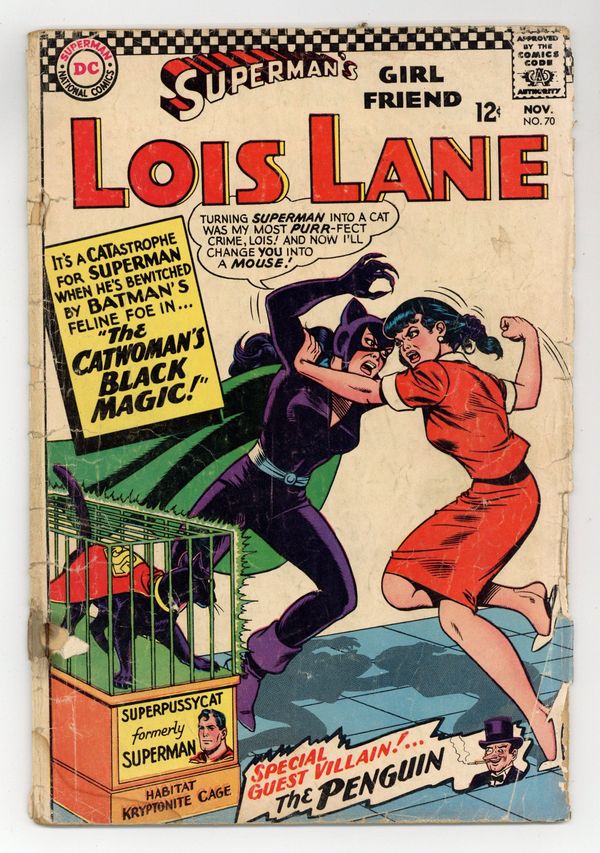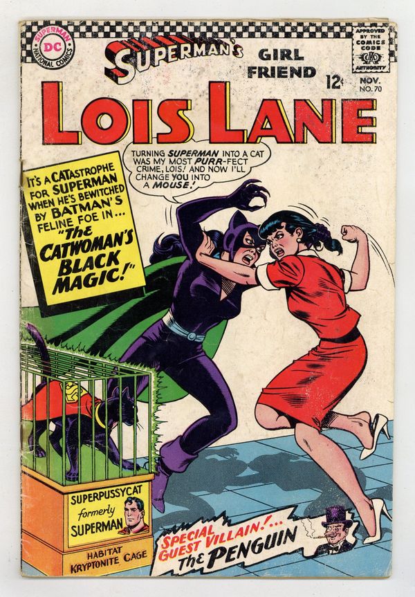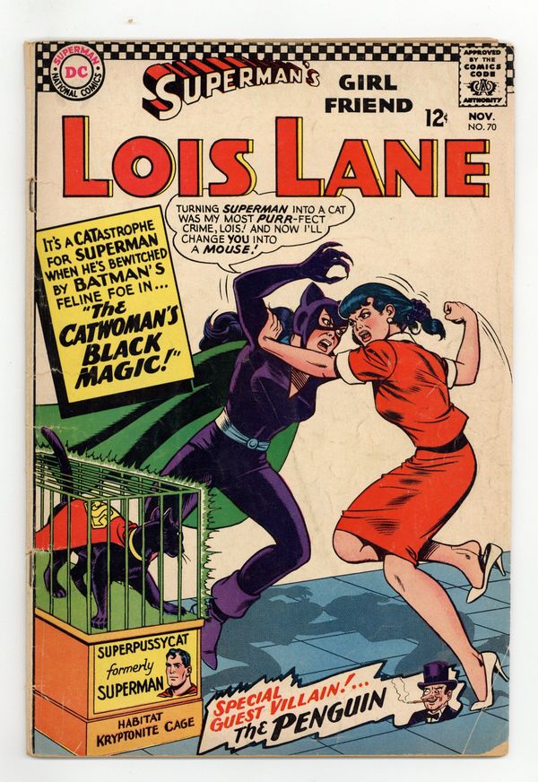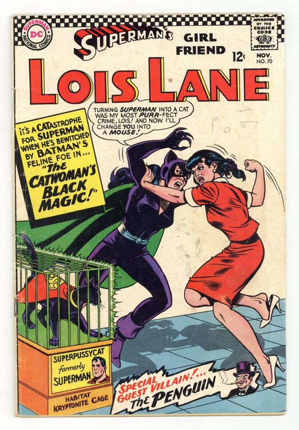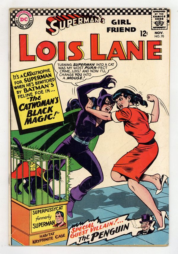 1st Silver Age appearance of Catwoman (see next issue for 2nd appearance & Detective Comics for #369 for 3rd appearance). Cover art by Kurt Schaffenberger. The Catwoman's Black Magic! [Part I], script by Leo Dorfman, art by Kurt Schaffenberger; When the Penguin escapes from prison, Lois tries to track him down but she is kidnapped by Catwoman instead, who hypnotizes her into acting as the villainess's double. House ad for Plastic Man #1. The Catwoman Gets the Bird! (Part II), script by Leo Dorfman, art by Kurt Schaffenberger; The Penguin confronts Lois, thinking she's Catwoman, but Superman, Batman, and Robin show up to take the Penguin back to prison. Superman's Cat-astrophe! (Part III); Catwoman takes Lois's place and tricks Superman into taking her to her lair, where she uses Circe's magic wand to turn him into a cat. Magic Photo Kit featuring Batman and Robin, pencils by Carmine Infantino, inks by Joe Giella. House ad for Justice League of America #48. GI Joe Club ad, art by Irv Novick. 36 Pages, Full Color. Cover price $0.12.