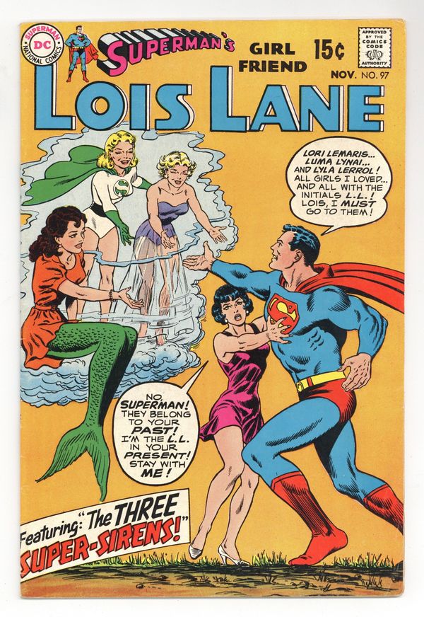 Tags: Superman$18.75Cover pencils by Curt Swan, inks by Murphy Anderson. The Three Super-Sirens! [Part I], pencils by Irv Novick, inks by Mike Esposito; Clark and Lois investigate a sea monster sighting, and arrive to find Lori Lemaris sending it away by telepathy. Part II The Lure of the Three Loreleis!; After both Lyla Lerrol and Luma Lynai appear and remind Superman of their past love, Lois figures out that the girls are all shapeshifting alien criminals from the planet Durla who are trying to drive Superman mad. The Mystery of Skull Island, script by Robert Bernstein, art by Kurt Schaffenberger; Perry has Clark and Lois disguise themselves as a butler and maid in order to spy on Hollywood movie star Carlos Floyd. Peg humor page by Henry Boltinoff. 36 Pages, Full Color. Cover price $0.15.