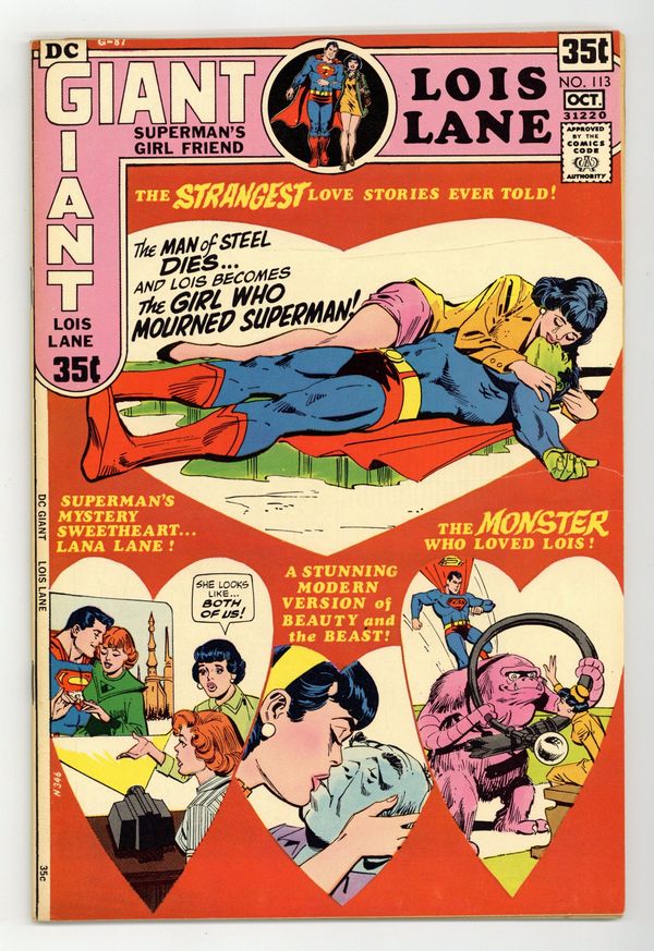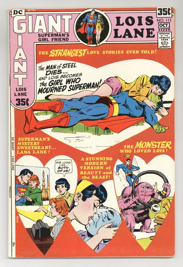 Cover pencils by Curt Swan (top illustration) and Kurt Schaffenberger (bottom three illustrations), inks by Dick Giordano. The Unknown Superman!, art by Kurt Schaffenberger; Dr. Drolic has a machine that will find the greatest unknown person in a given category' Lois uses it to find the greatest unknown super-person which leads her to Strong Bear. The Secret of Strong Bear! (Part II); Lois learns the truth about Strong Bear. The Monster Who Loved Lois Lane!, script by Edmond Hamilton, art by Kurt Schaffenberger; A science experiment gone wrong releases a creature from another dimension that is infatuated with Lois and jealously fights Superman. The Return of Lois' Monster Sweetheart!, script by Edmond Hamilton, art by Kurt Schaffenberger; Lois and Jimmy go to Herko's dimension to try to stop him from waiting for Lois; She convinces Jimmy to court Herko's neighbor Zagga to make him jealous. The Girl Who Mourned for Superman!, script by Leo Dorfman, art by Kurt Schaffenberger. Superman's Romance with Lana Lane!, pencils by Curt Swan, inks by George Klein. Two-page excerpt from an unpublished Golden Age Flash story, script by Robert Kanigher, art by Joe Kubert. 68 Pages, Full Color. Cover price $0.35.