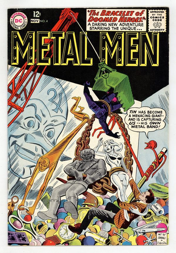 Cover pencils by Ross Andru, inks by Mike Esposito. Bracelet of Doomed Heroes!, script by Bob Kanigher, pencils by Ross Andru, inks by Mike Esposito; Tin is kidnapped by alien robots. 36 pgs. $0.12. Cover price $0.12.