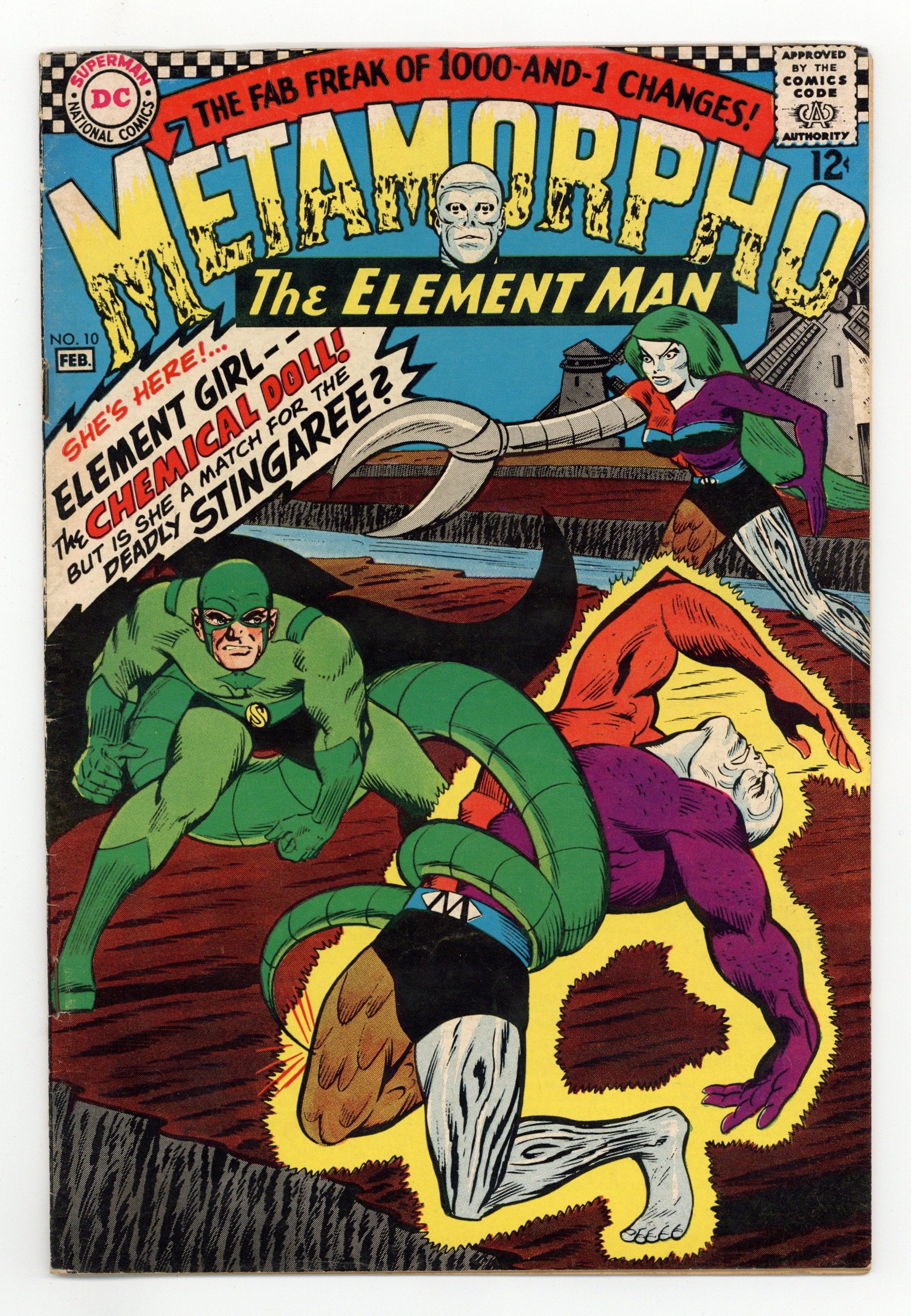 Origin & 1st appearance of Element Girl. Cover pencils by Sal Trapani, inks by Charles Paris. The Sinister Snares of Stingaree!, script by Bob Haney, pencils by Sal Trapani, inks by Charles Paris; Element Girl stops the wedding of Rex and Sapphire to ask Metamorpho's help in stopping Stingaree; Metamorpho and Element Girl discover Stingaree's plan. 36 pgs. $0.12. Cover price $0.12.