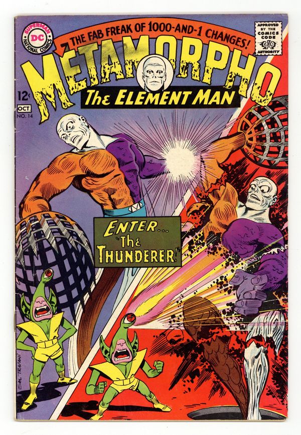 Cover art by Sal Trapani. Enter the Thunderer!, script by Bob Haney, pencils by Sal Trapani, inks by Charles Paris; Neutrog attacks a school and Metamorpho goes to confront him. Metamorpho is shot into space after becoming contaminated in his fight with Neutrog. 36 pgs. $0.12. Cover price $0.12.