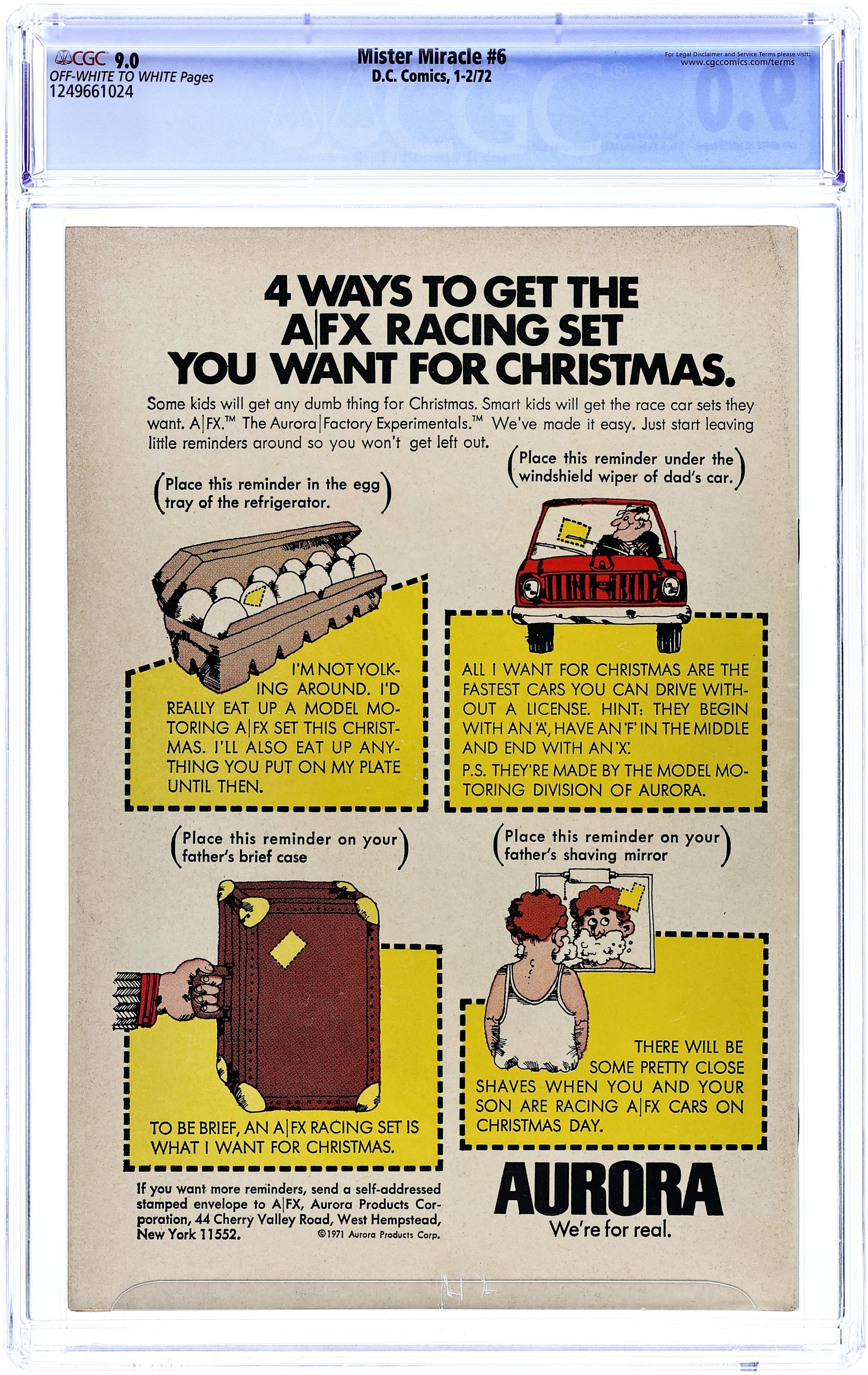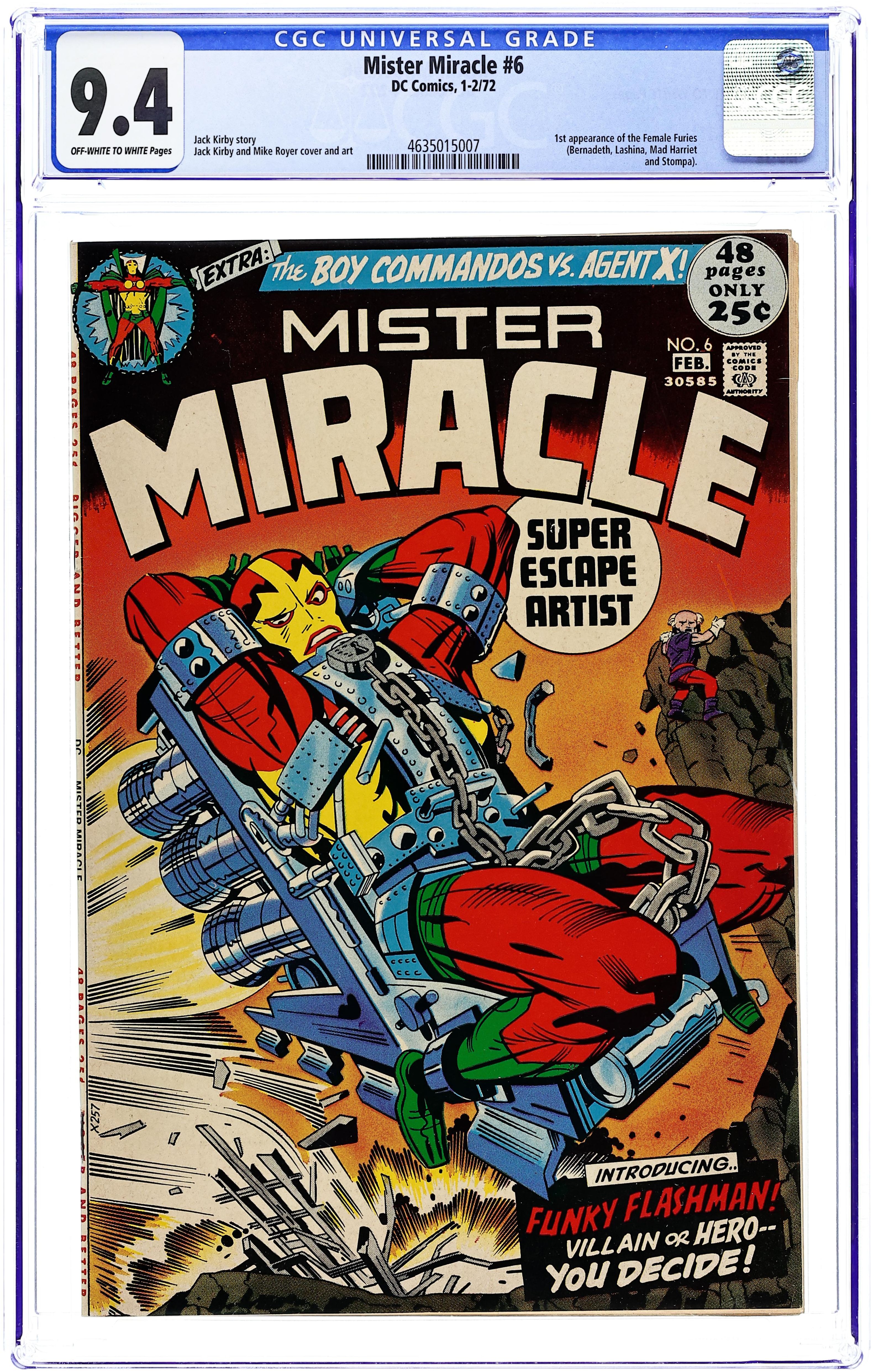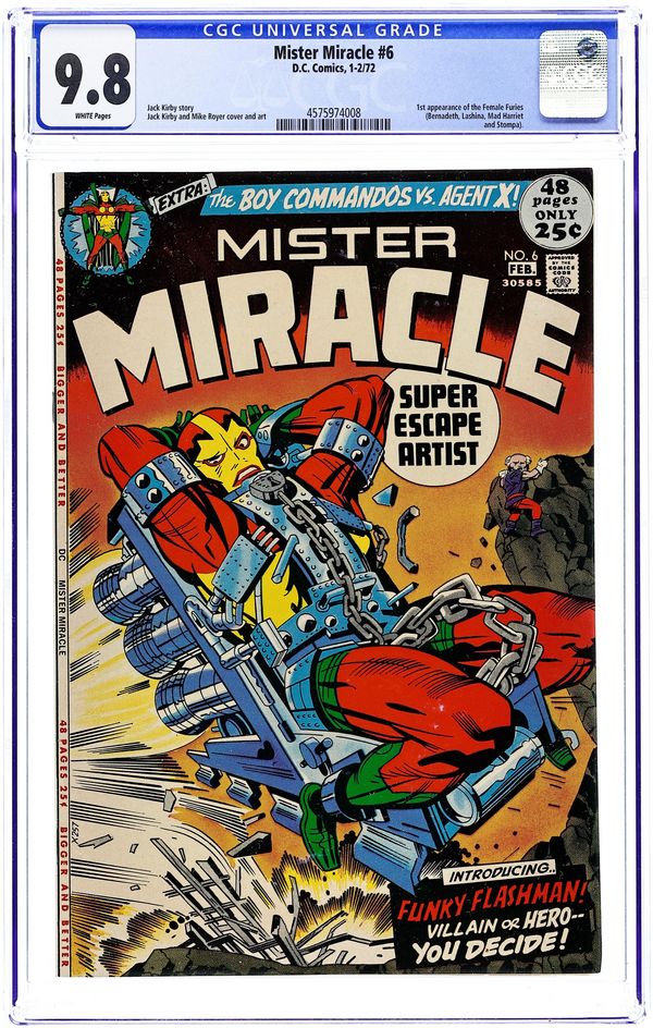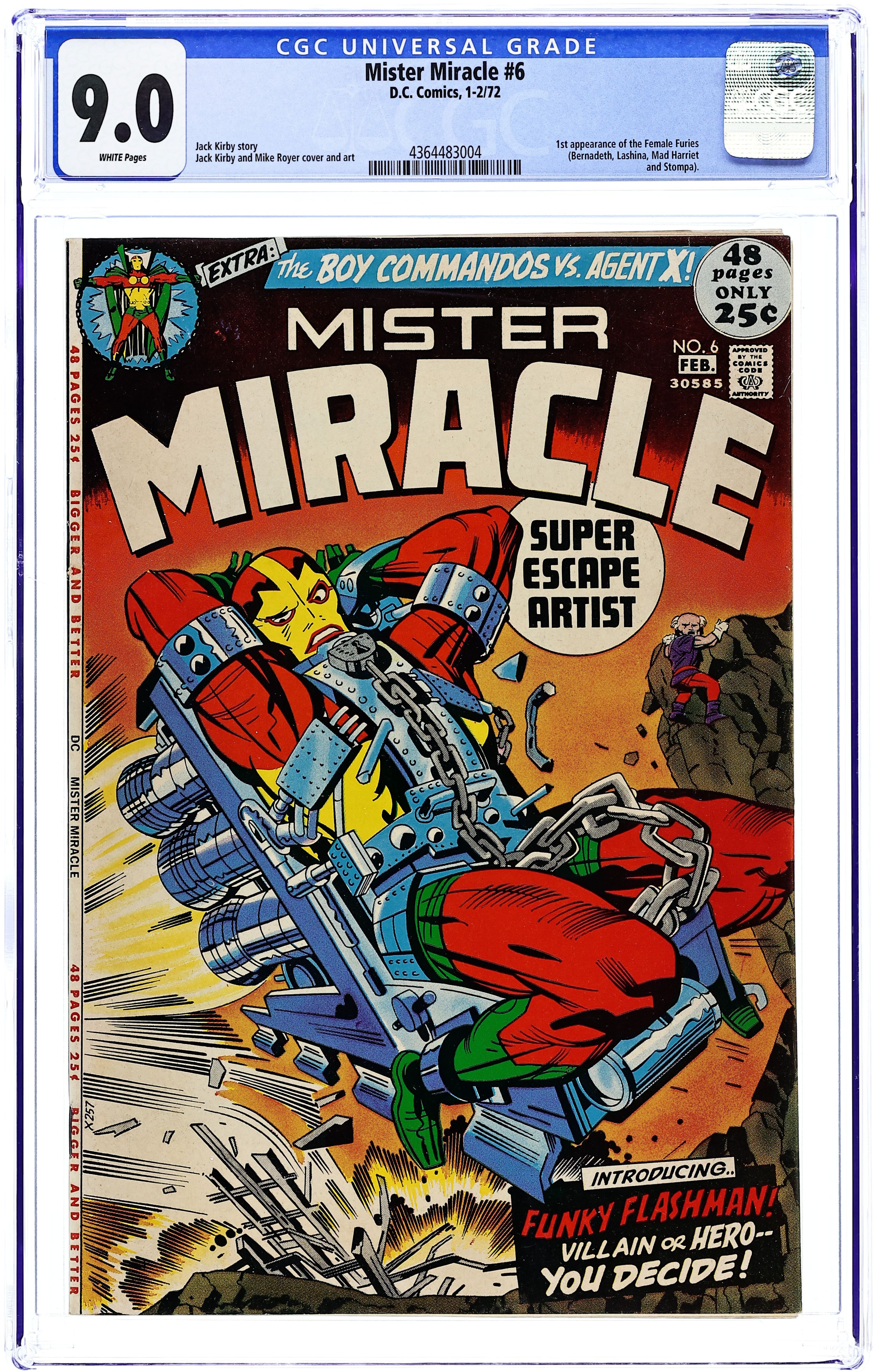 "Wait for Godot." Mister Miracle faces Funky Flashman and Houseroy, who appear to be modeled after Marvel's Stan Lee and Roy Thomas respectively, while Big Barda goes up against the Female Furies (making their first appearance). Script, pencils, and cover by Jack Kirby. Inks by Mike Royer. Cover price $0.25.