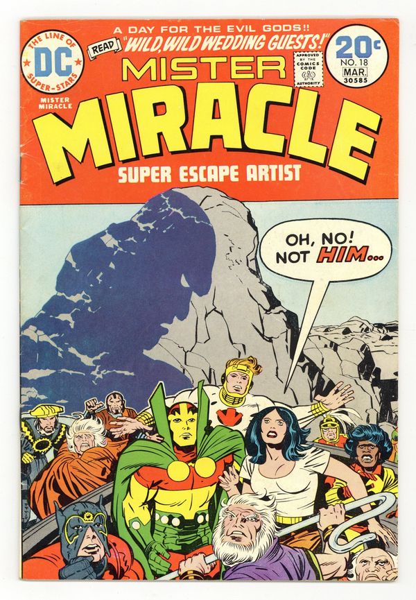 $6.10"Wild, Wild Wedding Guests." Scott "Mister Miracle" Free weds Big Barda and escapes a number of traps. Includes appearances by Darkseid, the Highfather, and other denizens of Apokolips. This is Kirby's last issue of the series, and it's a doozy. Script, pencils, and cover by Jack Kirby. Inks by Mike Royer. Cover price $0.20.