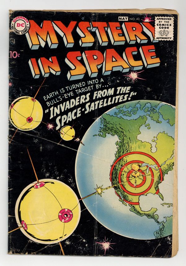 "Invaders From the Space-Satellites!" (pencils by Carmine Infantino?); "Charades on the Moon!"; "Menace of the Space-Nectar!" (pencils by Gil Kane); and "Planet of Doomed Earthmen!" Full-page ad for Challengers of the Unknown 1. Kane earth-in-distress cover. 36 Pages, Full Color. Cover price $0.10.